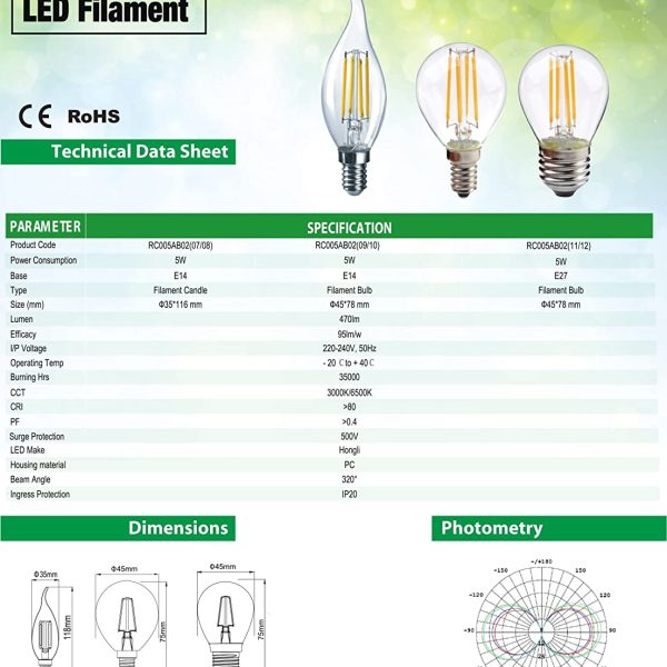 RENESOLA 5 WATT LED FILAMENT CANDLE BULB WITH TAIL BULB E14 WARM WHITE YELLOW LIGHT 2700K RN1010