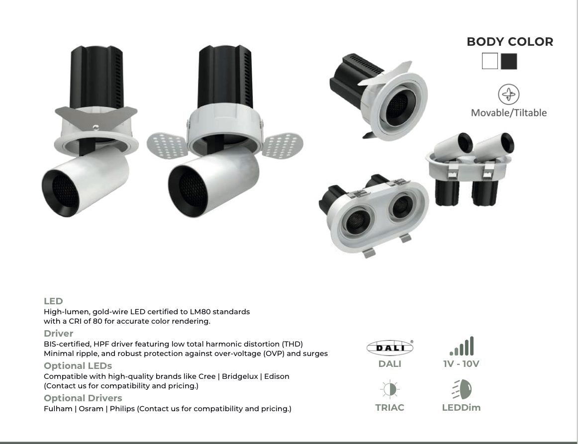 LEARC 2X12 watt 360 degree rotatable, tiltable, pull out type LED down light with CREE COB and top branded LED driver EP7167