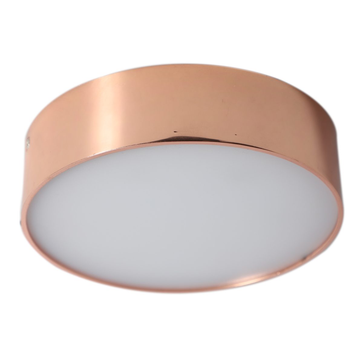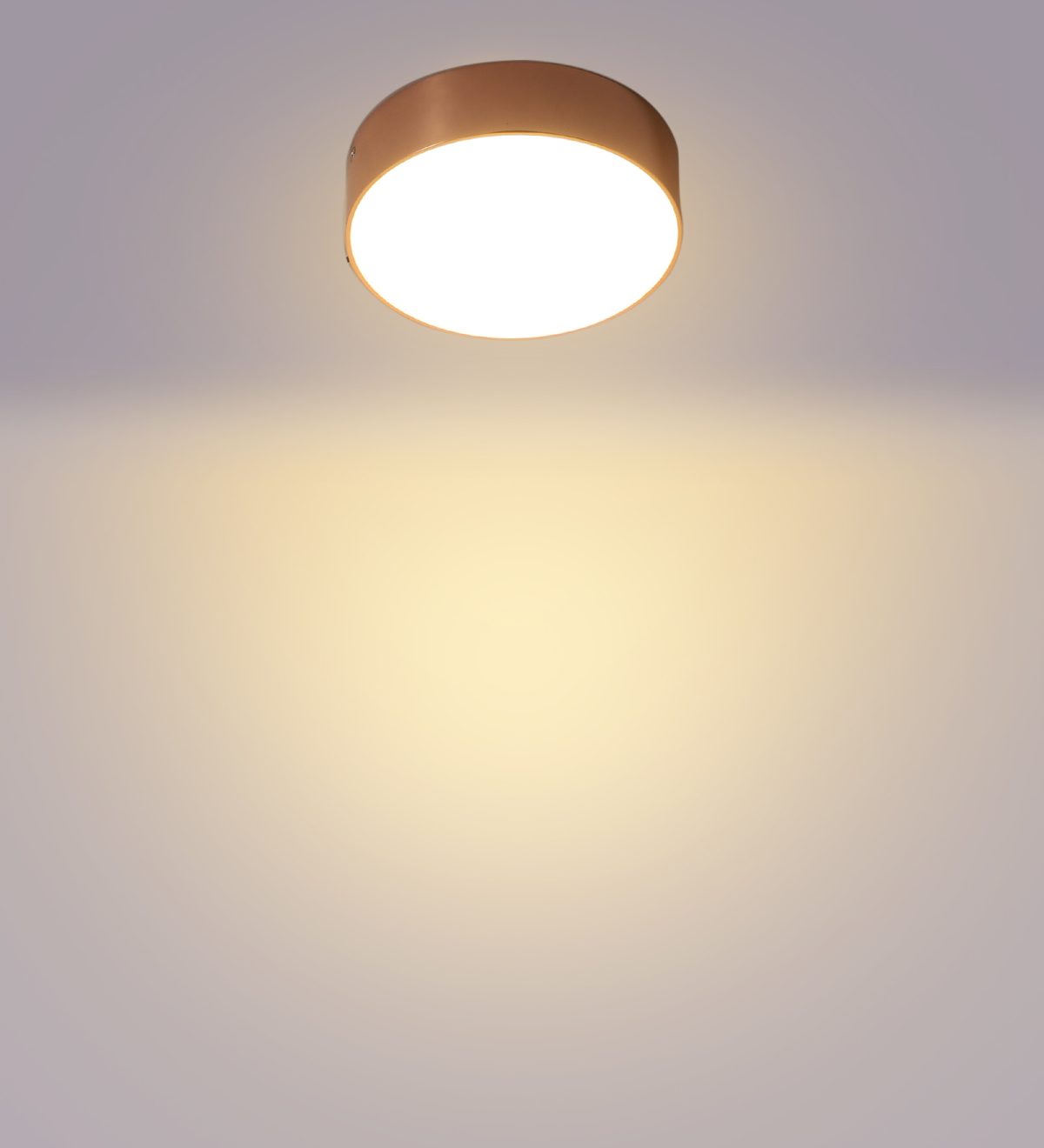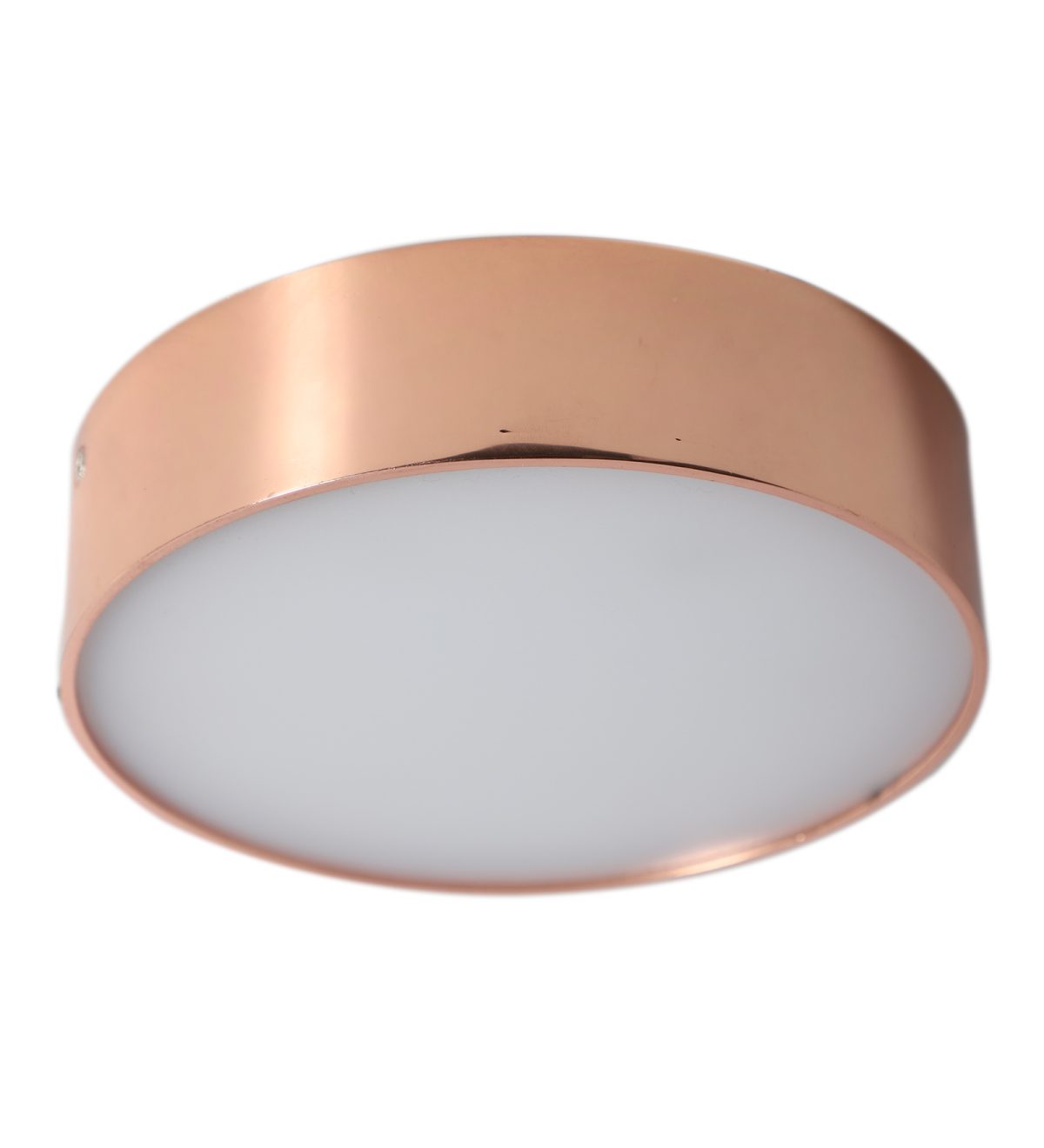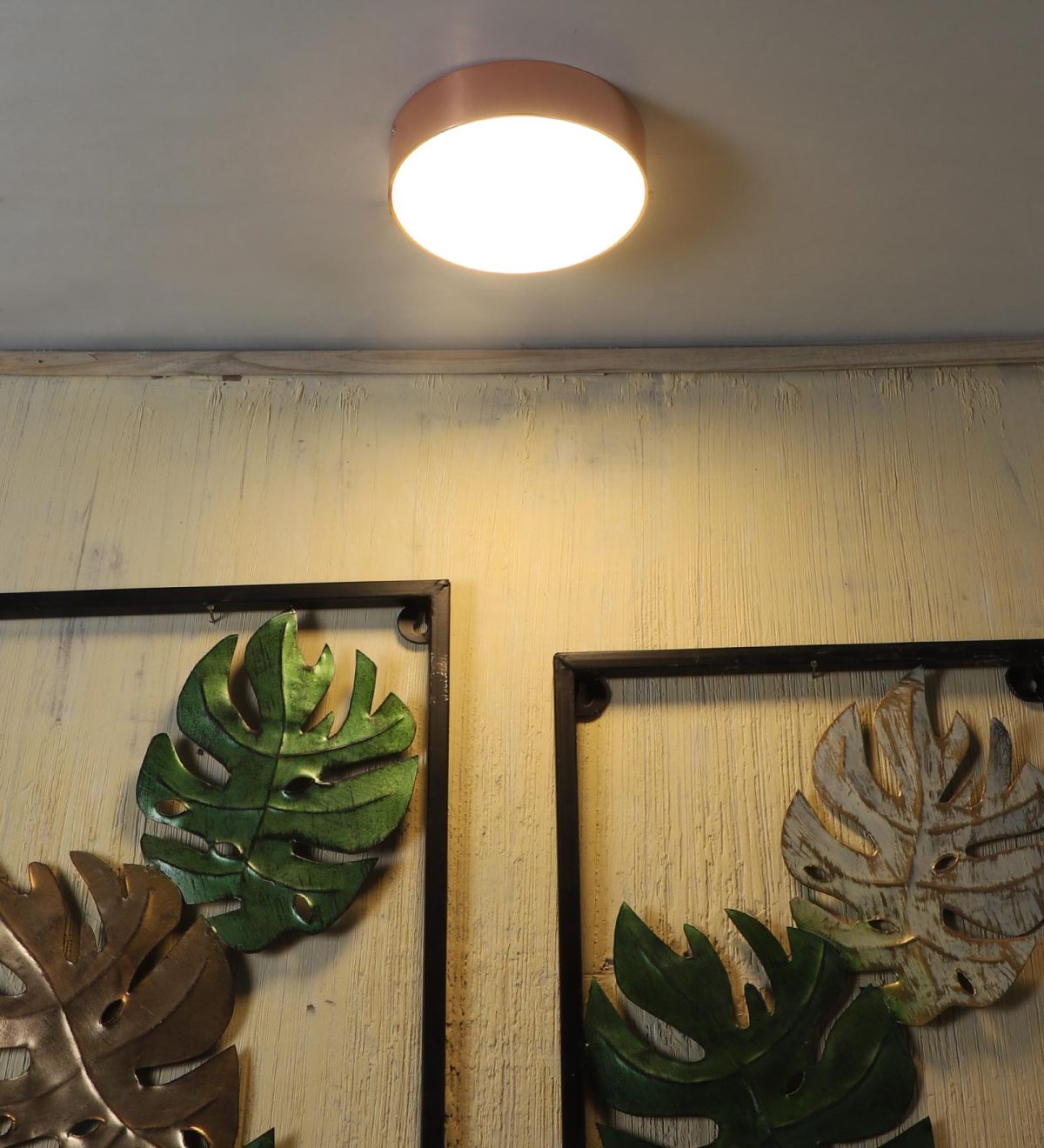 Copper finish round LED surface ceiling light with warm white (yellow) light output. Can be used both indoors and outdoors. Can be customised as per requirement in terms of body colour, colour of light output and wattage.