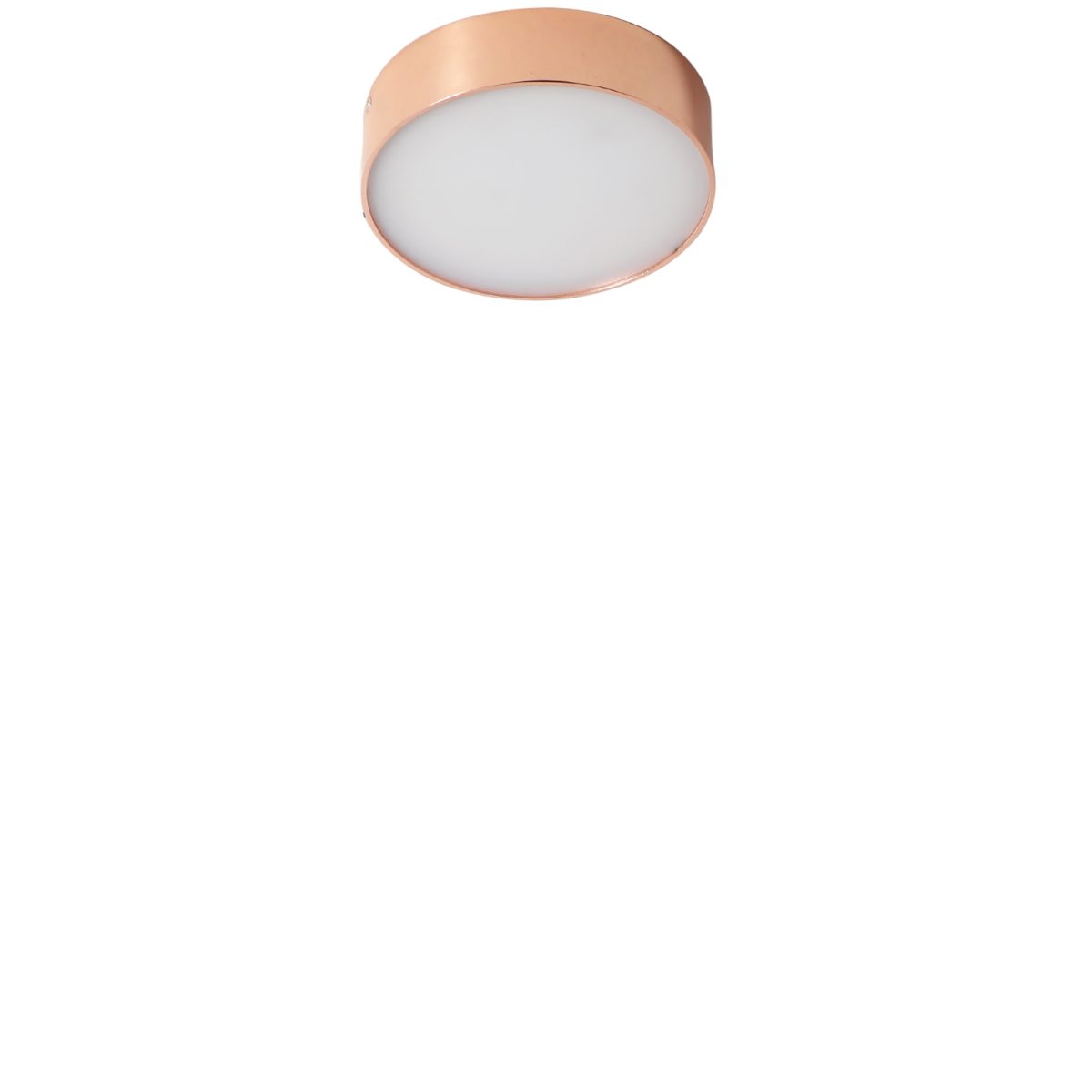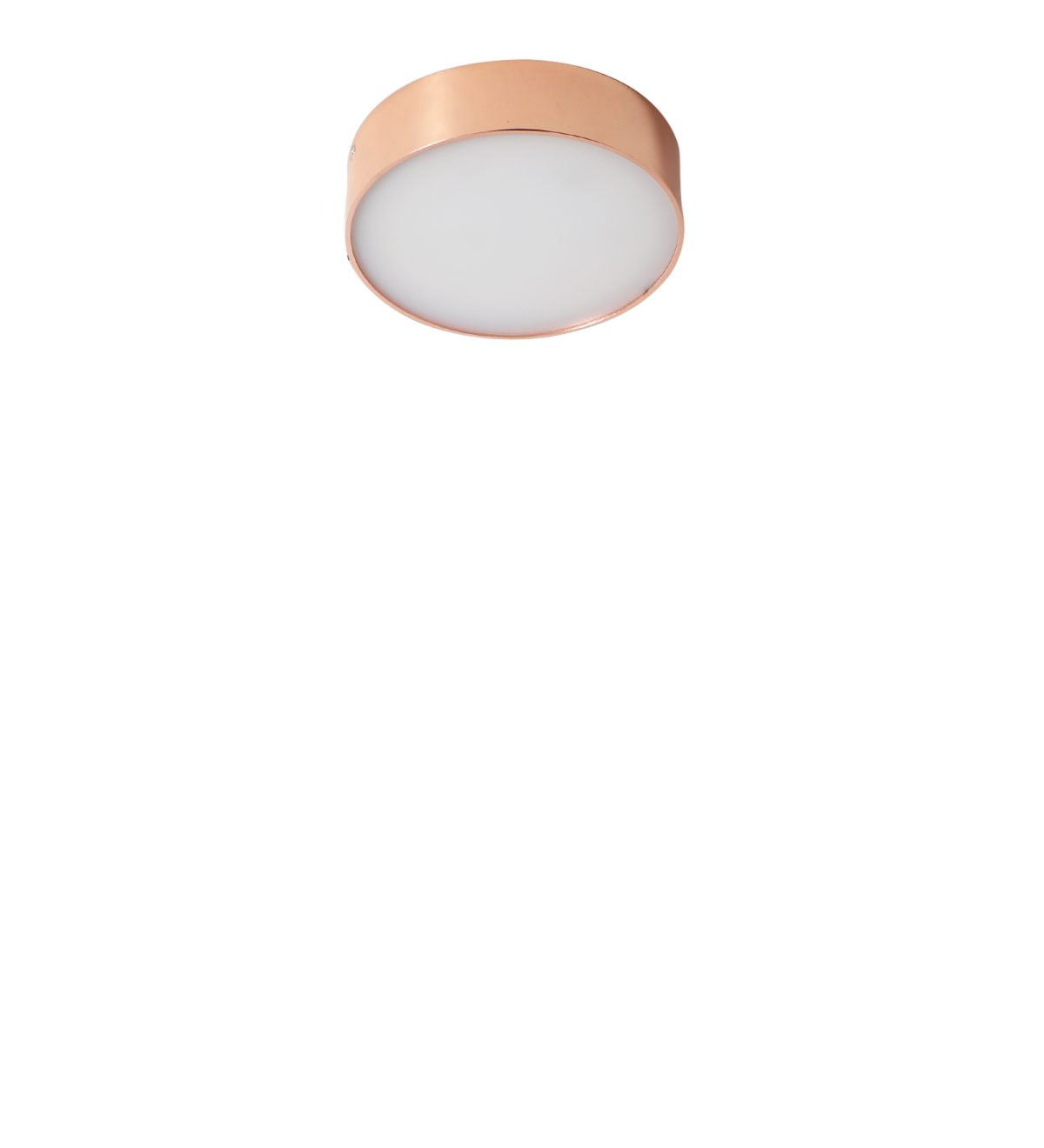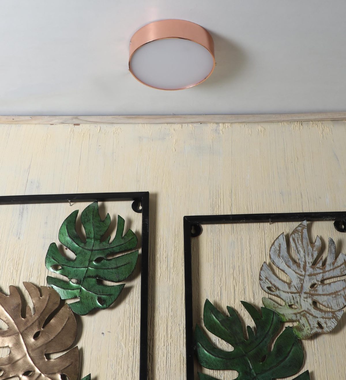 Copper finish round LED surface ceiling light with warm white (yellow) light output. Can be used both indoors and outdoors. Can be customised as per requirement in terms of body colour, colour of light output and wattage.