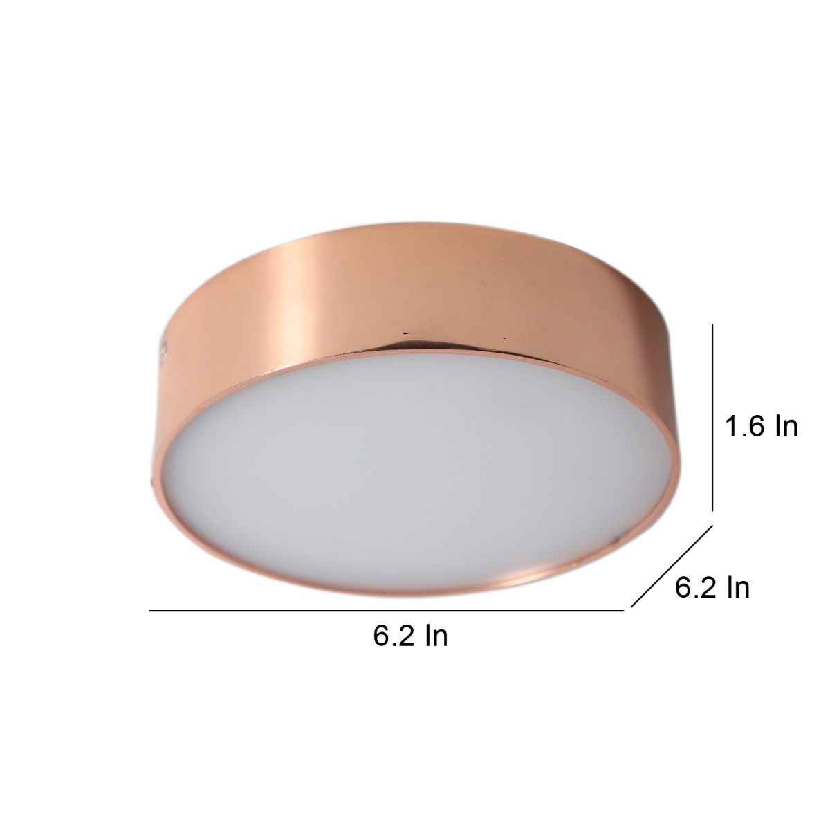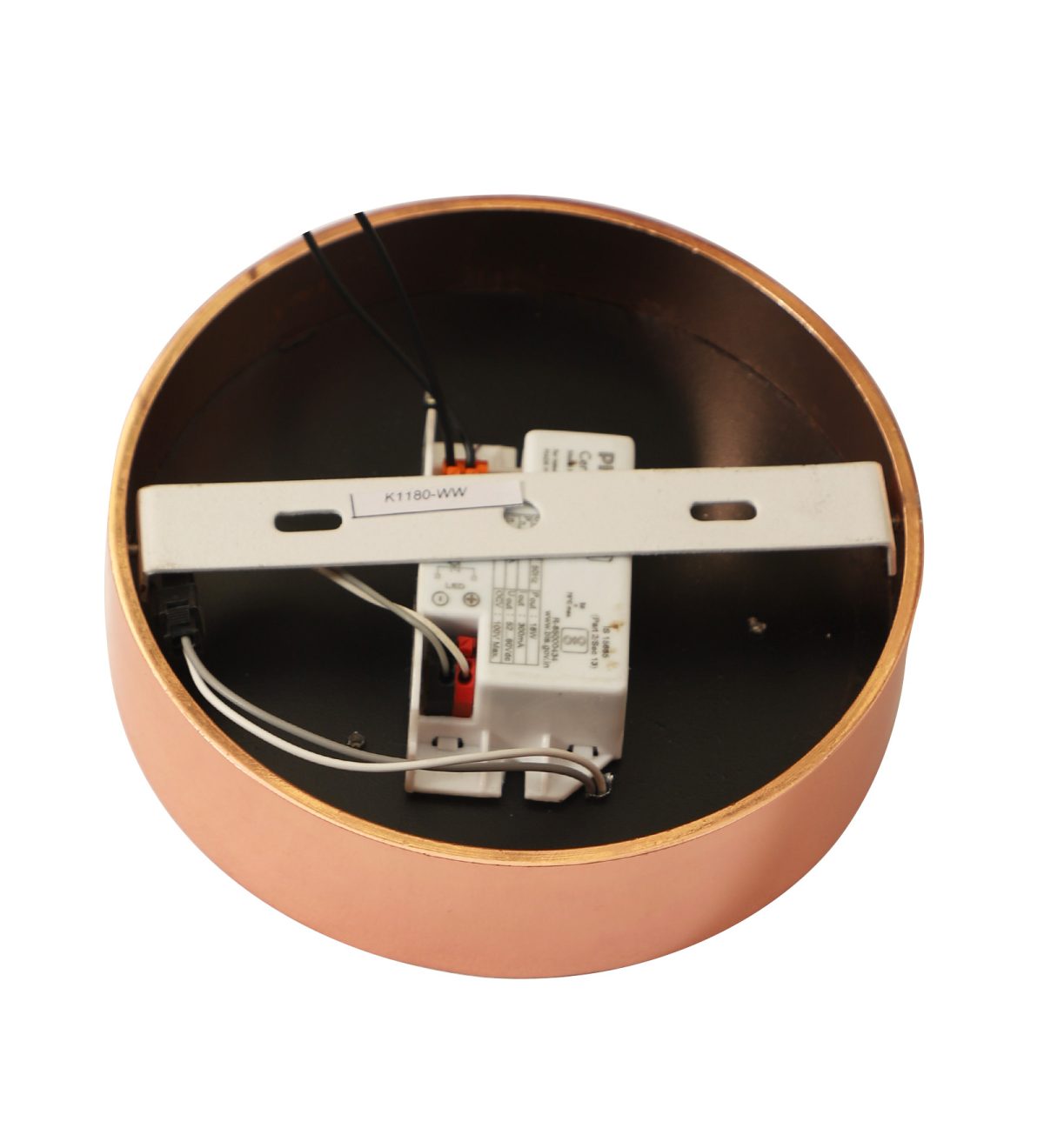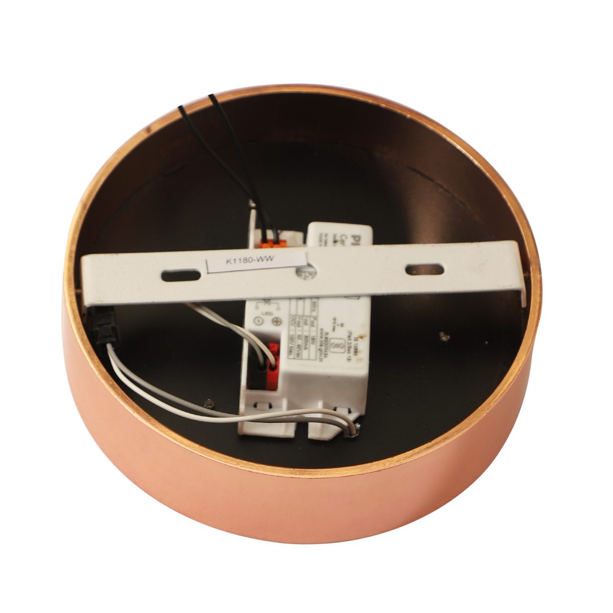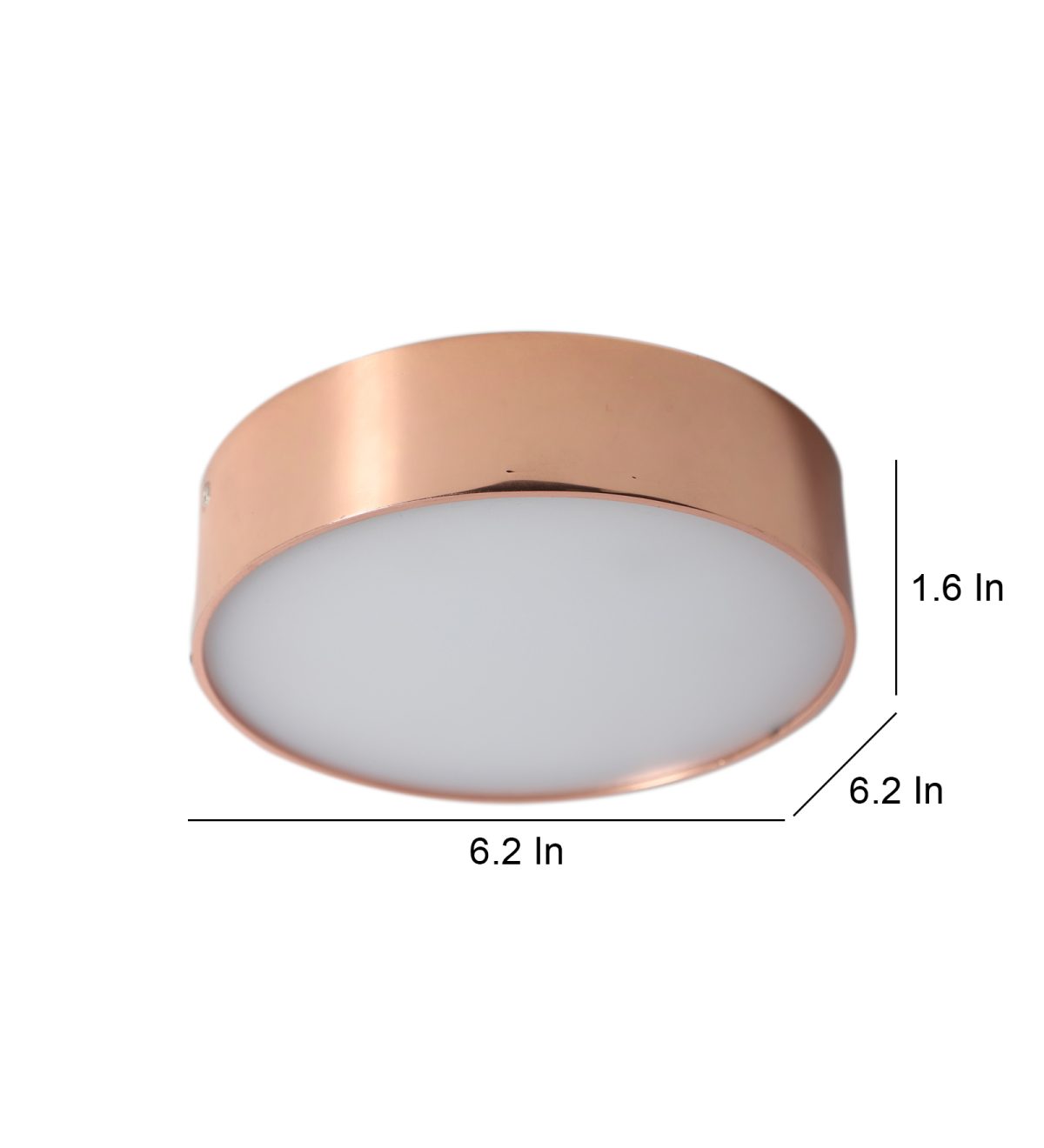 Copper finish round LED surface ceiling light with warm white (yellow) light output. Can be used both indoors and outdoors. Can be customised as per requirement in terms of body colour, colour of light output and wattage.