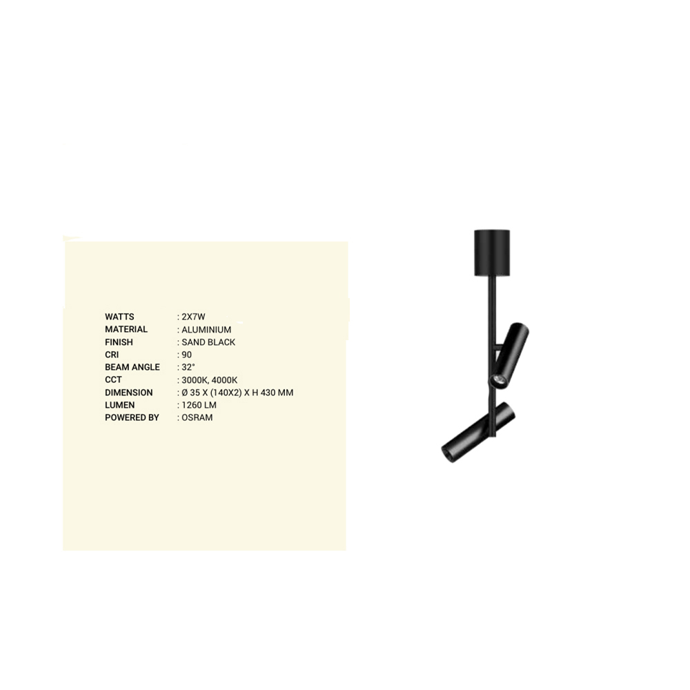 LEARC 2 head 2*7 watt black ceiling mounted adjustible focus light.