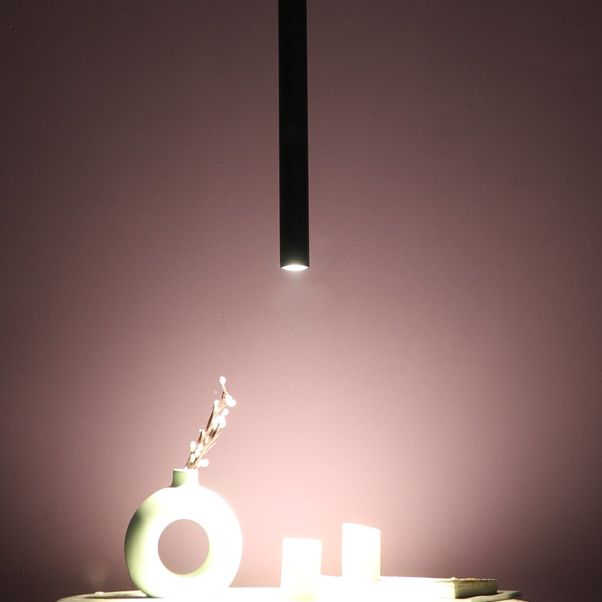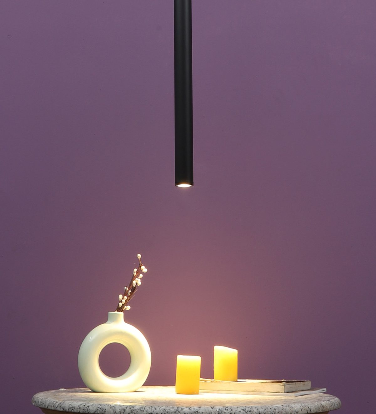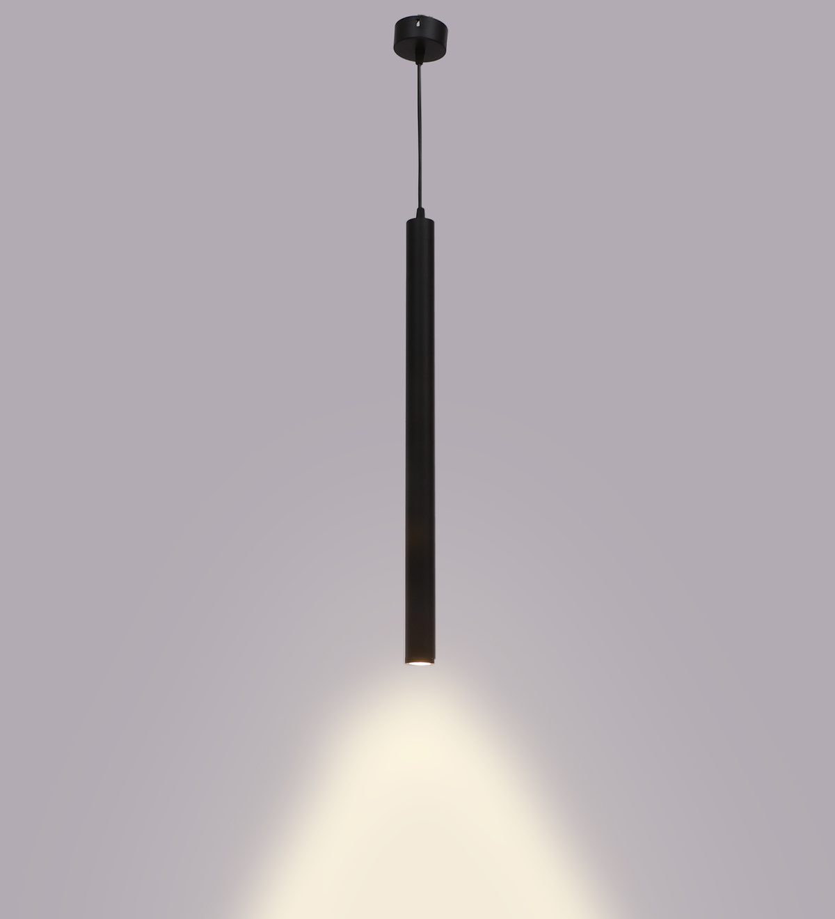 Black finish, sleek, modern, 12 watt LED hanging light having top branded LED and driver warm white (yellow) light output The suspension can be adjusted at time of installation to the desired height. Can be made available in a cluster of multiple quantities with round, square or rectangular base as per requirement . Application includes both residential and commercial premises wherever it matches with your interiors. Can be customized as per requirement in terms of finish, wattage, height, diameter.