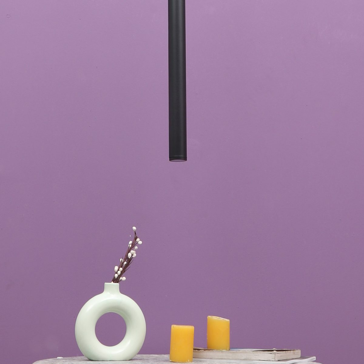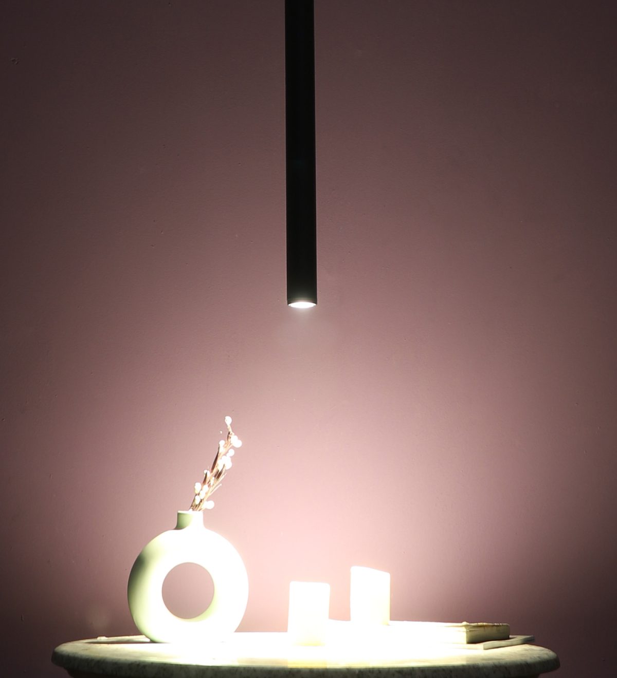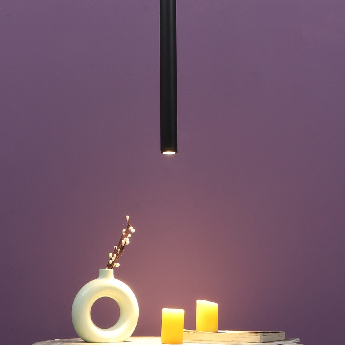 Black finish, sleek, modern, 12 watt LED hanging light having top branded LED and driver warm white (yellow) light output The suspension can be adjusted at time of installation to the desired height. Can be made available in a cluster of multiple quantities with round, square or rectangular base as per requirement . Application includes both residential and commercial premises wherever it matches with your interiors. Can be customized as per requirement in terms of finish, wattage, height, diameter.