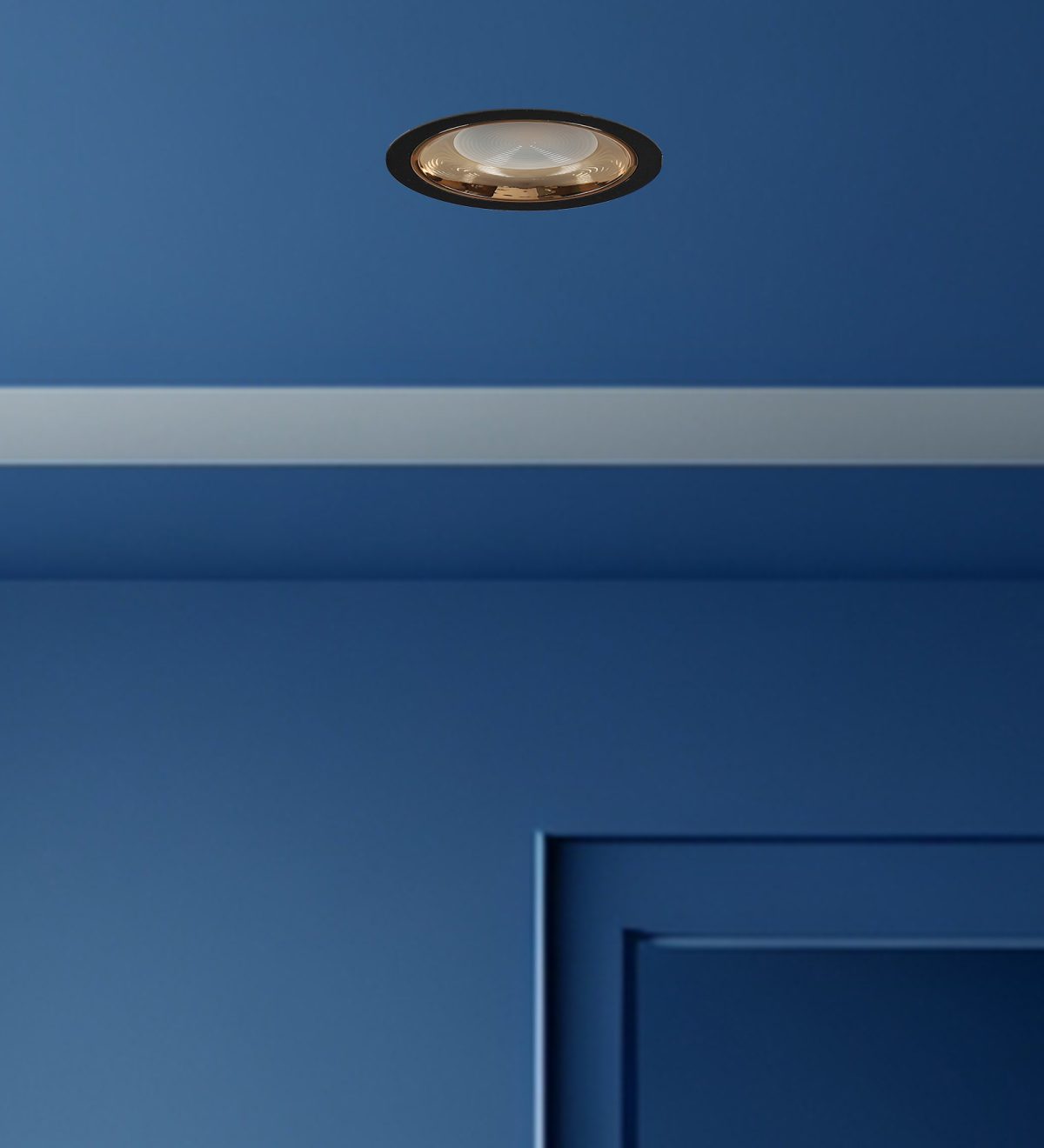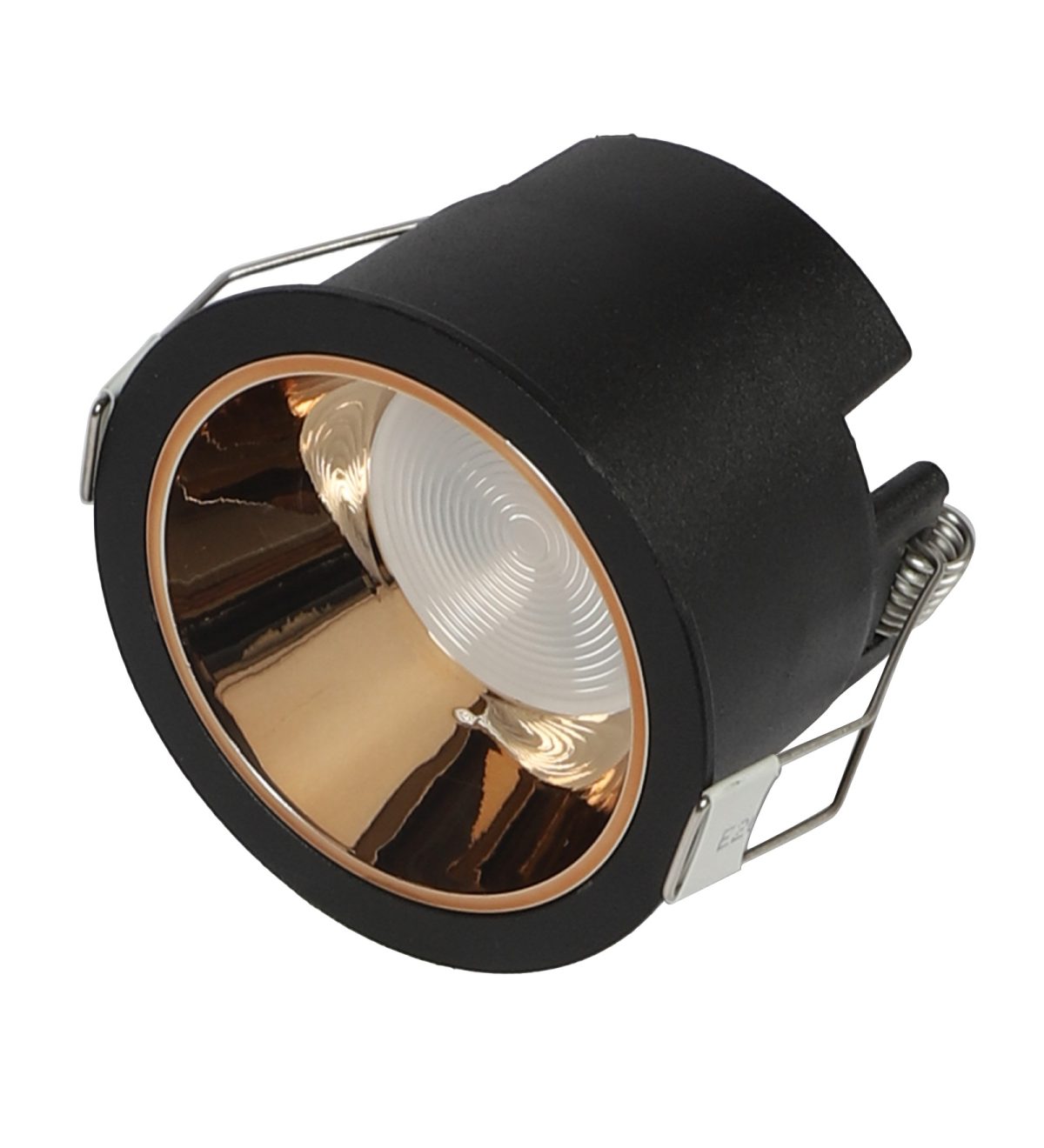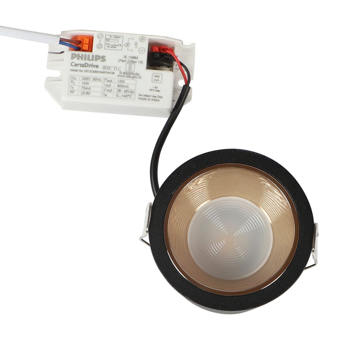 Powder coated black finish with rose gold reflector, aluminium die cast round 12W LED COB concealed ceiling light with top branded Bridgelux LED and Philips or equivalent LED driver. Application includes both indoor and outdoor ceilings. Available in 3000K, 4000K and 6000K ie warm white, nuetral white and white light output.