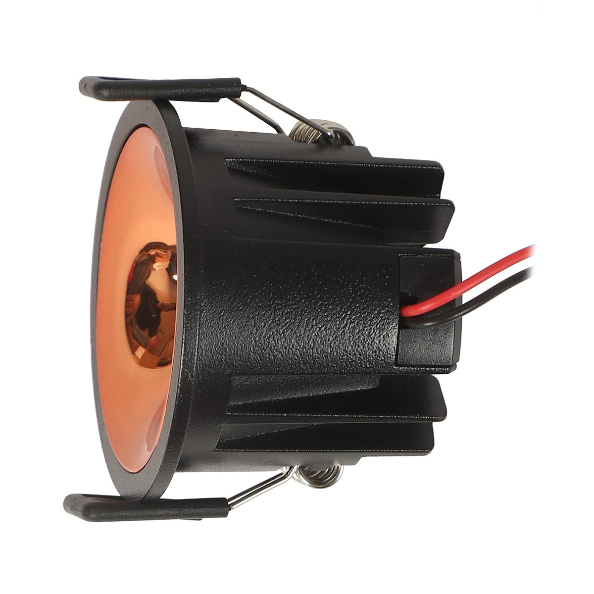 Powder coated black finish with rose gold reflector, aluminium die cast round 7W LED COB concealed ceiling light with top branded Bridgelux LED and Philips or equivalent LED driver. Application includes both indoor and outdoor ceilings. Available in 3000K, 4000K and 6000K ie warm white, nuetral white and white light output.