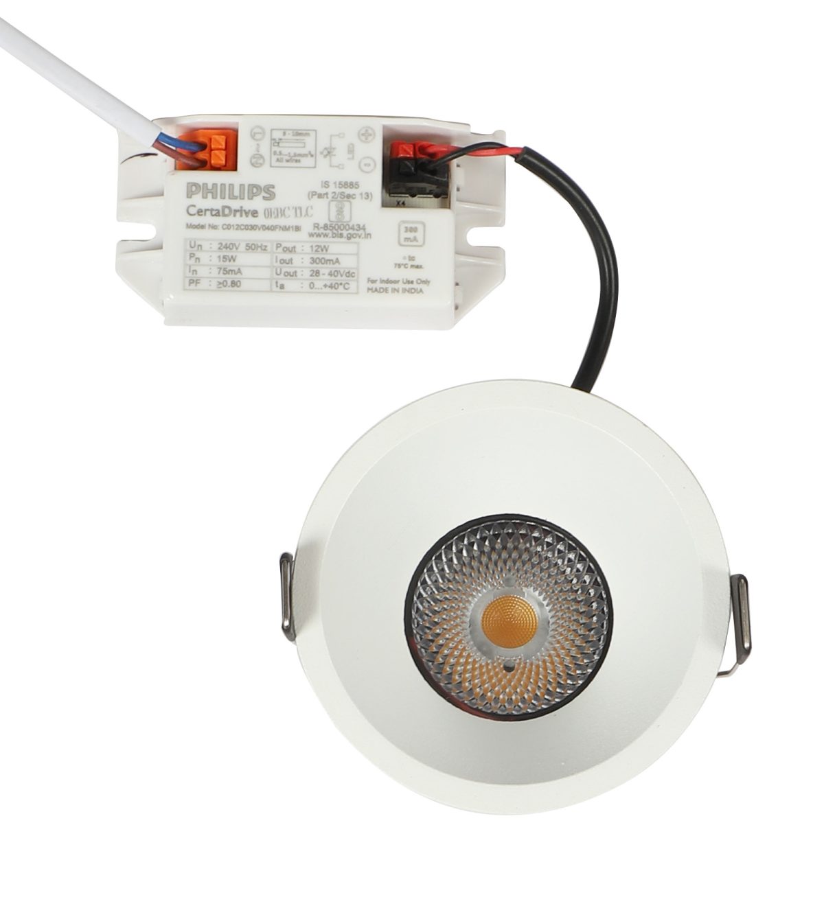 Premium powder coated heavy duty white finish, aluminium die cast round 12W anti glare LED COB concealed ceiling light with top branded Bridgelux LED and Philips or equivalent LED driver. Application includes both indoor and outdoor ceilings. Available in 3000K, 4000K and 6000K ie warm white, nuetral white and white light output.