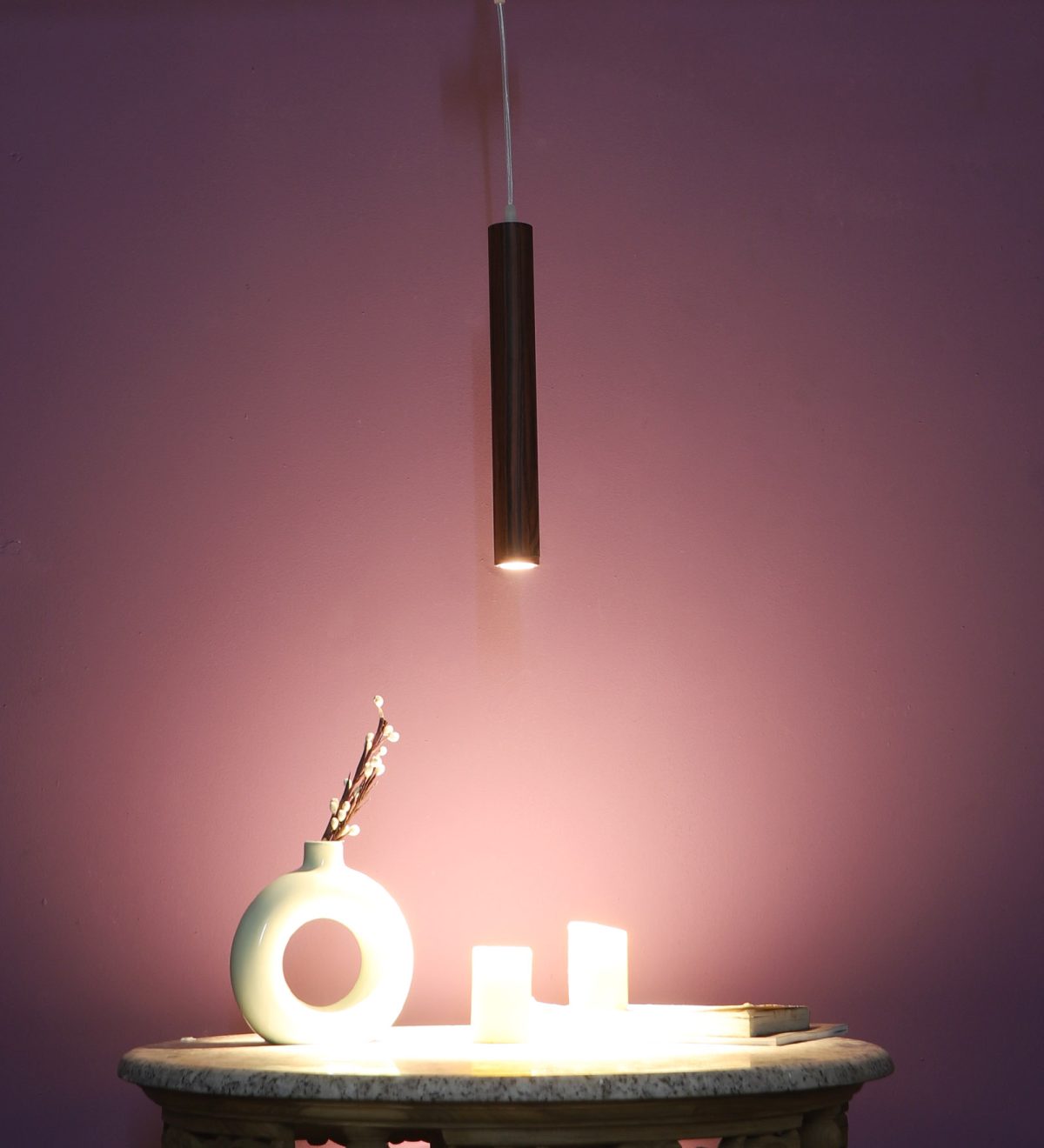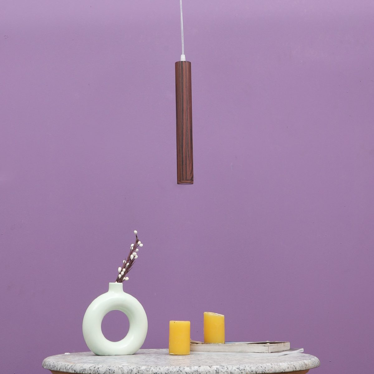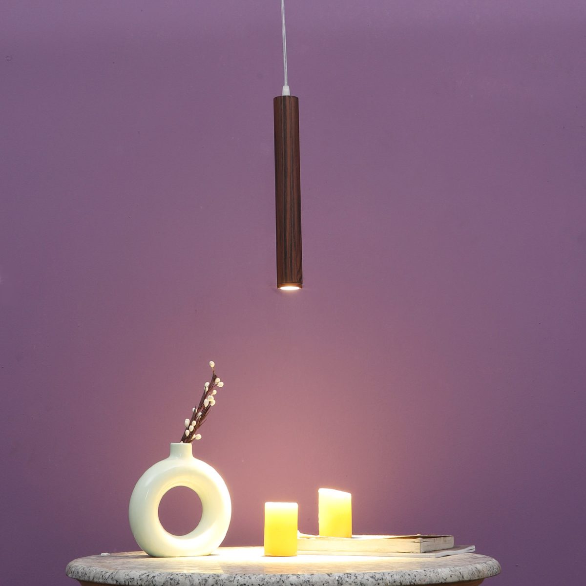 Brown premium wood finish, sleek, modern, 12 watt LED hanging light having top branded LED and driver warm white (yellow) light output The suspension can be adjusted at time of installation to the desired height. Can be made available in a cluster of multiple quantities with round, square or rectangular base as per requirement . Application includes both residential and commercial premises wherever it matches with your interiors. Can be customized as per requirement in terms of finish, wattage, height, diameter.
