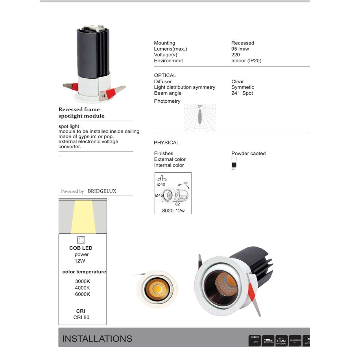 Aluminium die cast powder coated white finish 12 watt ultra thin architectural choice tiltable LED down light with CREE COB and top branded LED driver.
