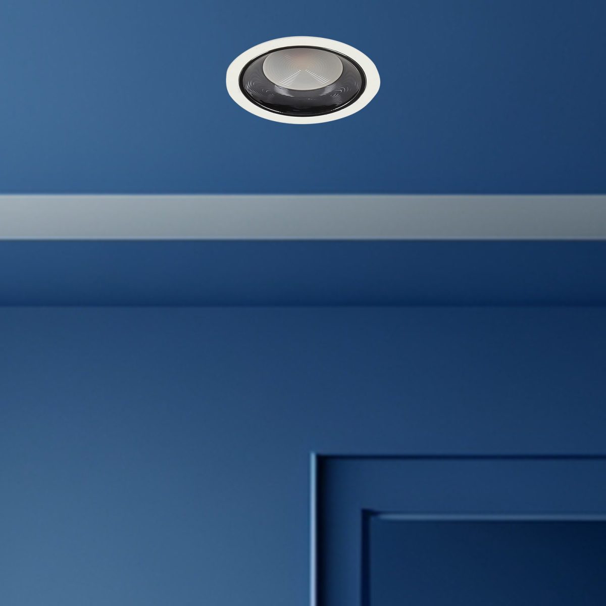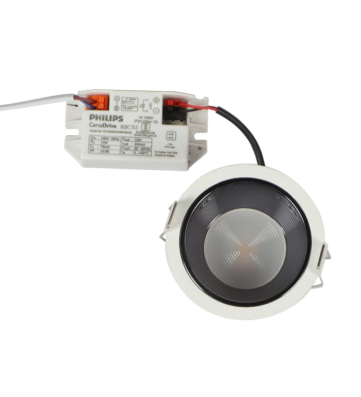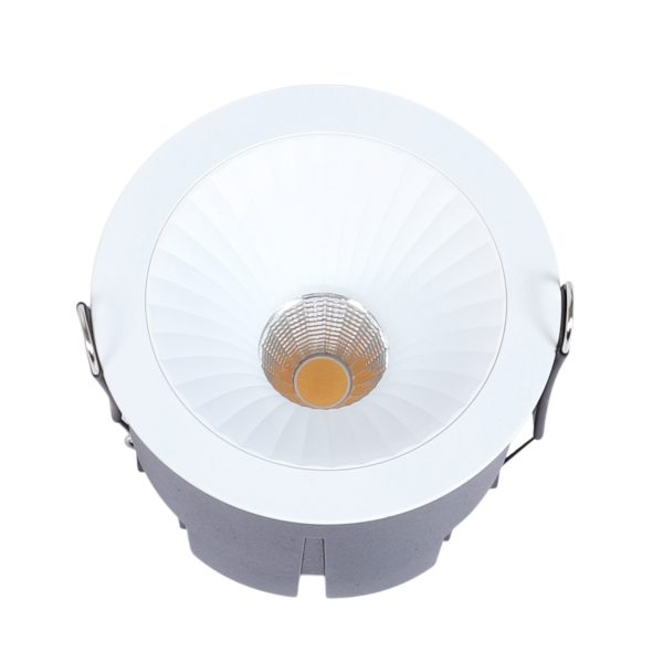 Powder coated white finish with black nickel reflector, aluminium die cast round 12W LED COB concealed ceiling light with top branded Bridgelux LED and Philips or equivalent LED driver. Application includes both indoor and outdoor ceilings. Available in 3000K, 4000K and 6000K ie warm white, nuetral white and white light output.