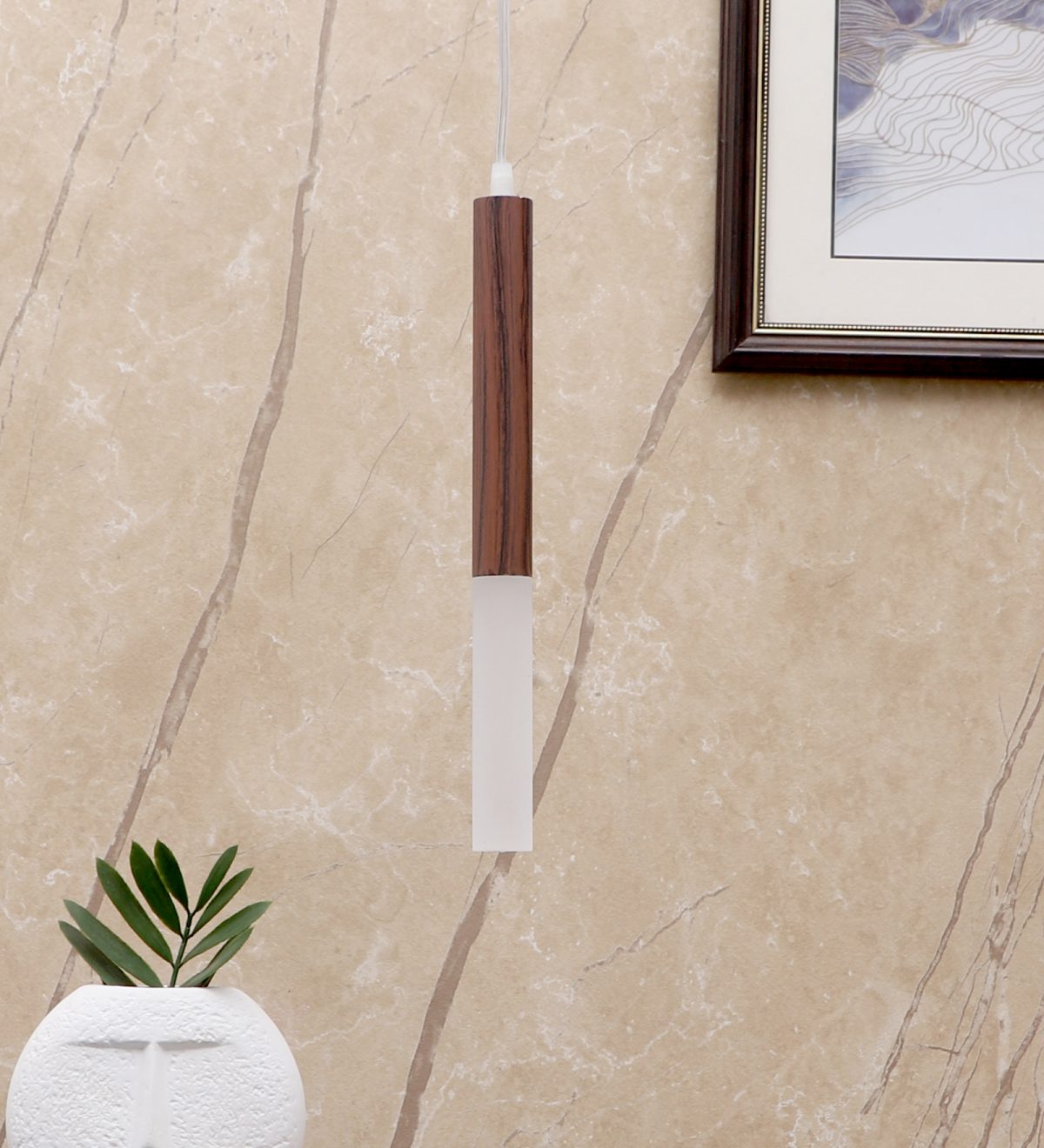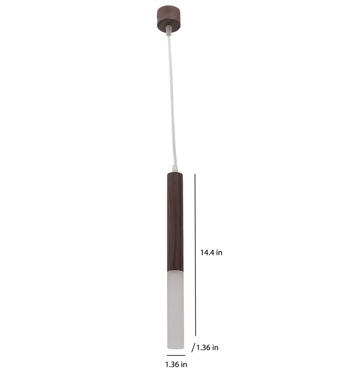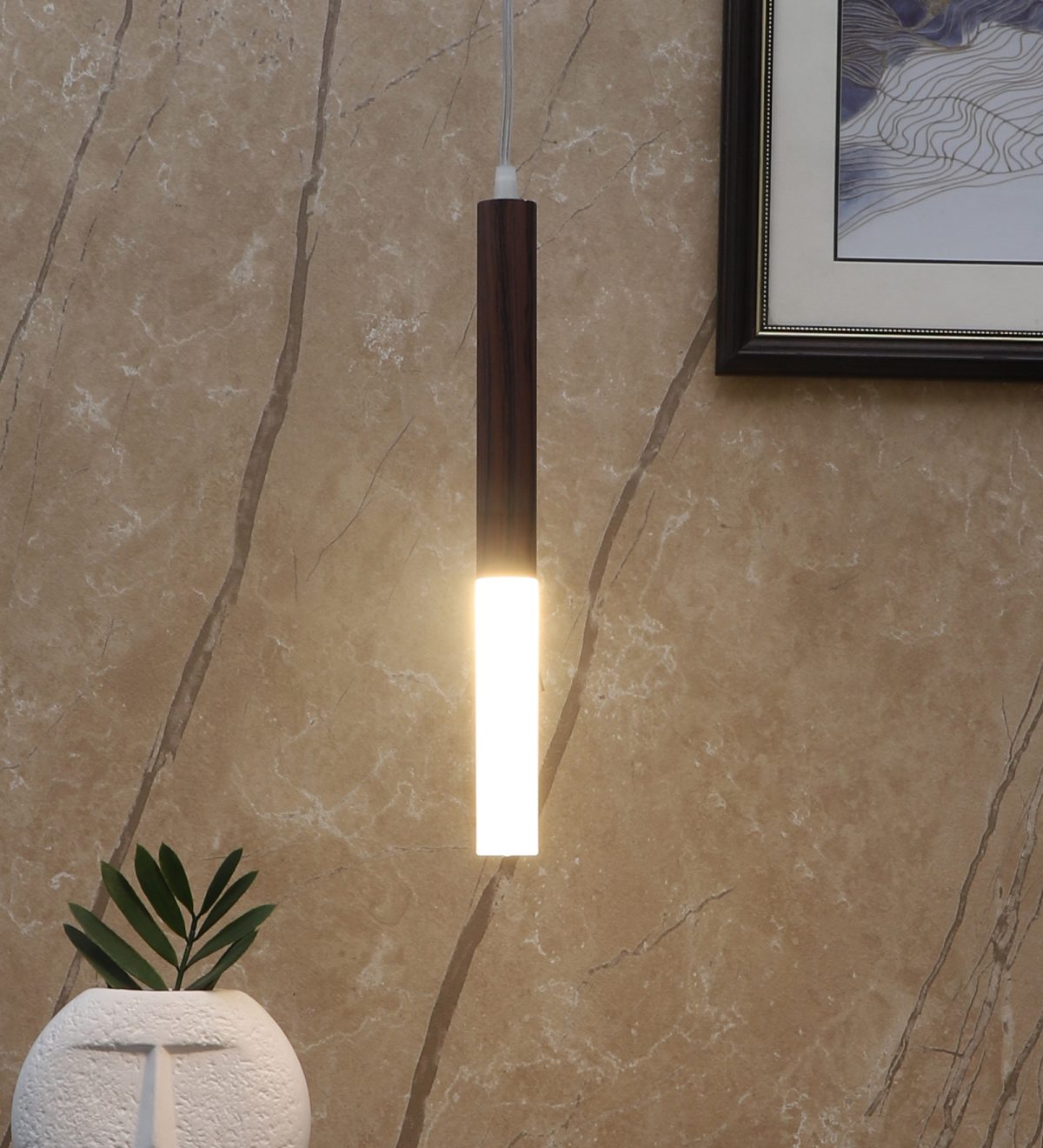 Brown wood finish, sleek, modern, 6 watt LED hanging light having top branded LED and driver warm white (yellow) light output The suspension can be adjusted at time of installation to the desired height. Can be made available in a cluster of multiple quantities with round, square or rectangular base as per requirement . Application includes both residential and comercial premises wherever it matches with your interiors. Can be customised as per requirement in terms of finish, wattage, height, diameter.