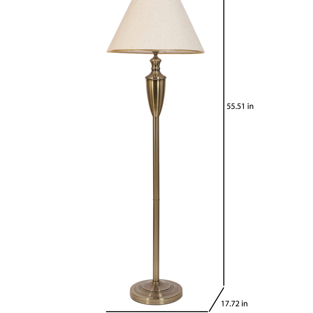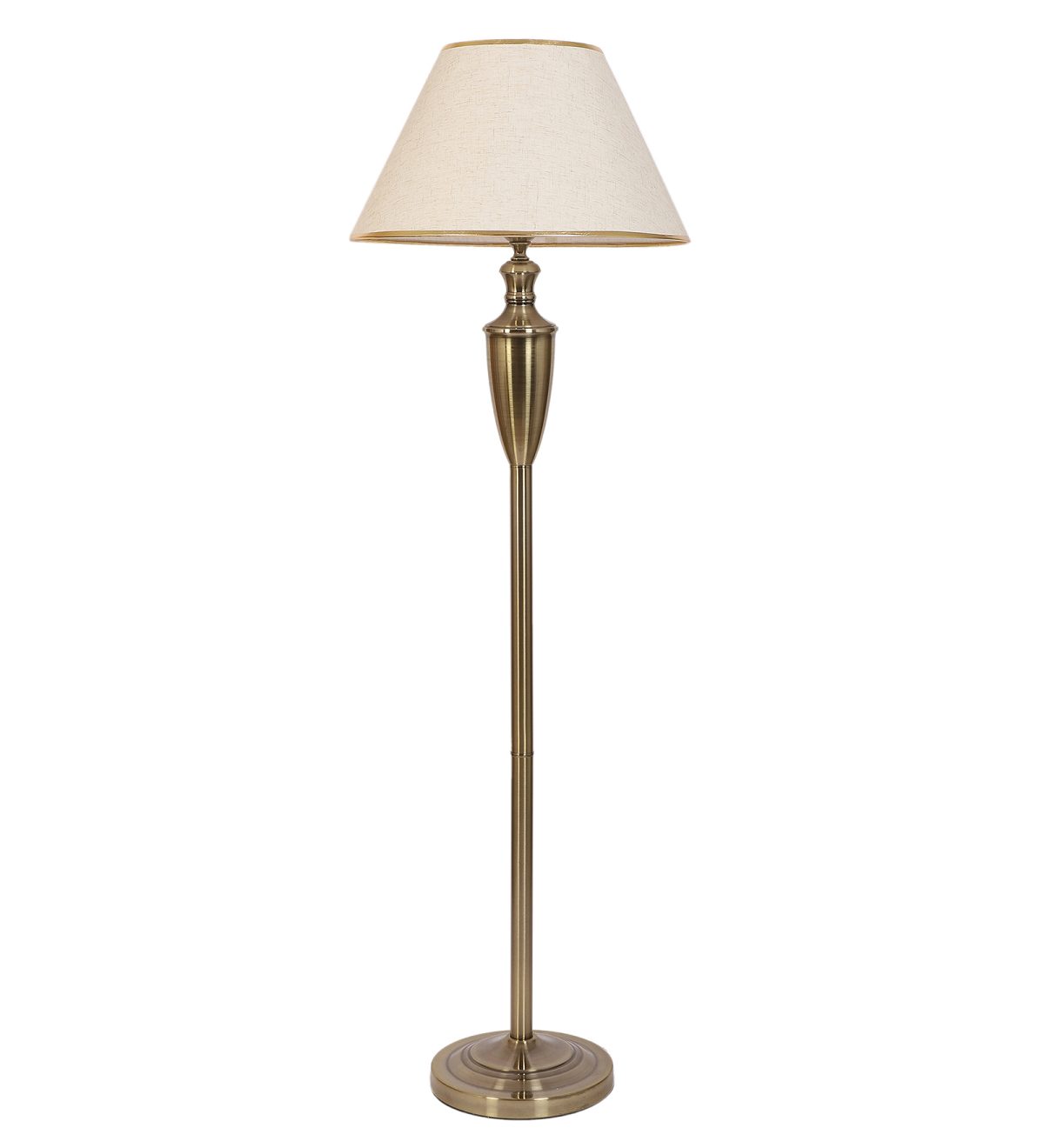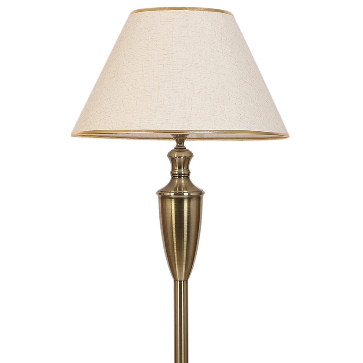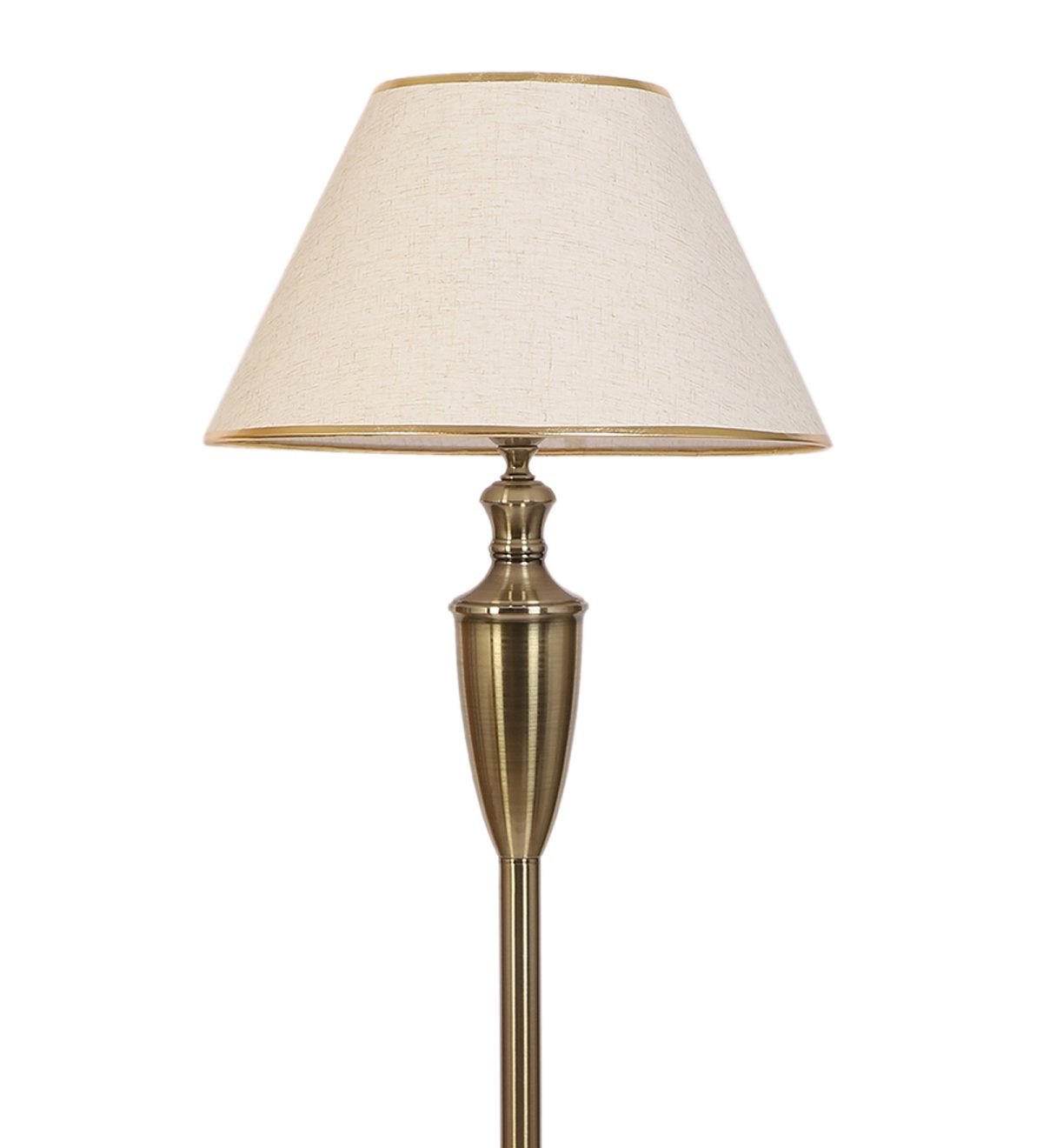 LEARC antique brass finish floor lamp with cream textured shade having golden border. LAMP NOT INCLUDED.