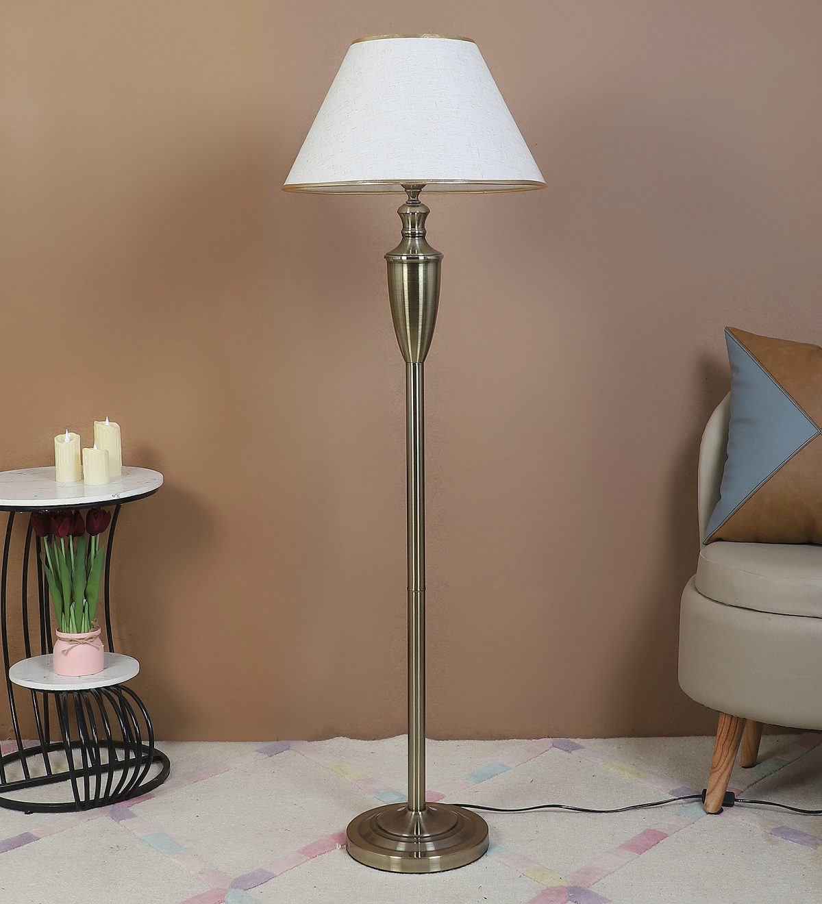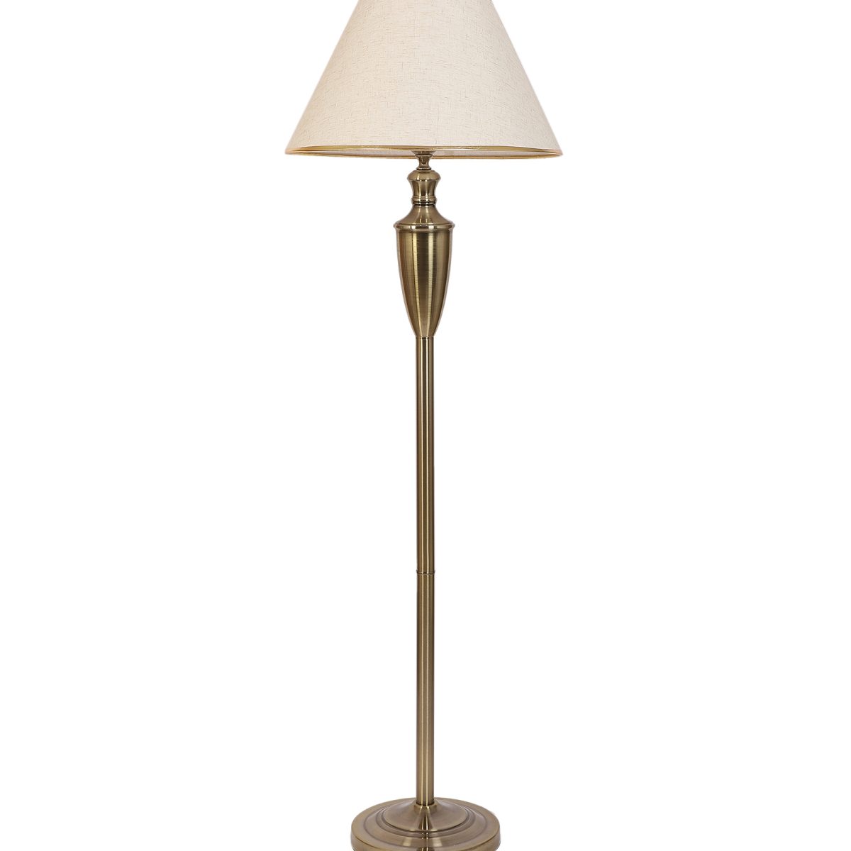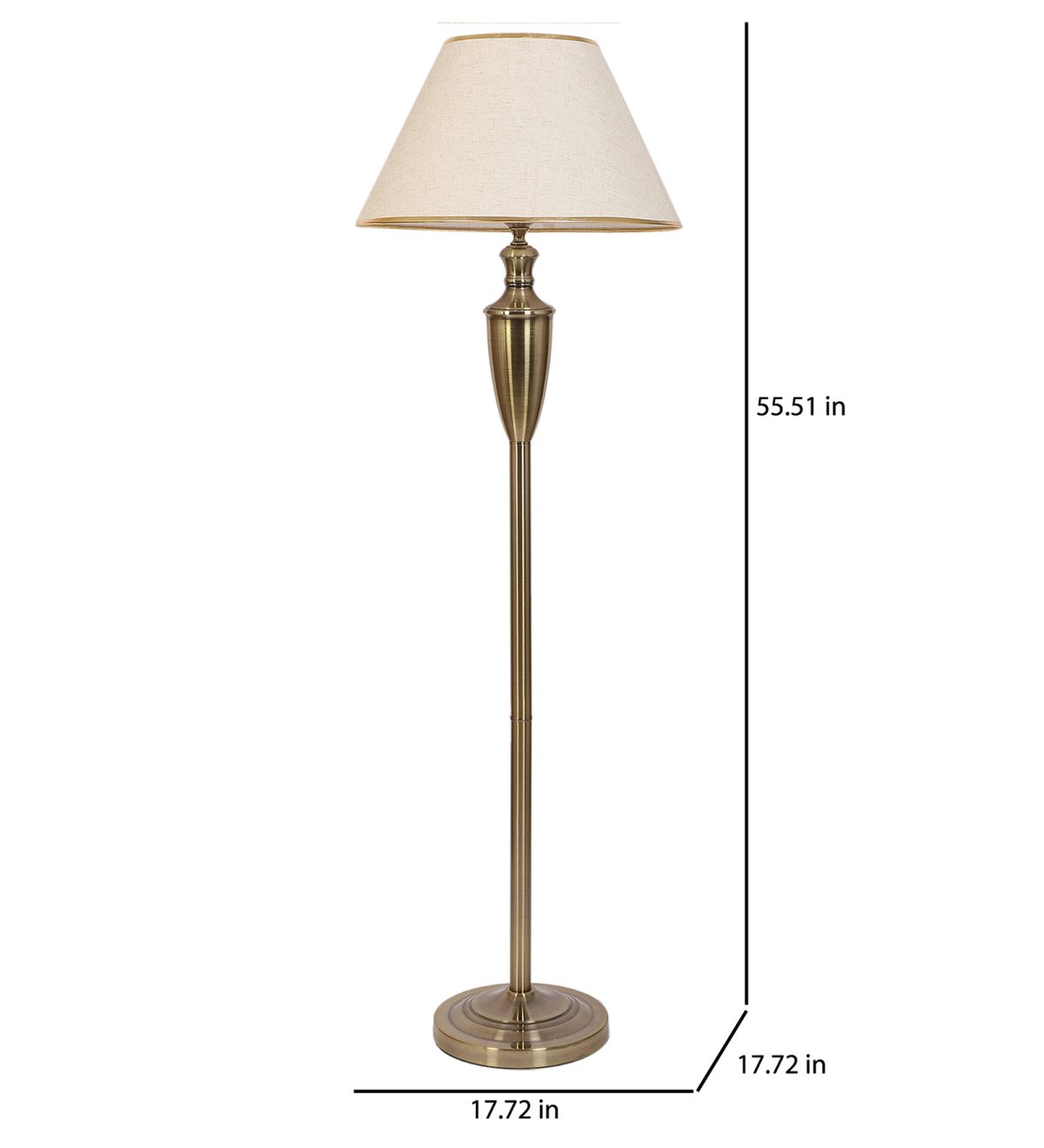LEARC antique brass finish floor lamp with cream textured shade having golden border. LAMP NOT INCLUDED.