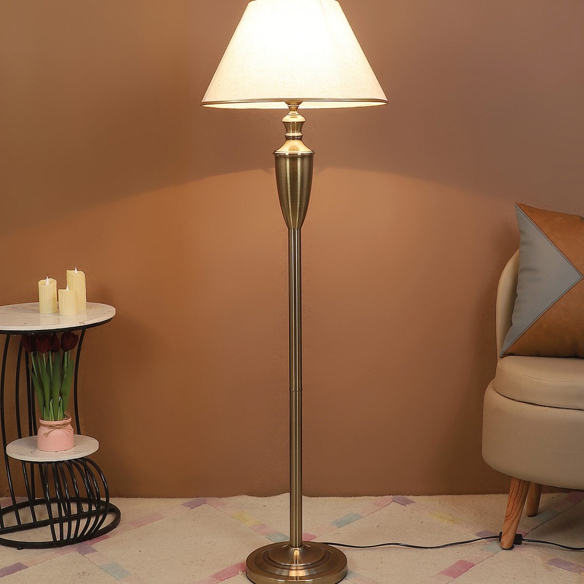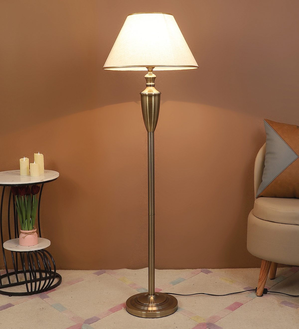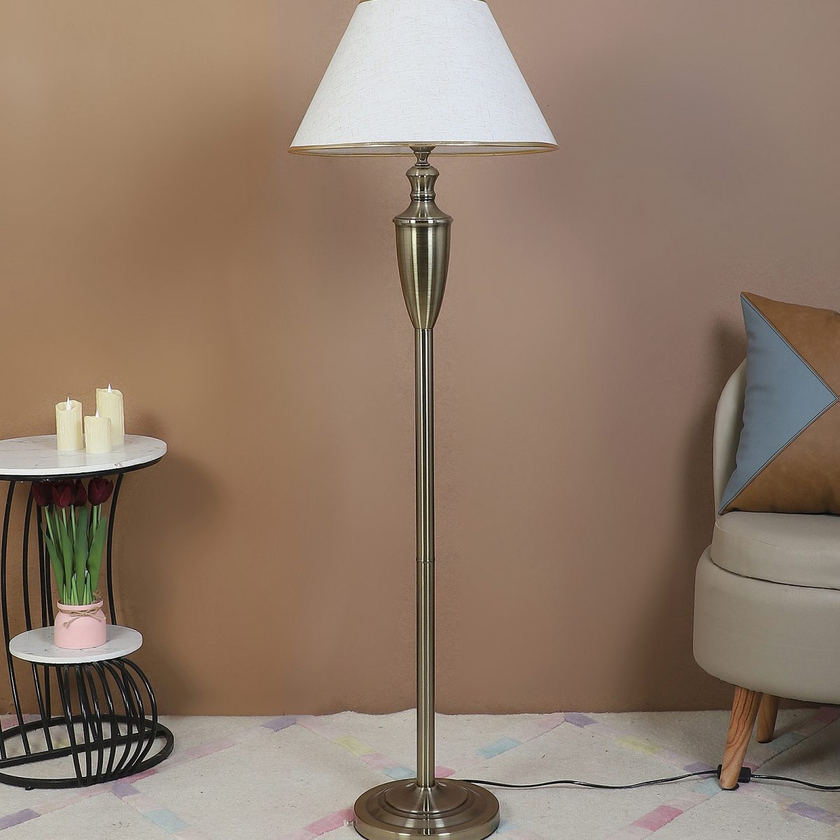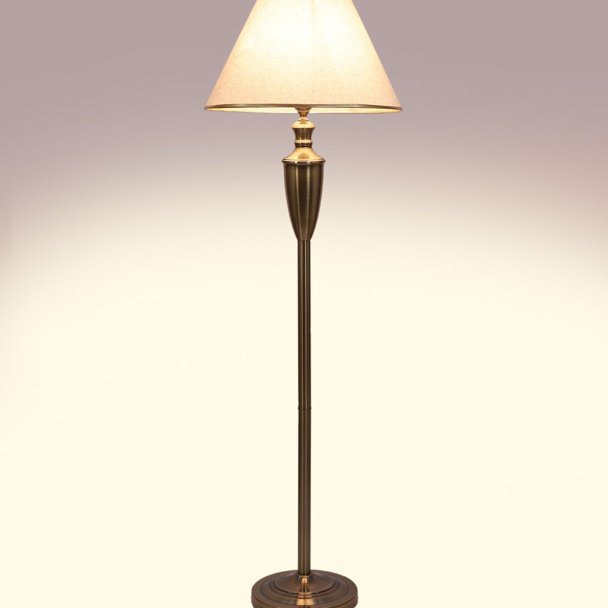 LEARC antique brass finish floor lamp with cream textured shade having golden border. LAMP NOT INCLUDED.