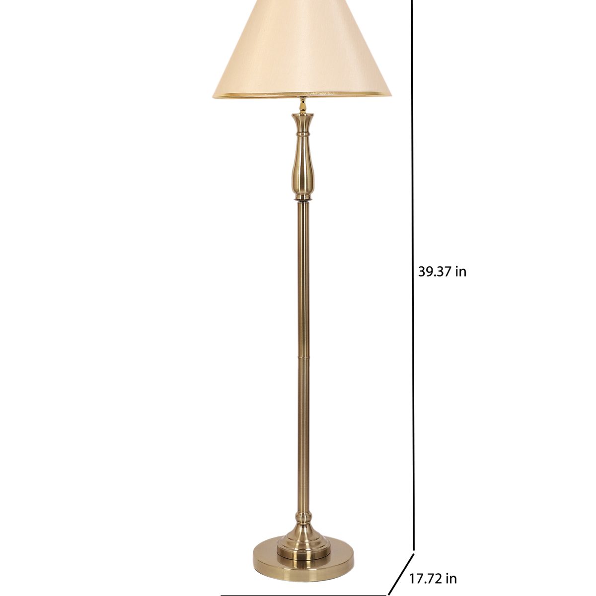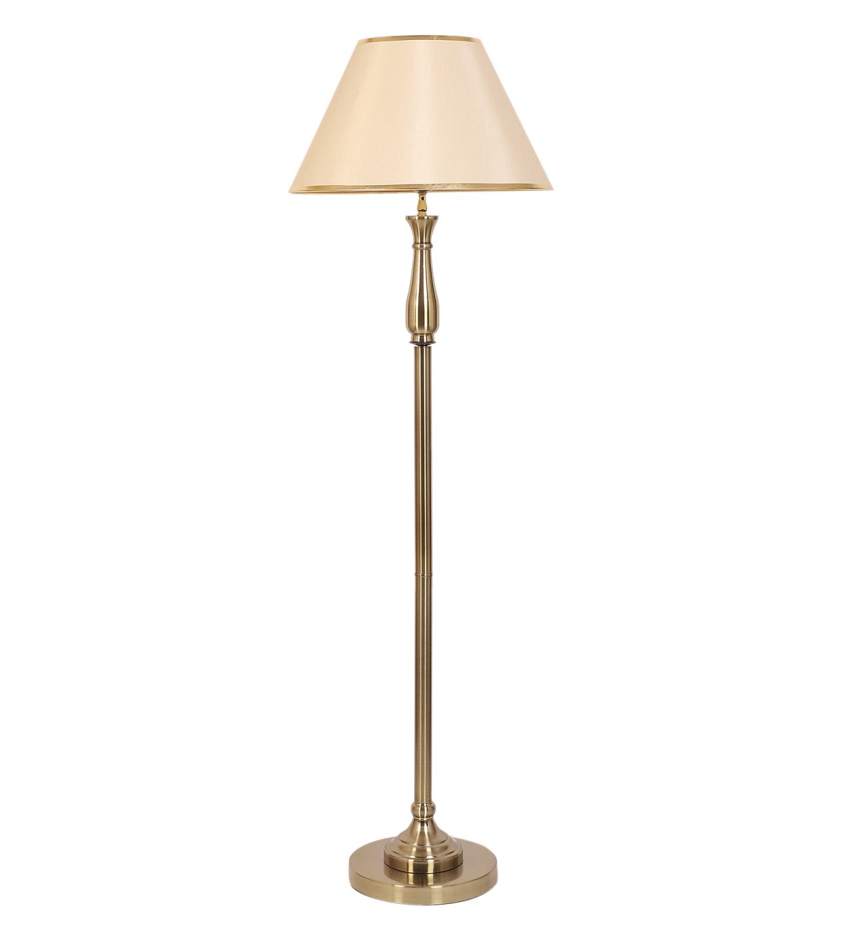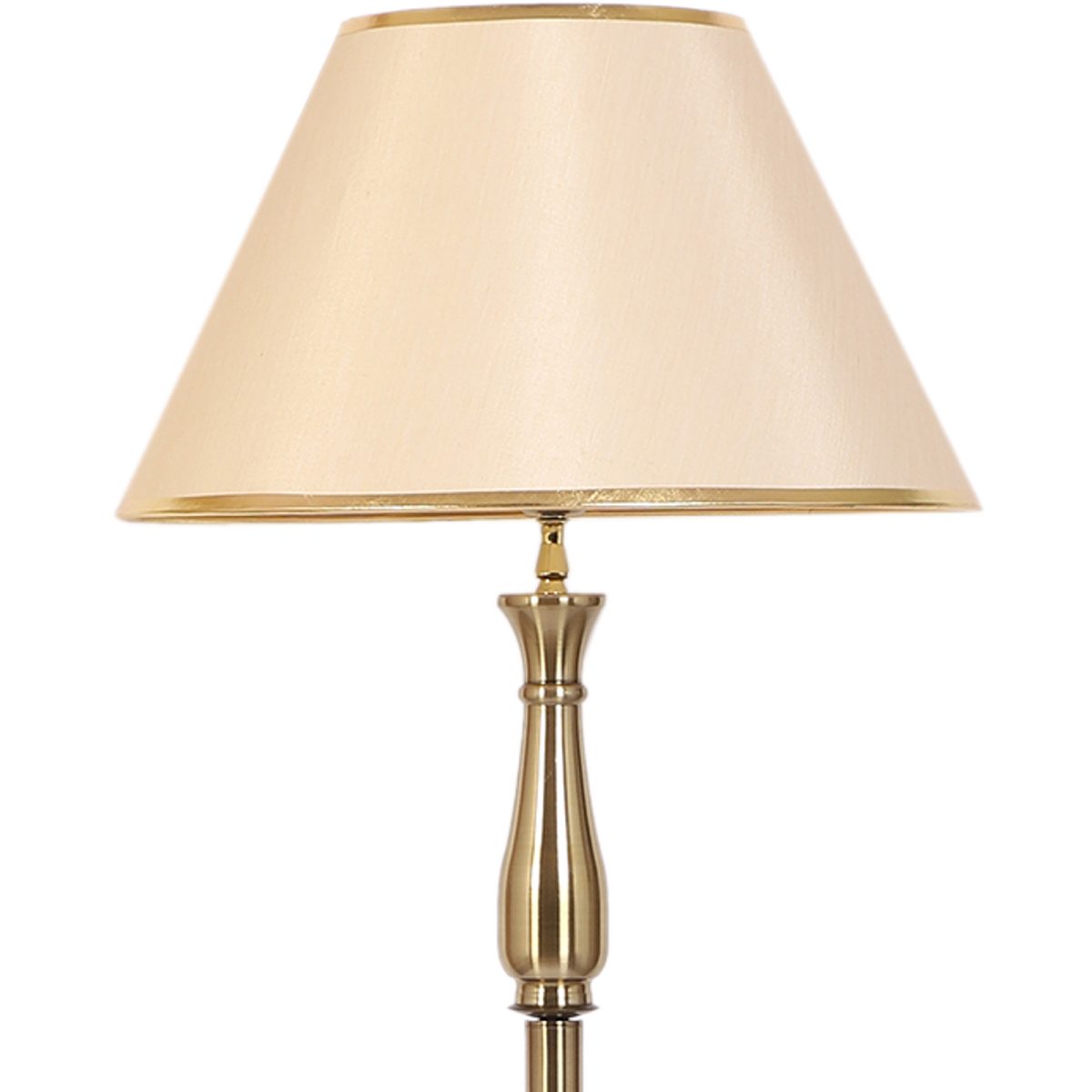 LEARC antique brass finish floor lamp with light gold shade having golden border. LAMP NOT INCLUDED.