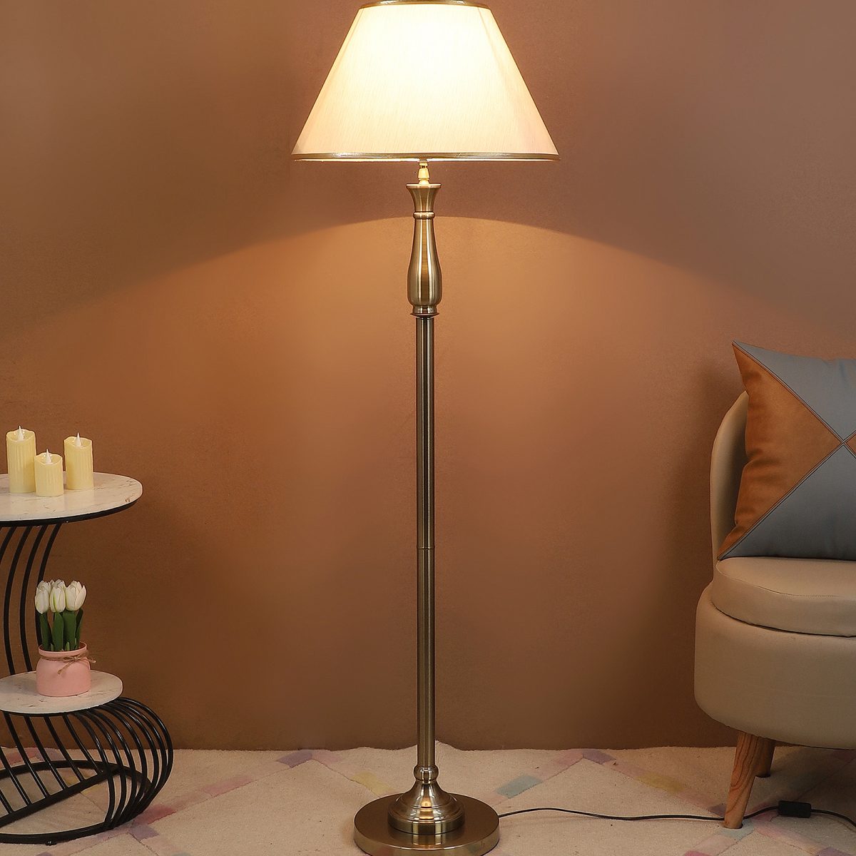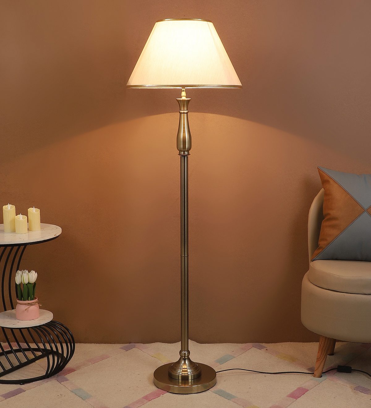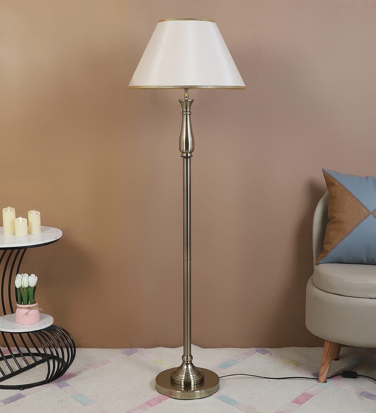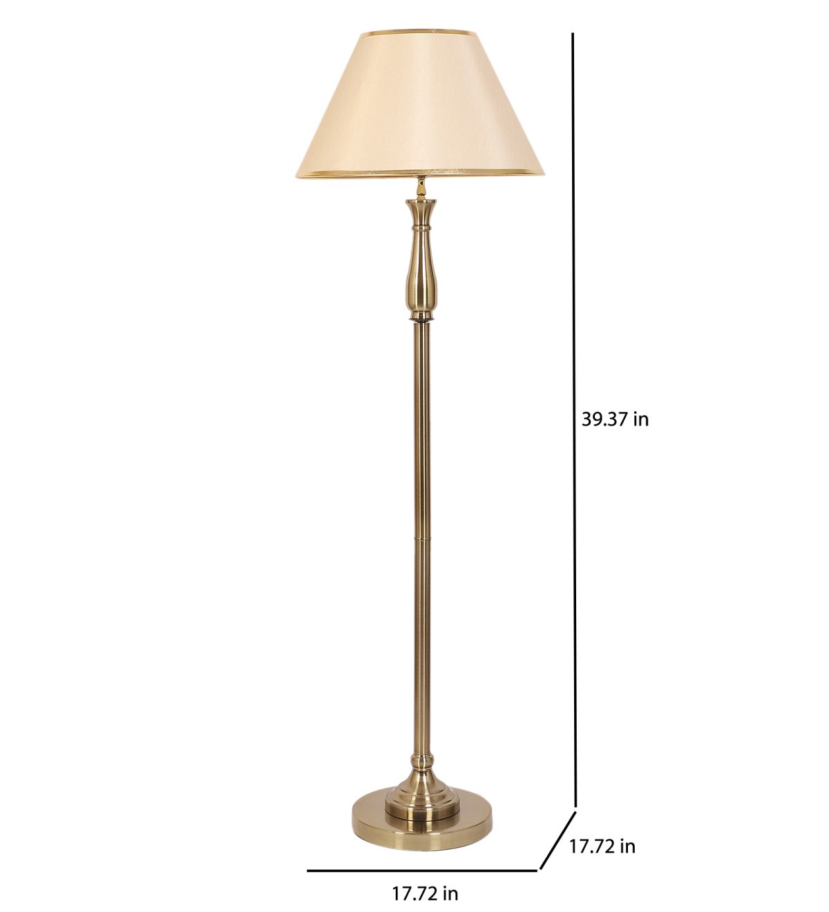 LEARC antique brass finish floor lamp with light gold shade having golden border. LAMP NOT INCLUDED.
