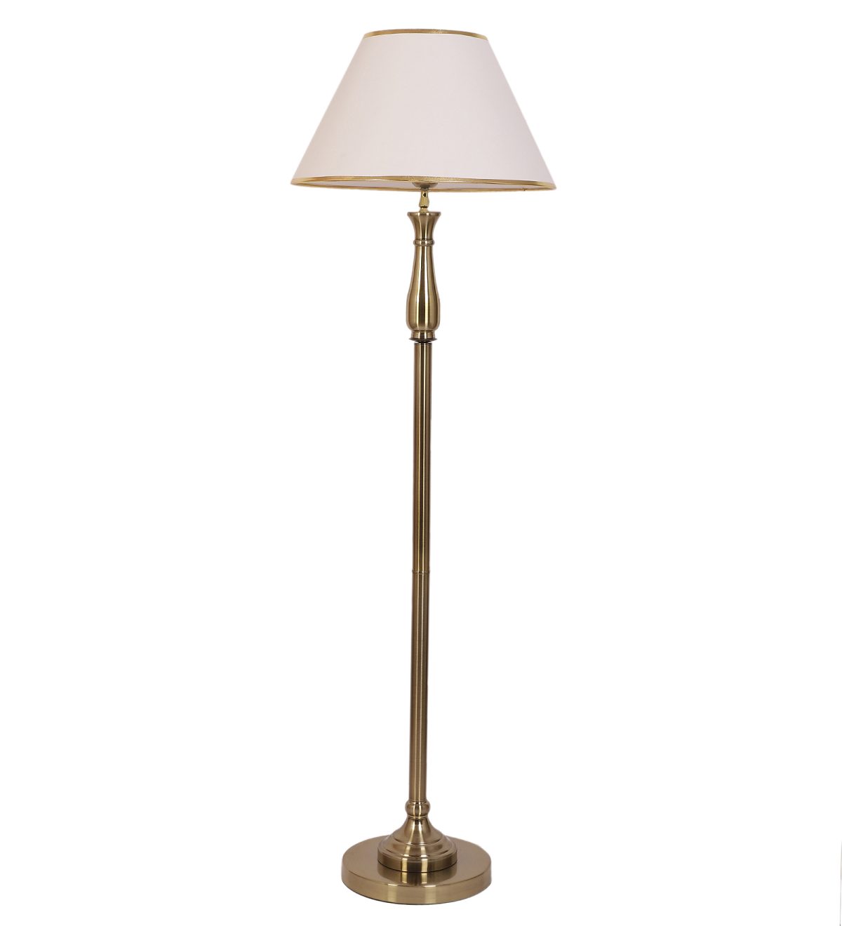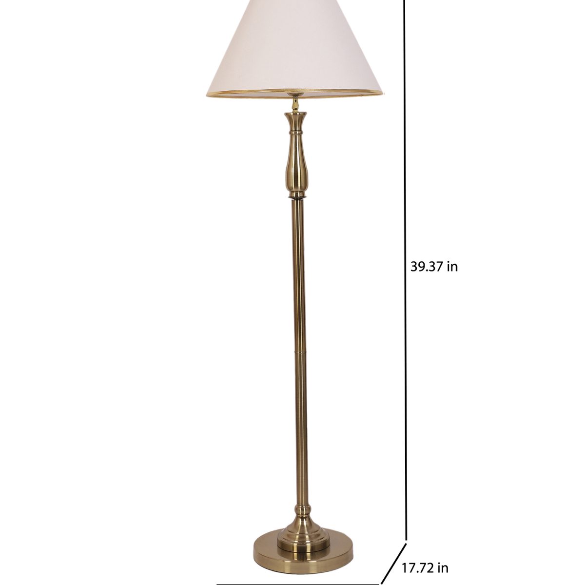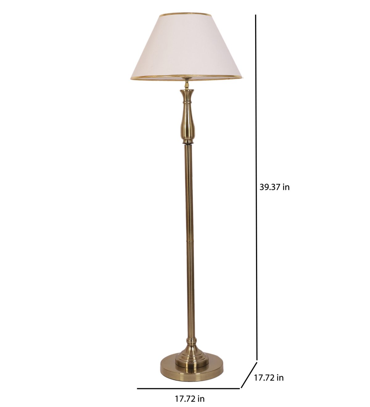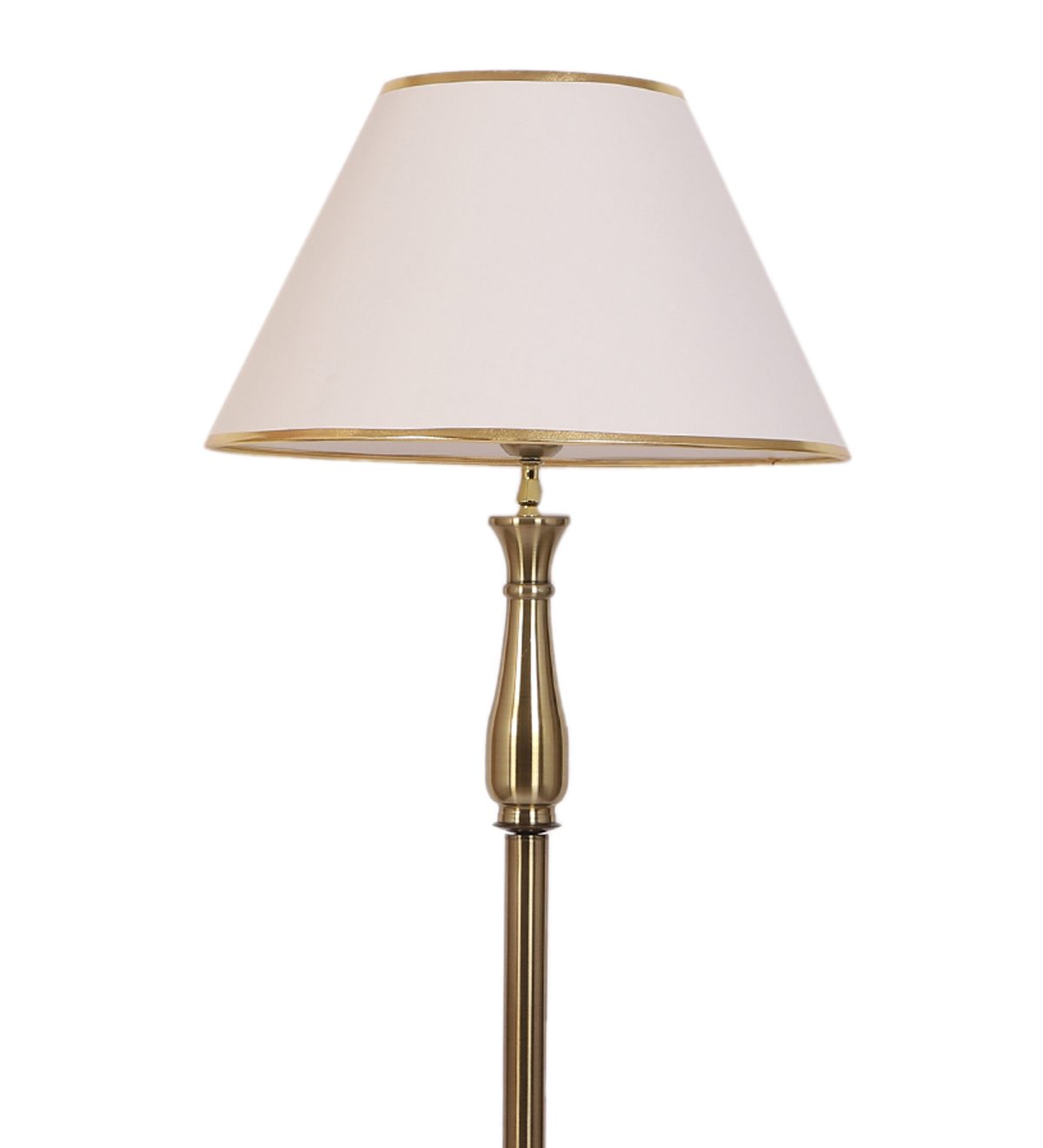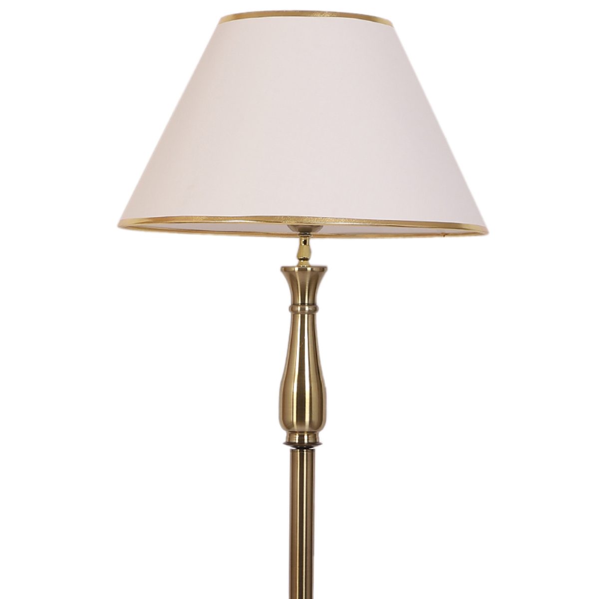 LEARC antique brass finish floor lamp with white shade having golden border. LAMP NOT INCLUDED.