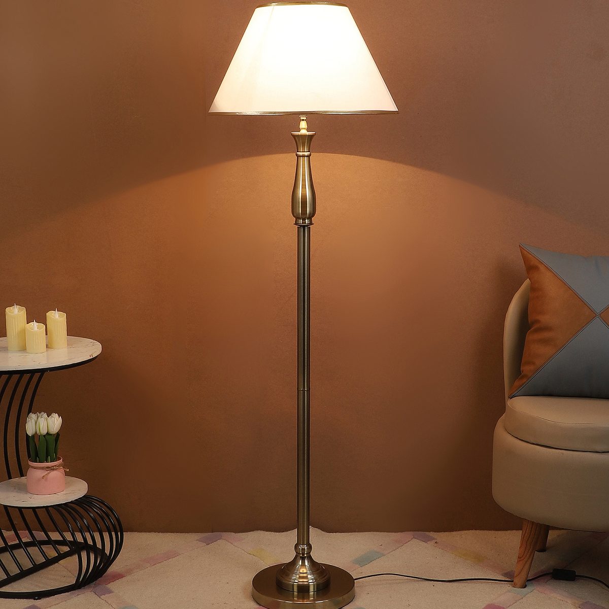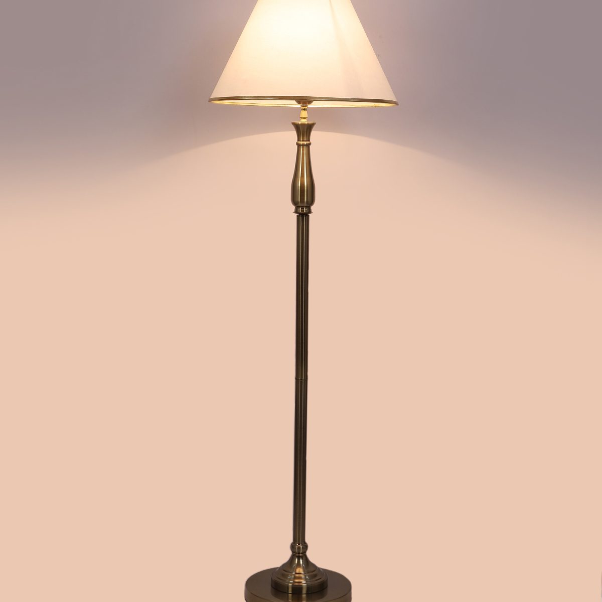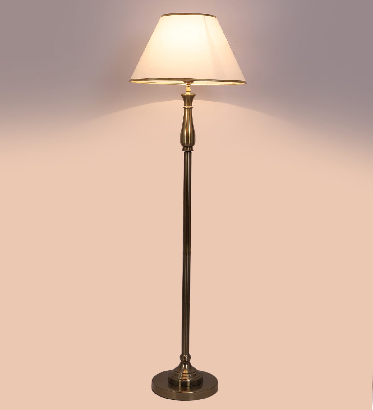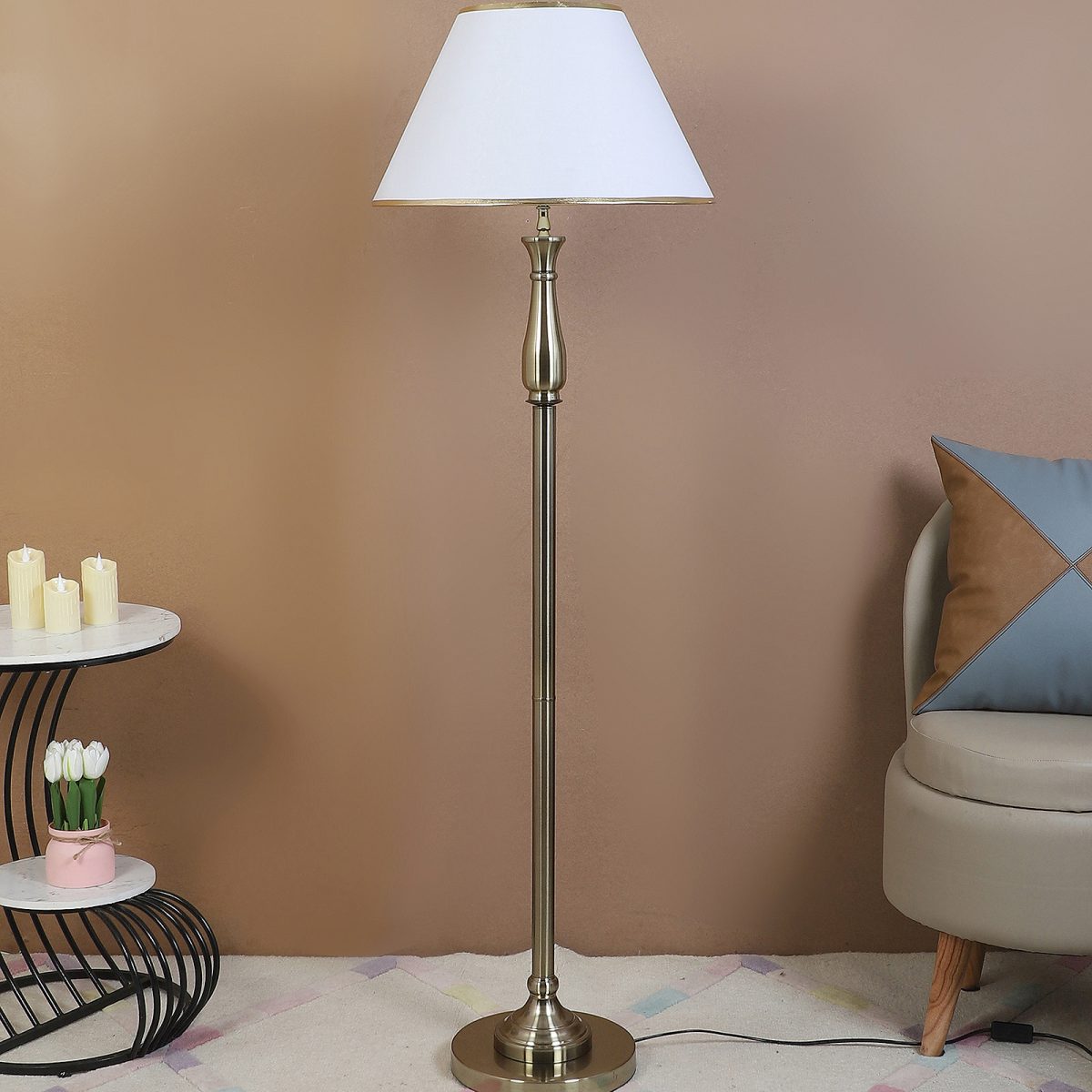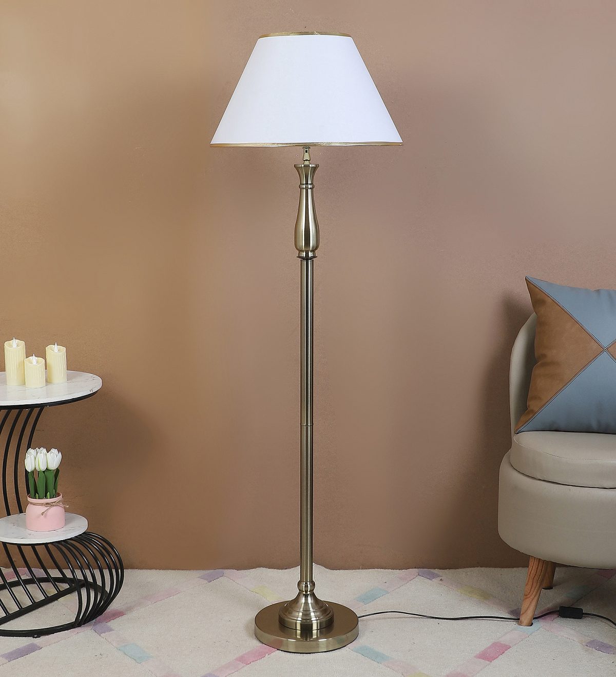 LEARC antique brass finish floor lamp with white shade having golden border. LAMP NOT INCLUDED.