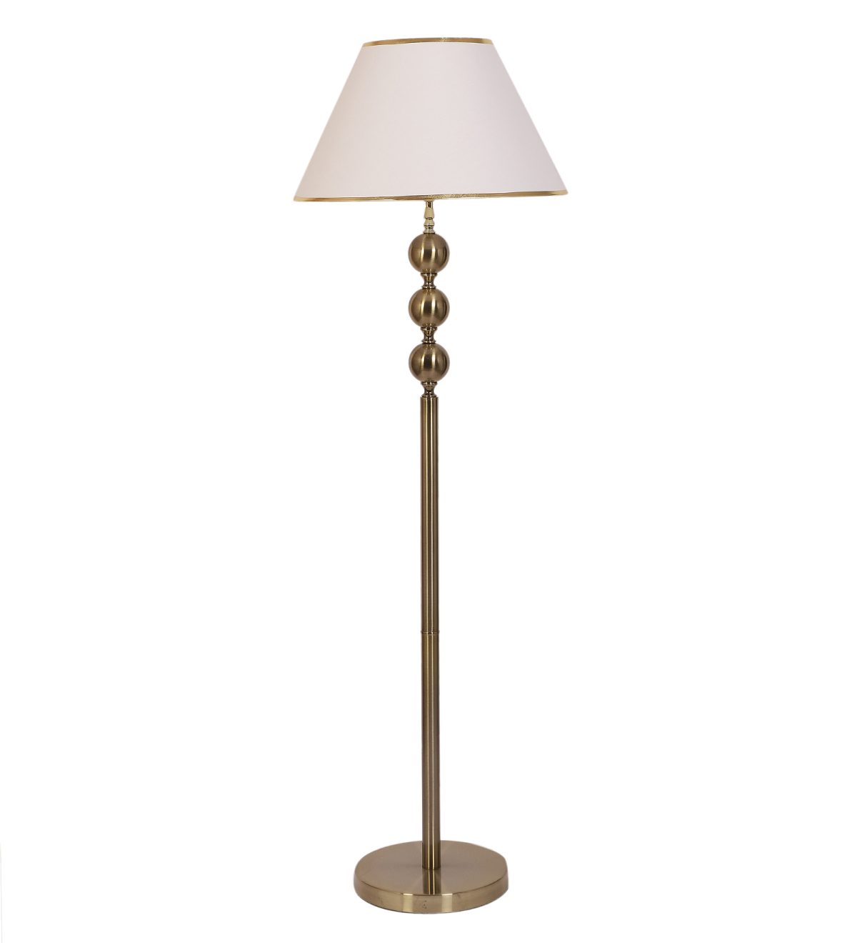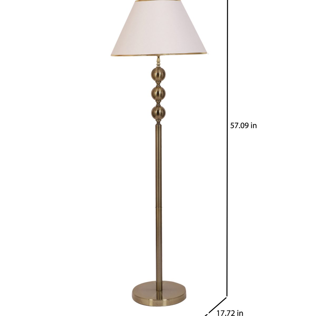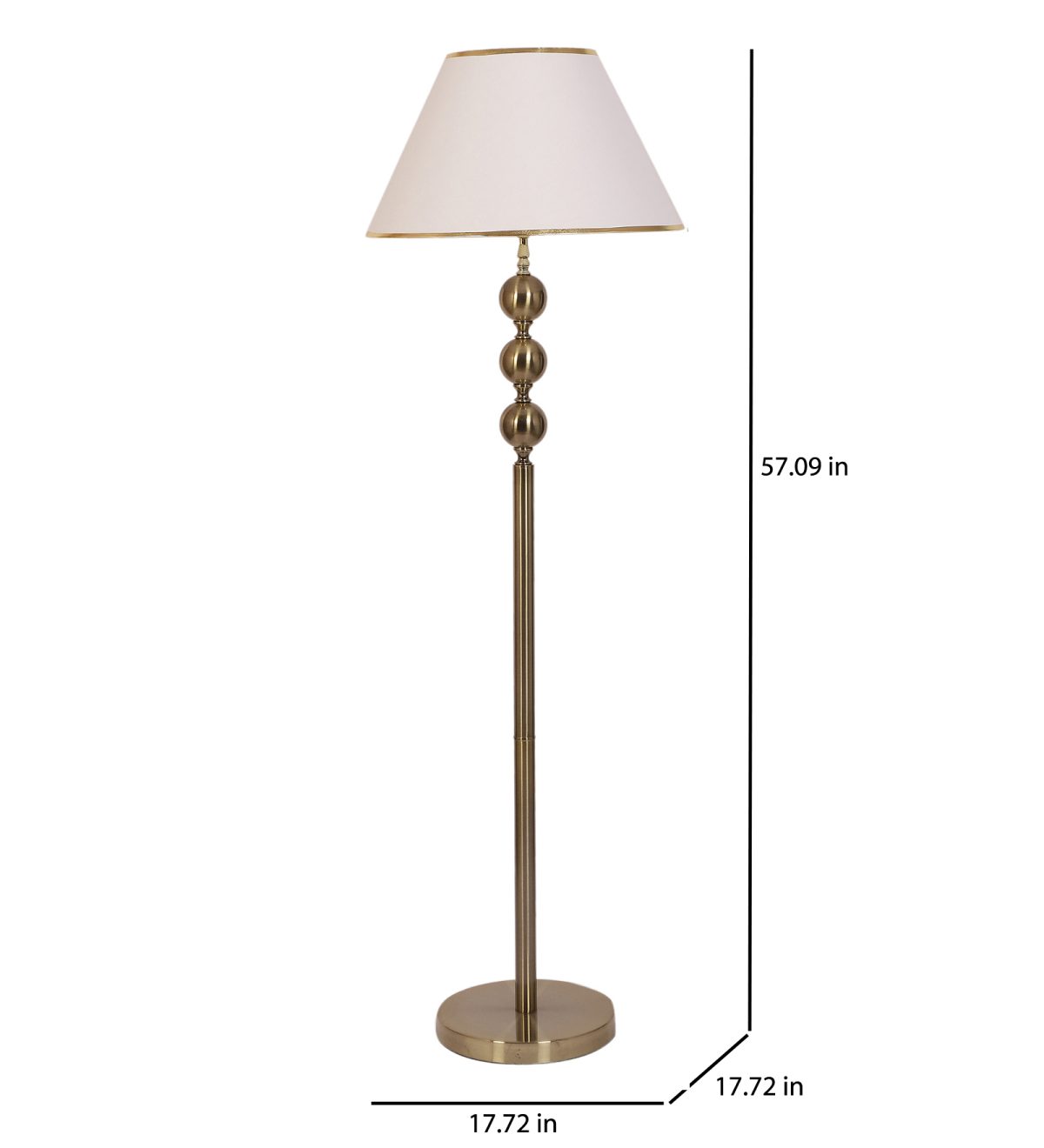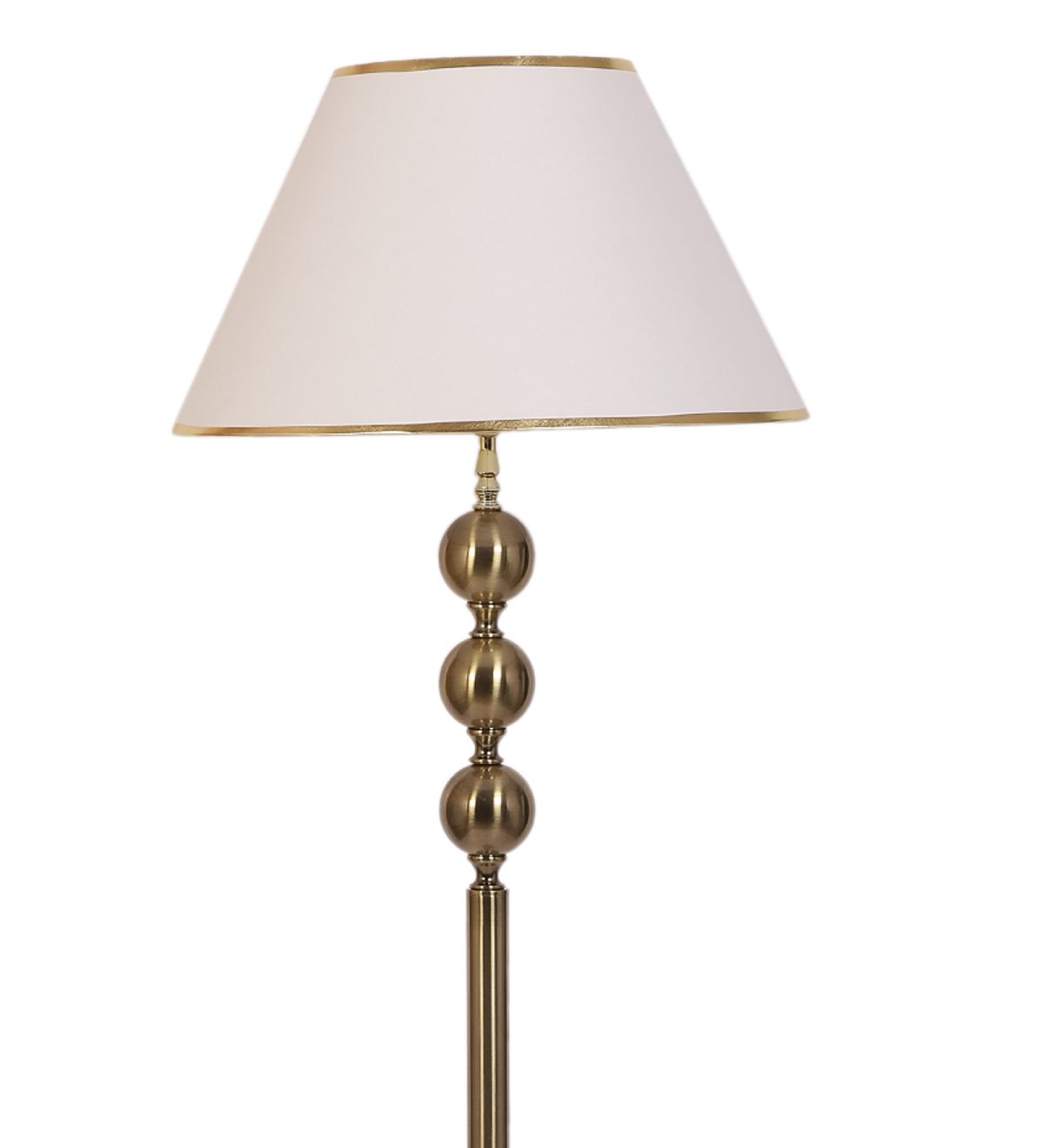 LEARC antique brass finish floor lamp with white shade having golden border. LAMP NOT INCLUDED.