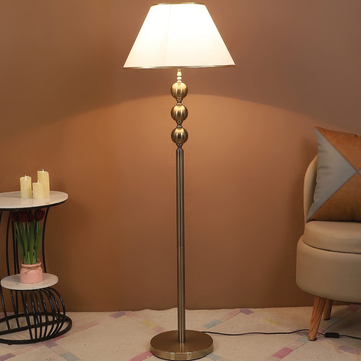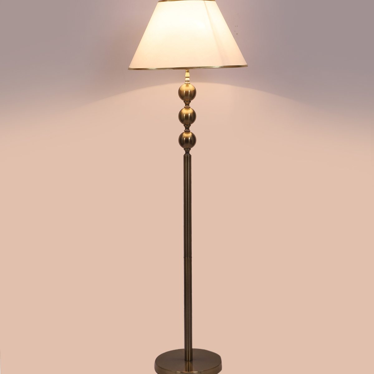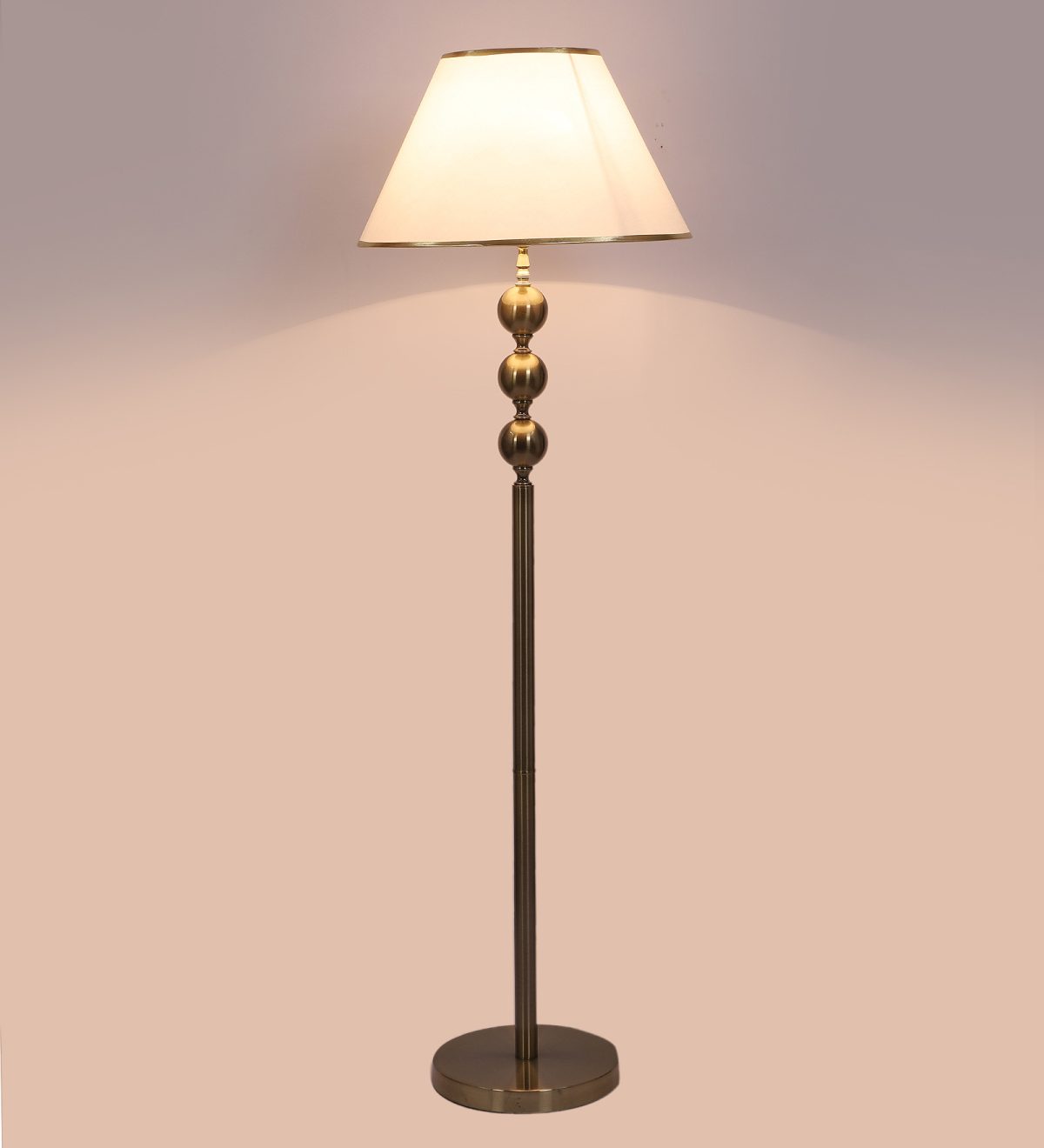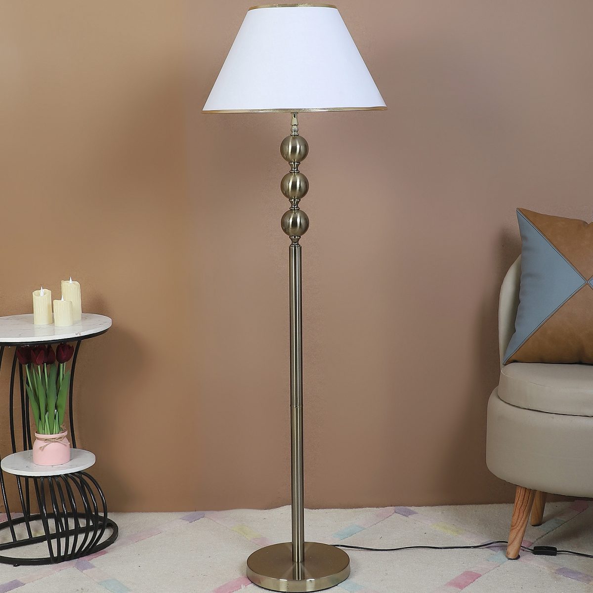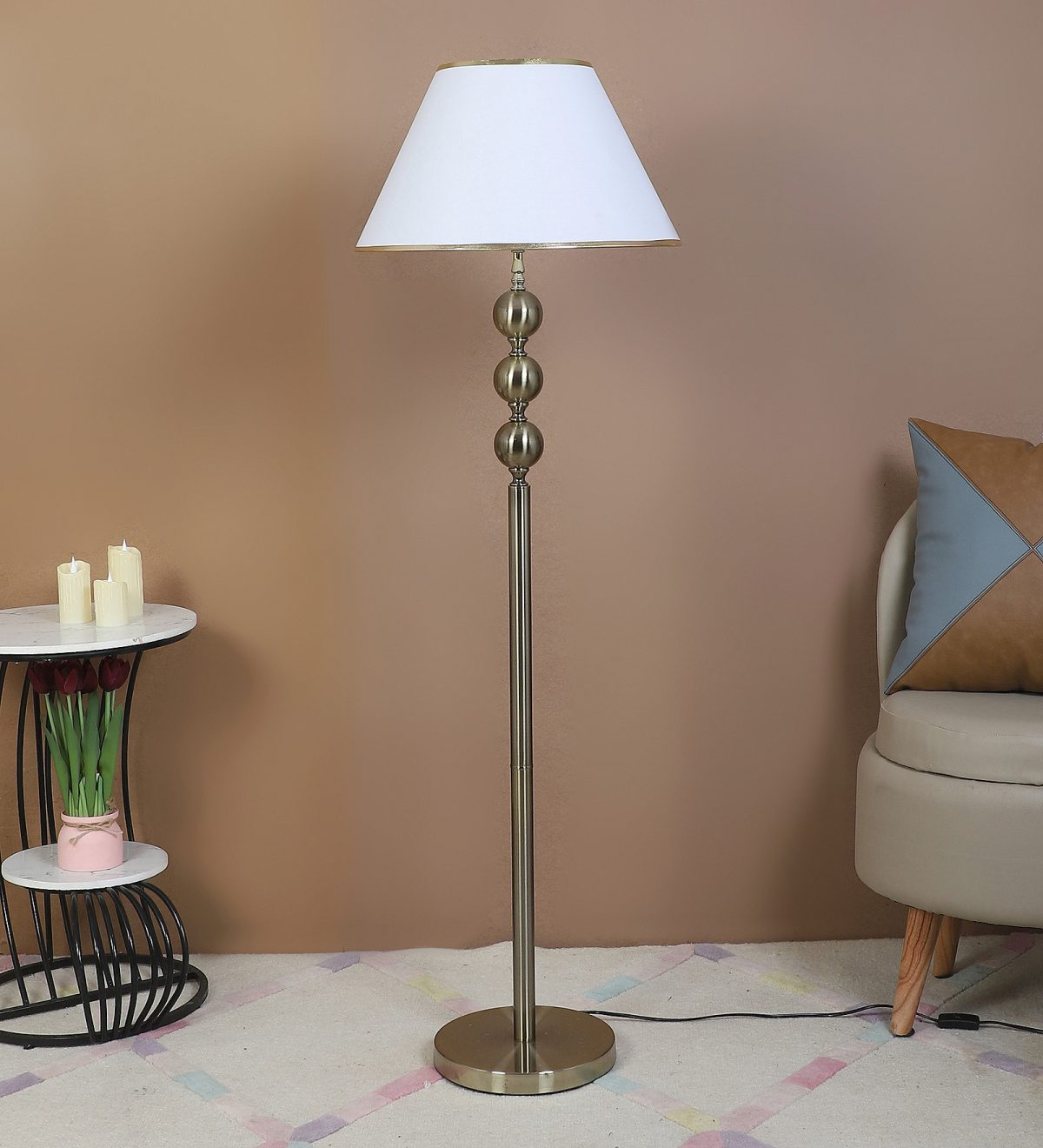 LEARC antique brass finish floor lamp with white shade having golden border. LAMP NOT INCLUDED.