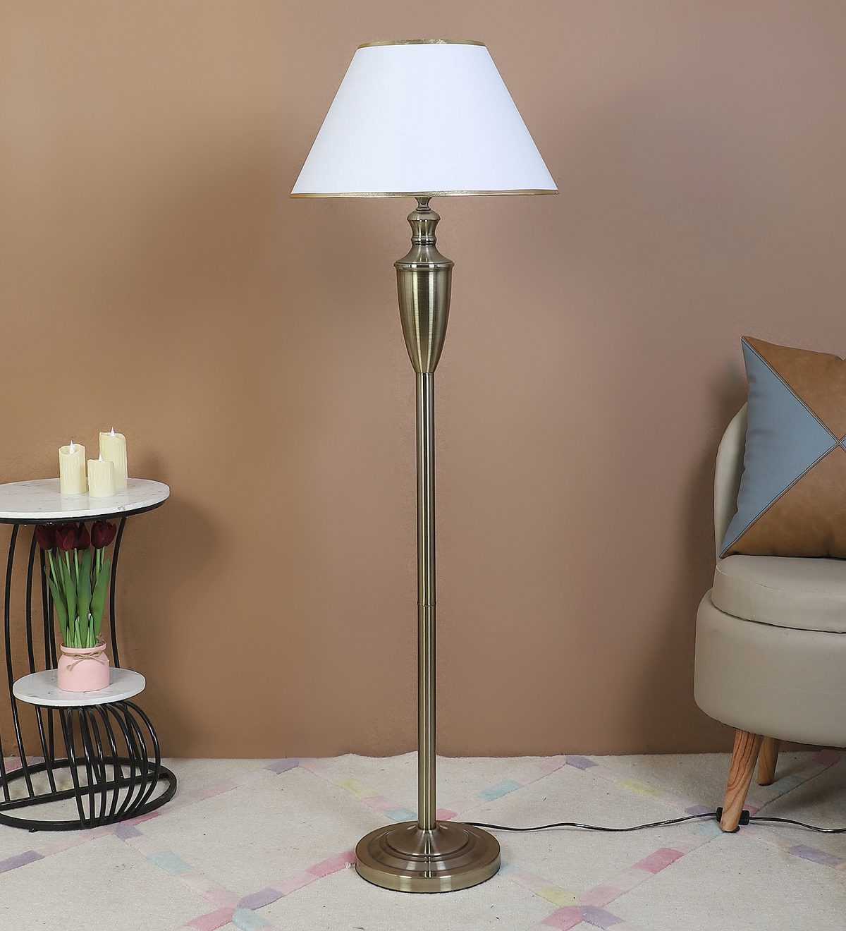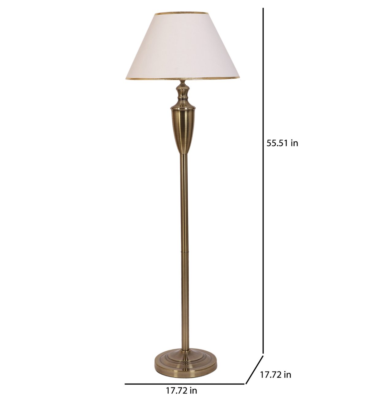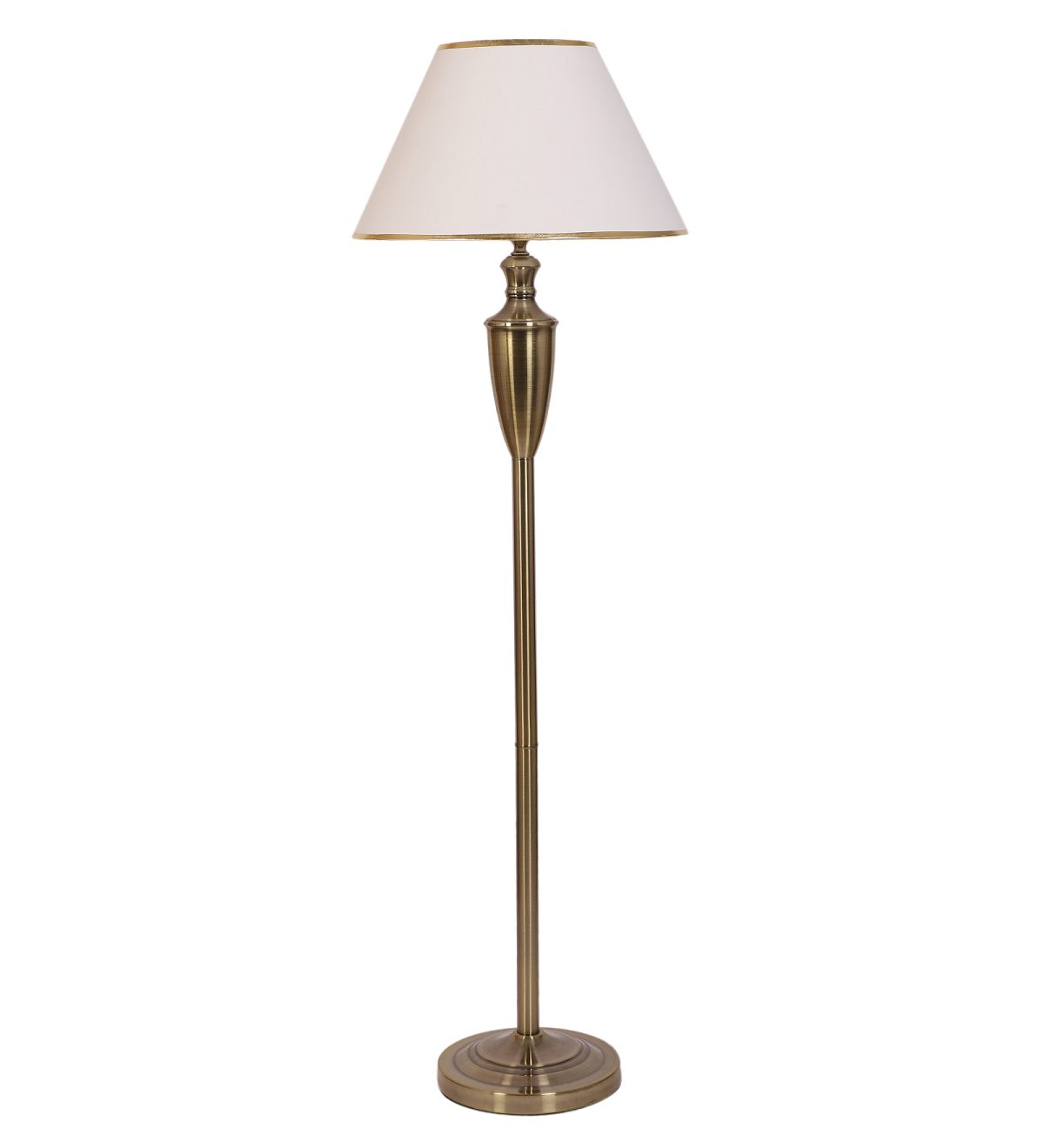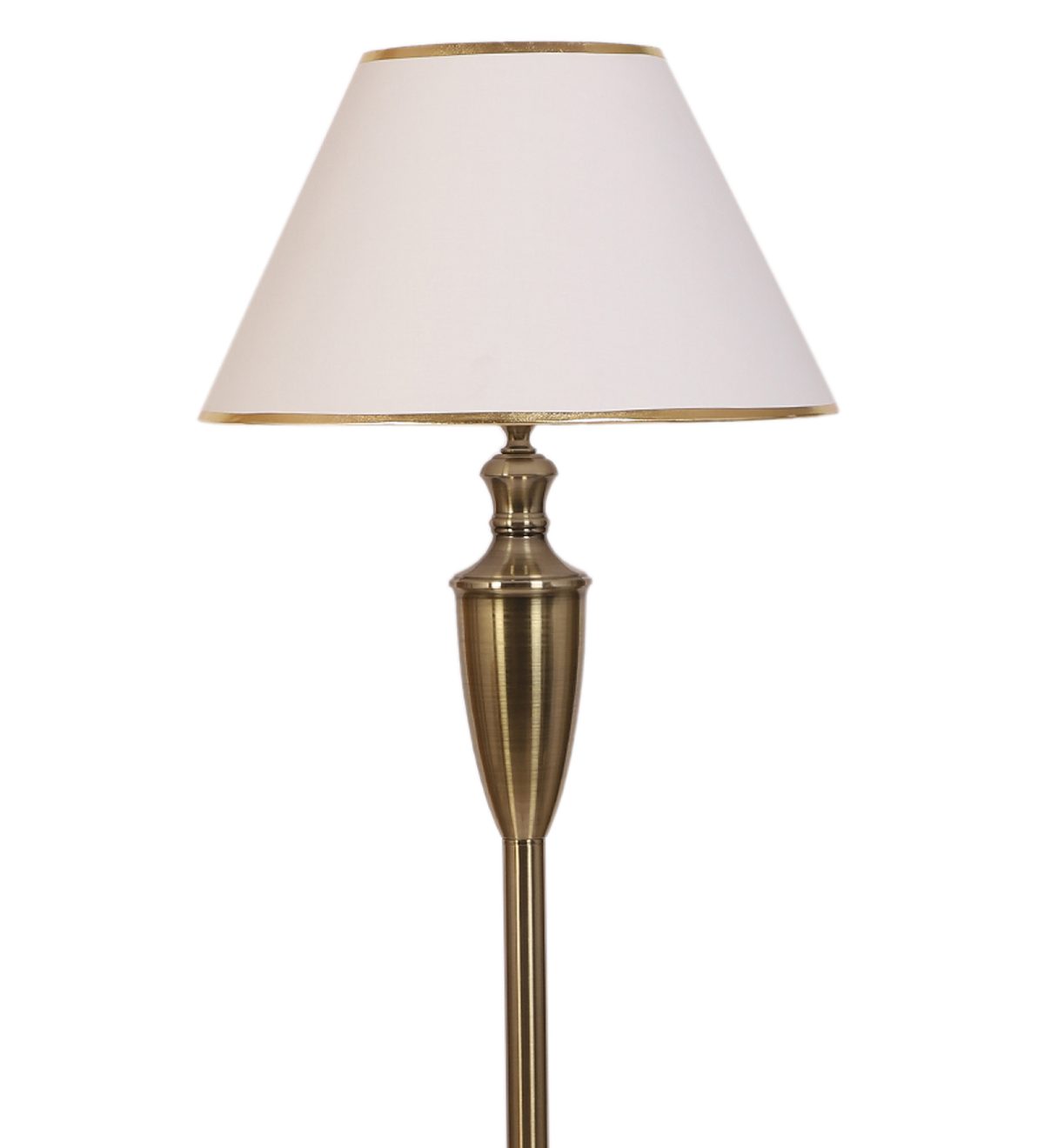 LEARC antique brass finish floor lamp with white shade having golden border. LAMP NOT INCLUDED.