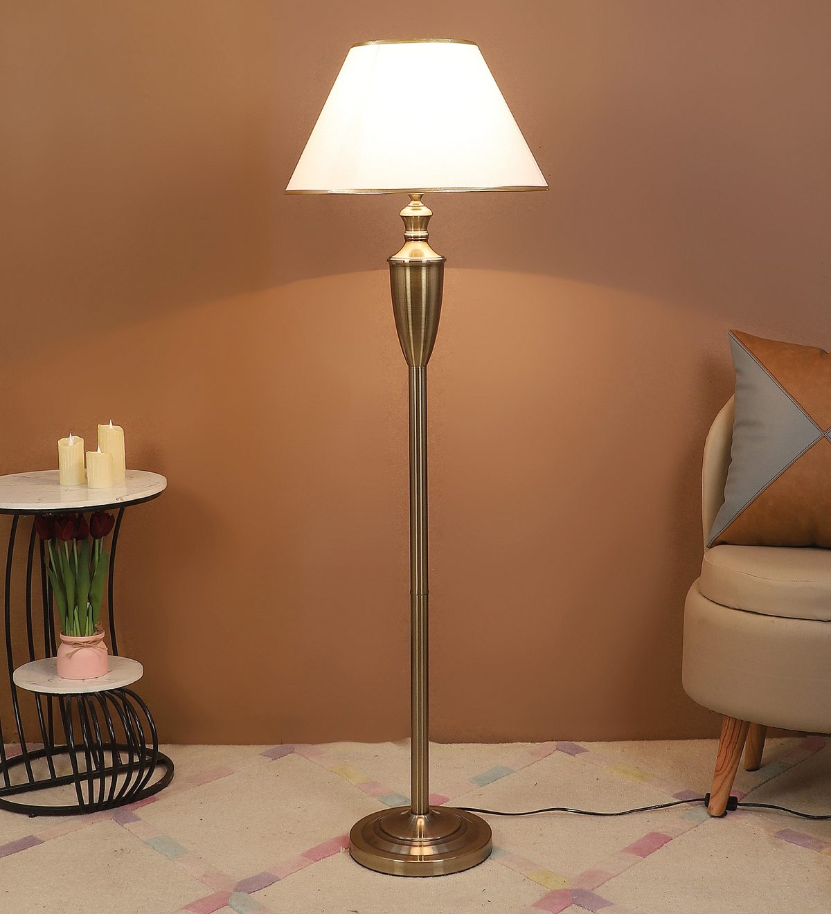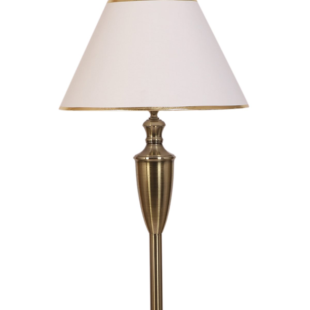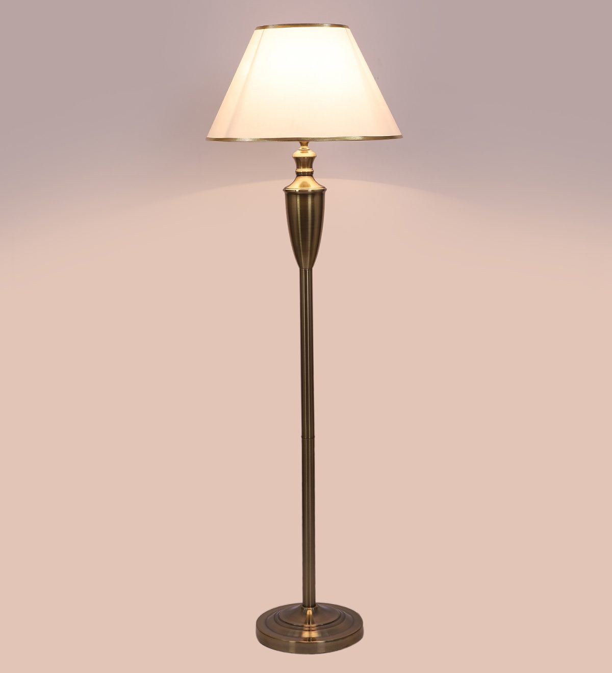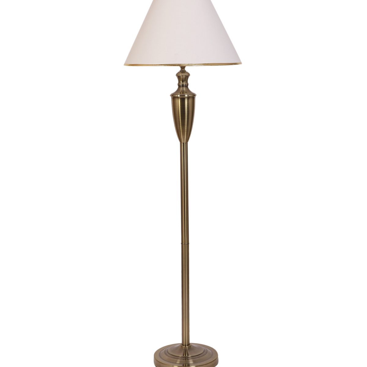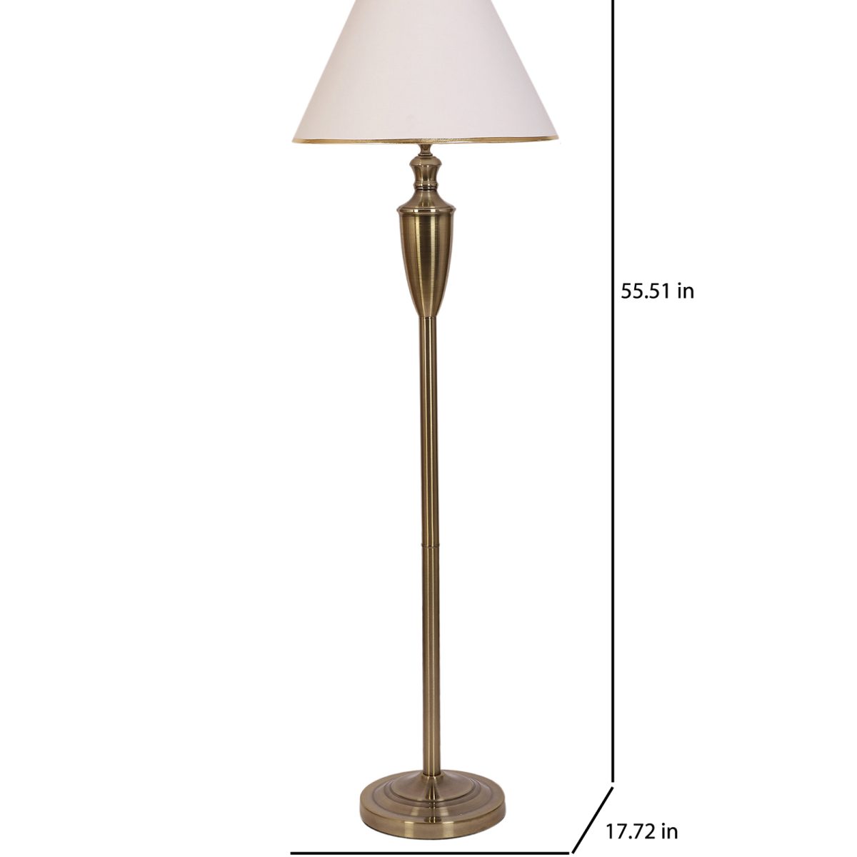 LEARC antique brass finish floor lamp with white shade having golden border. LAMP NOT INCLUDED.