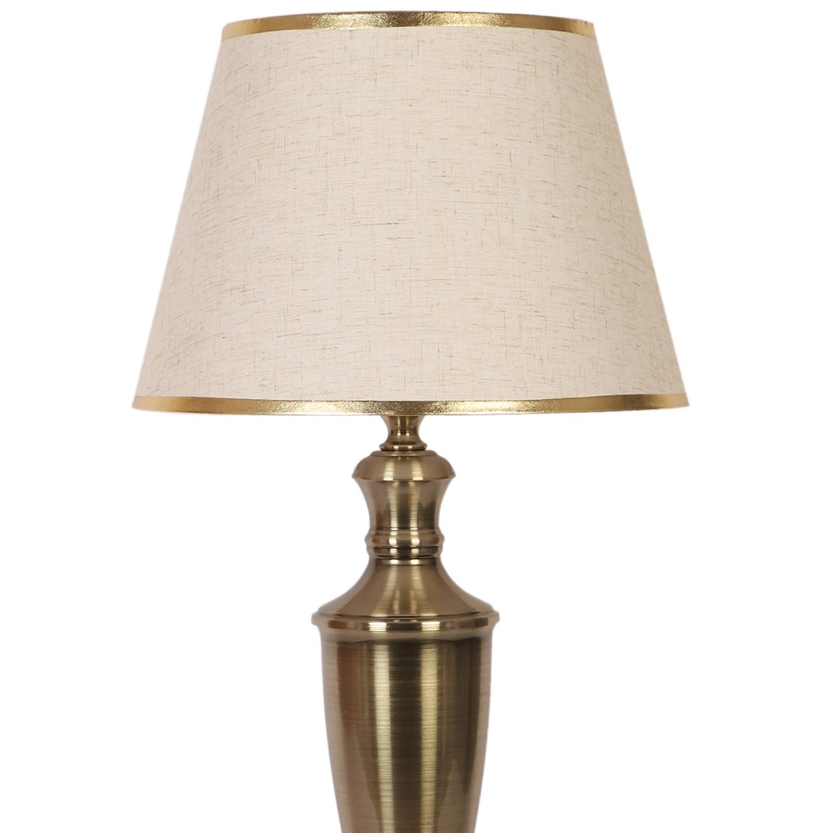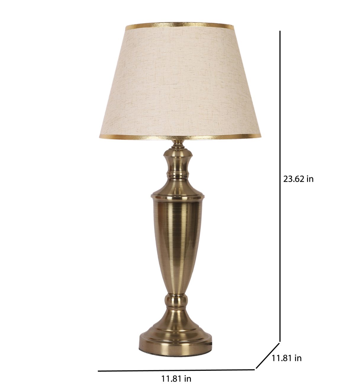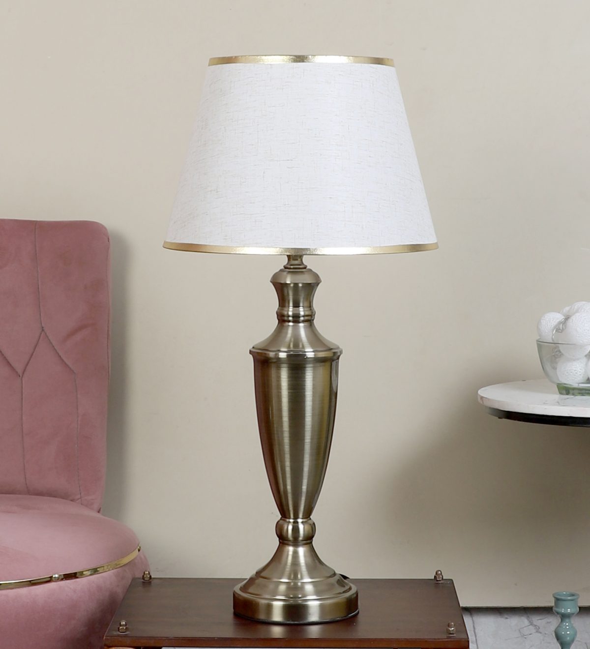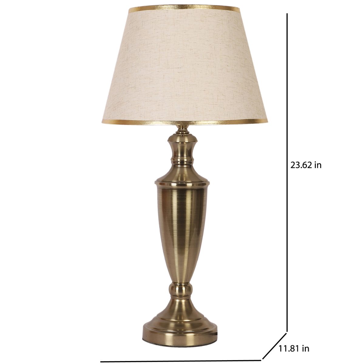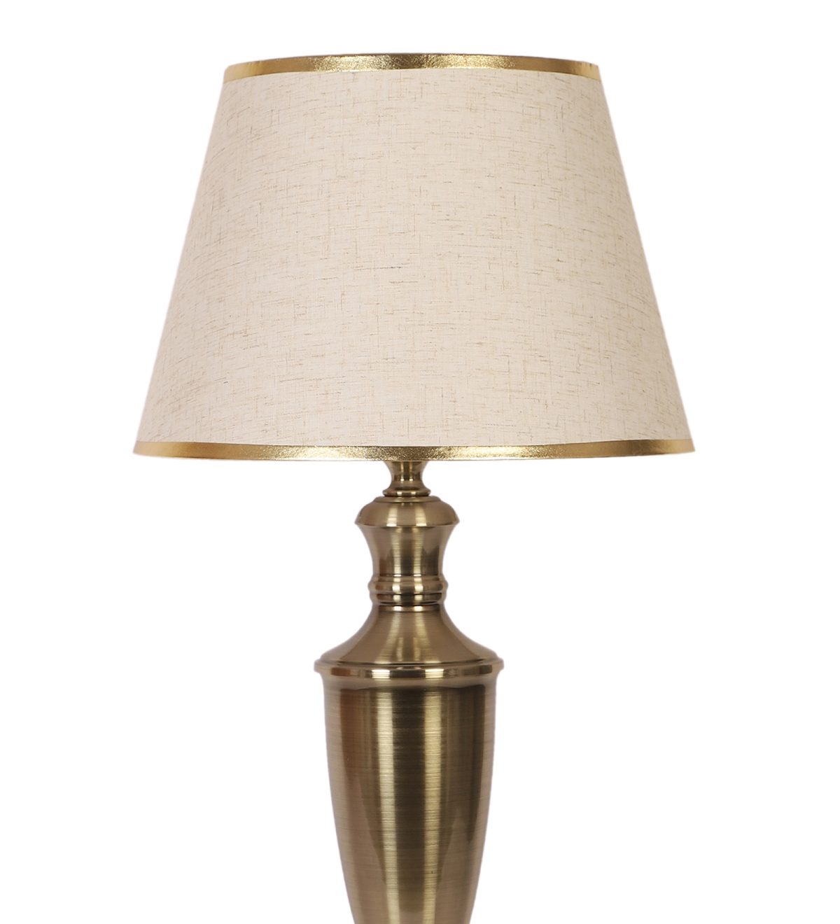 LEARC antique brass finish table lamp with cream textured shade having golden border. LAMP NOT INCLUDED.