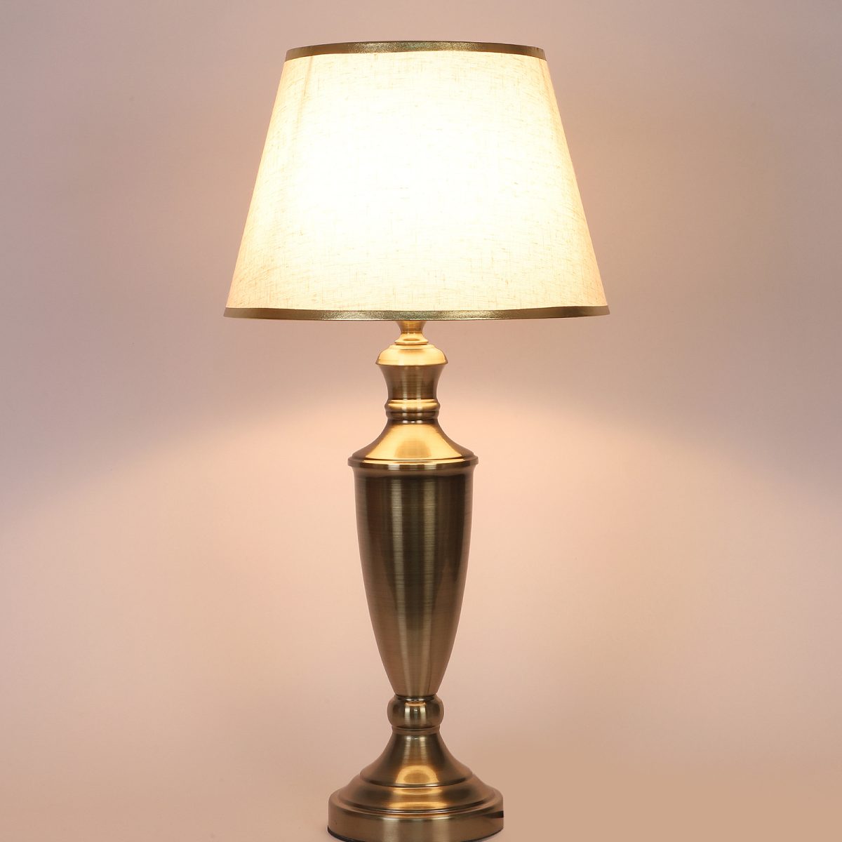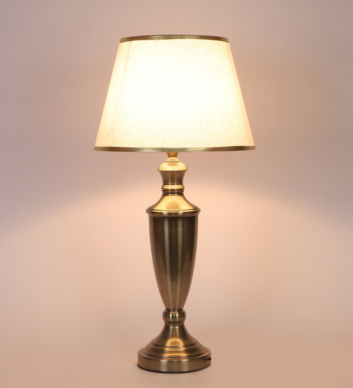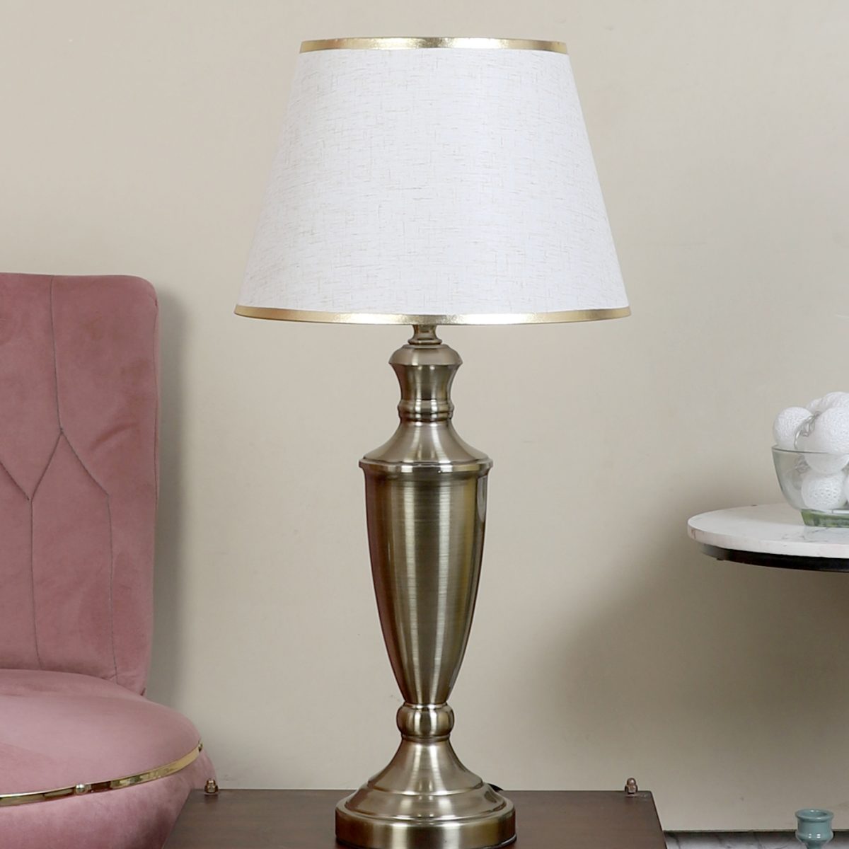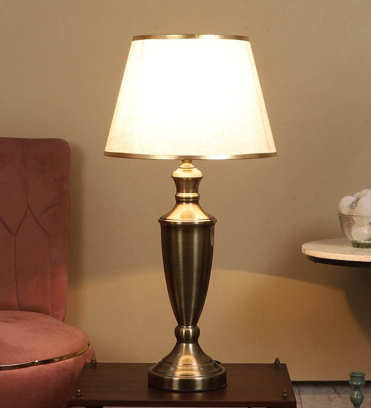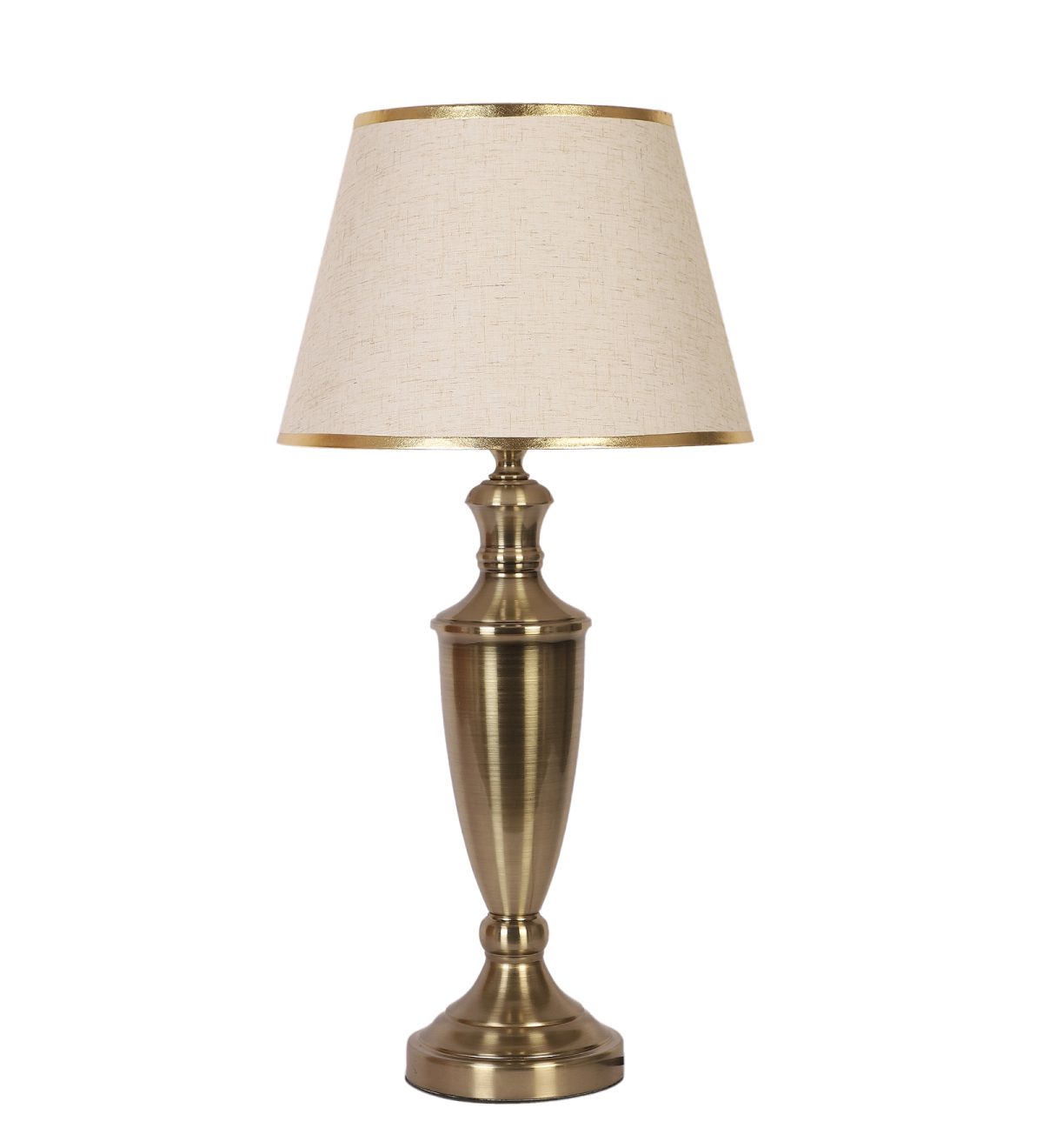 LEARC antique brass finish table lamp with cream textured shade having golden border. LAMP NOT INCLUDED.