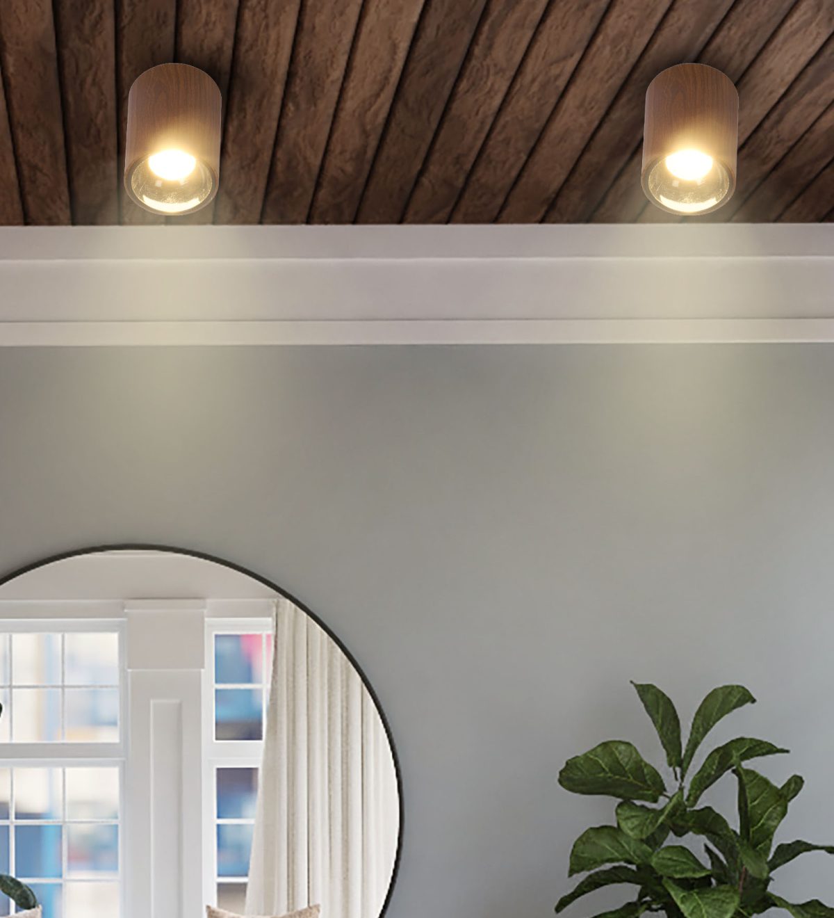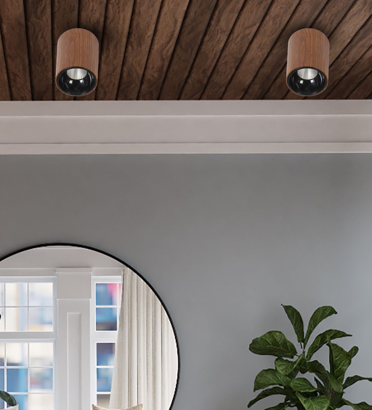 Brown (wood finish with grains) round LED surface ceiling light. Can be used both indoors and outdoors. Scene Switch Feature : With it’s scene switch feature the downlighter can change it’s color into three modes i.e Cool Day Light, Natural White and Warm White. ON/OFF of the switch in 2 seconds leads to the change in color. Choose the color of your downlighter according to your mood.