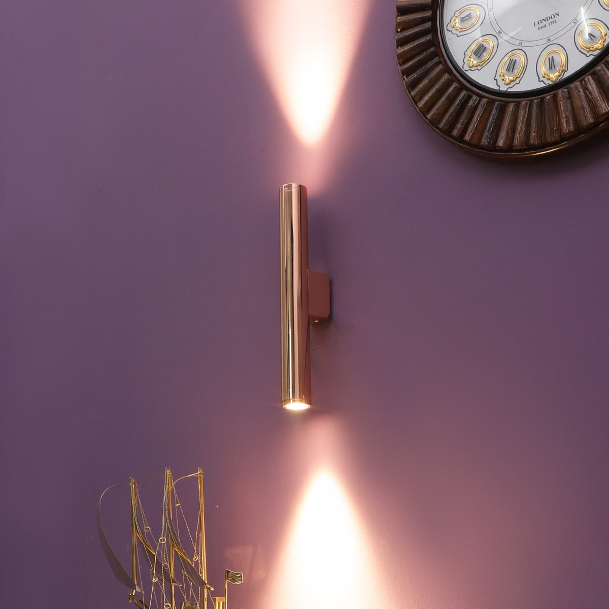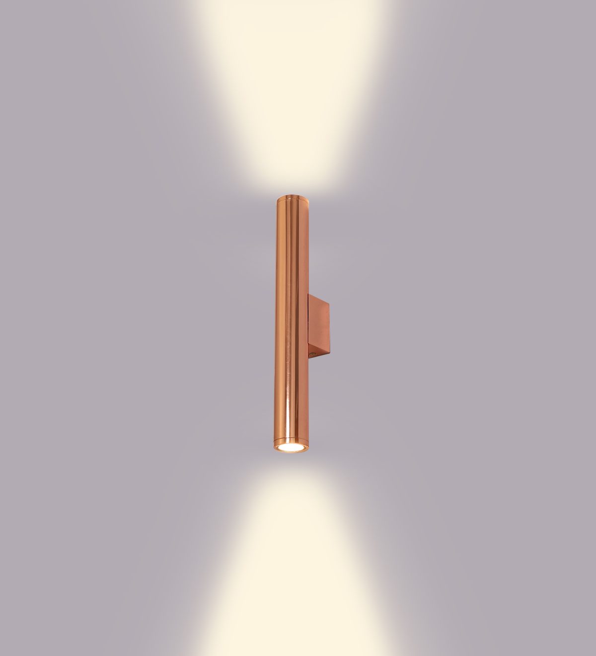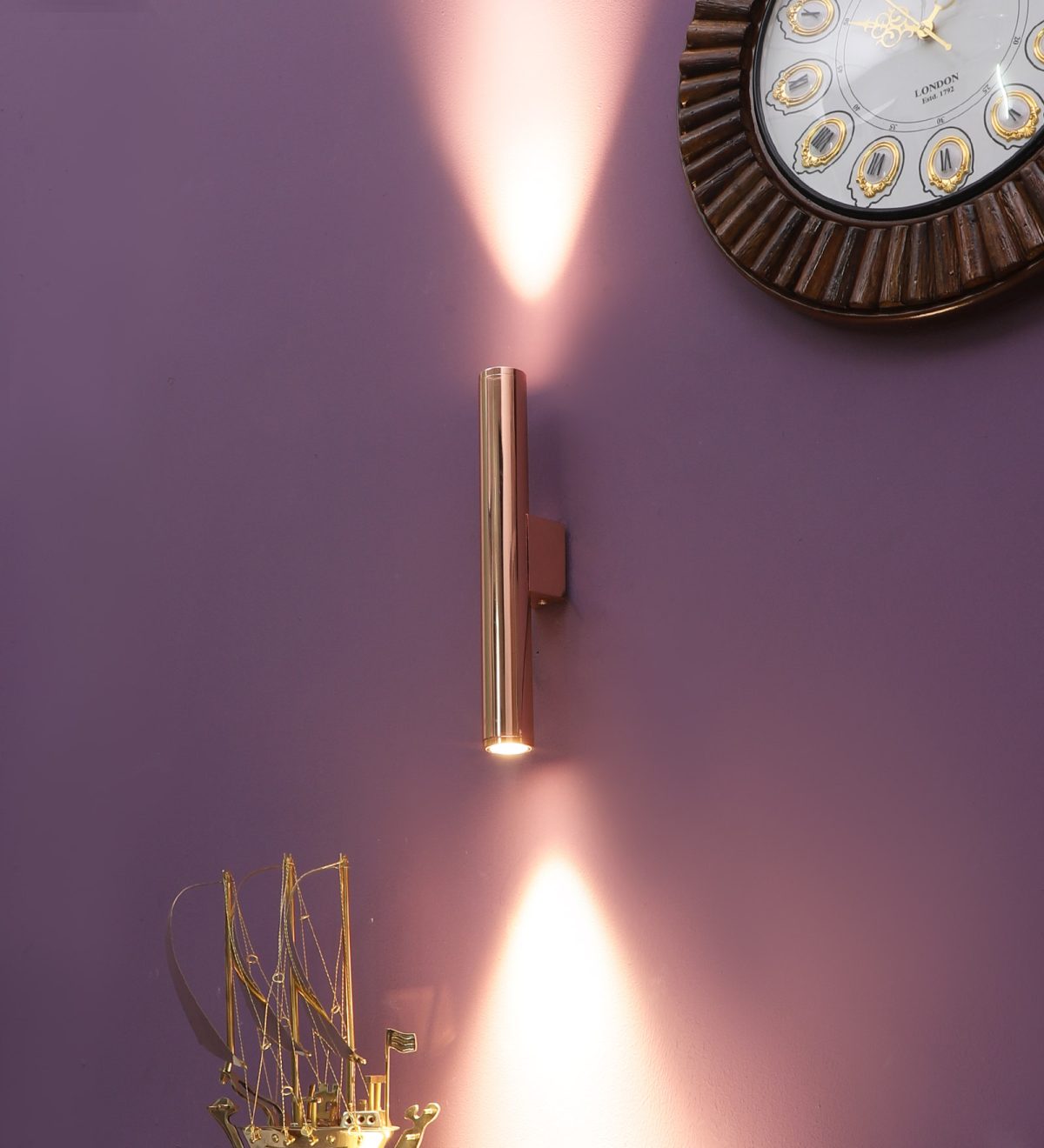 Copper up and down (6*2=12 watt) LED wall light using high quality LED and driver with high success rate having less than 0.5% replacement with warm white (yellow) light output. This design is largely preferred by architects and interior designers. Application includes both residential and commercial premises. Also used as a wall highlighter. Can be customized as per requirement.