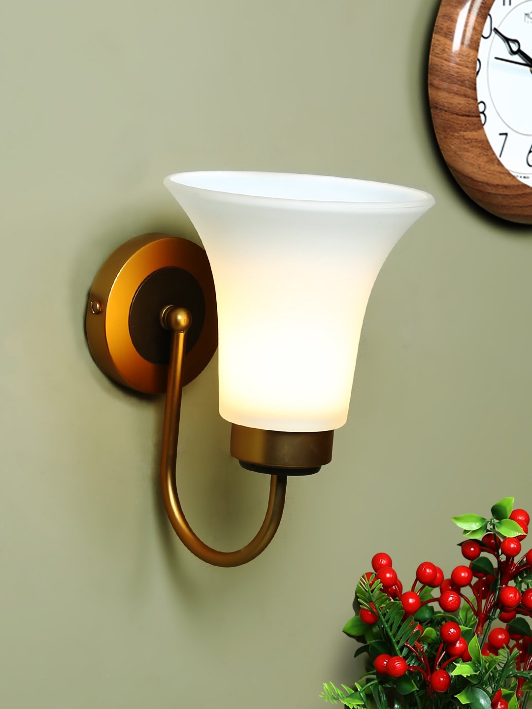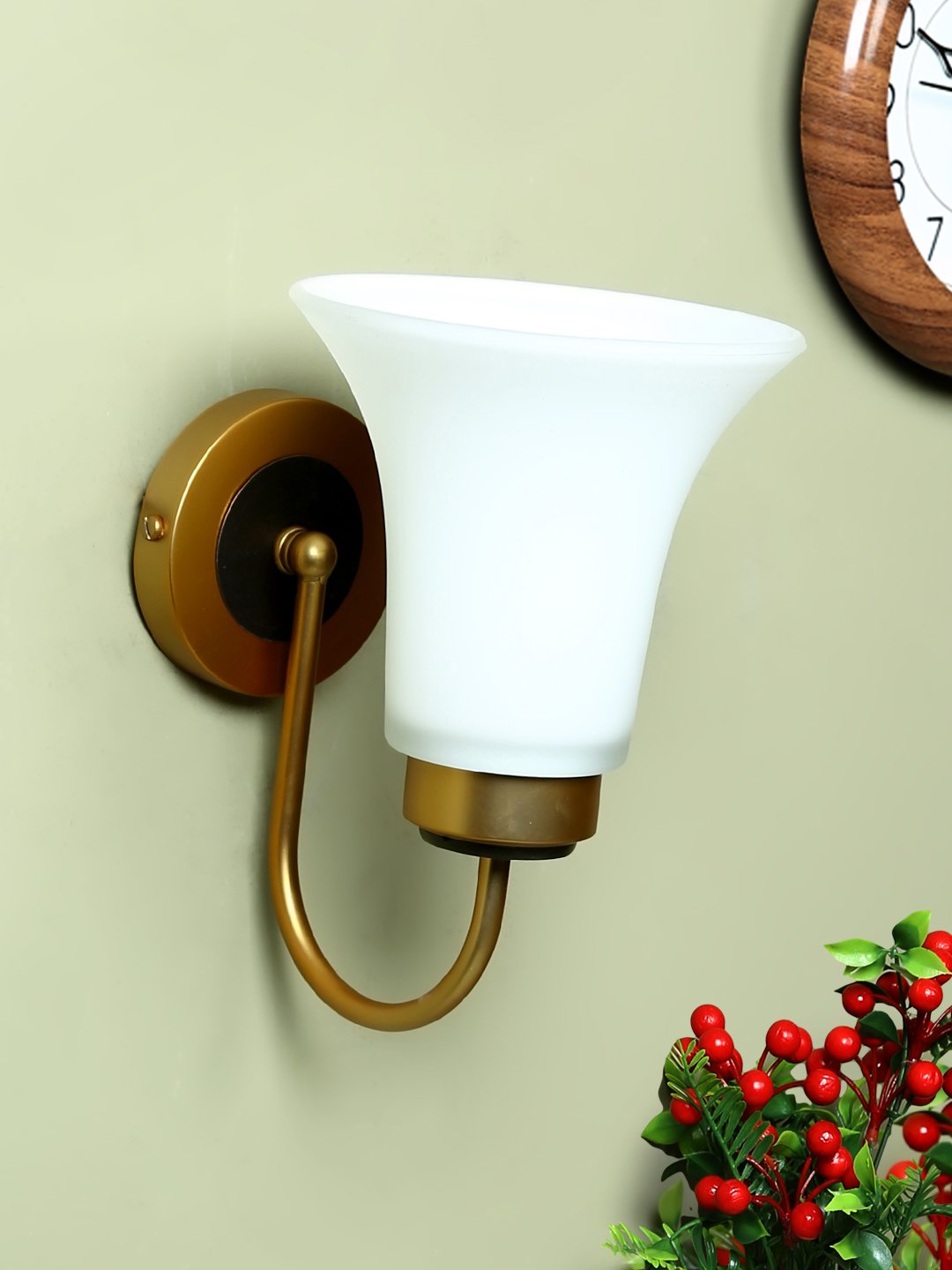 Antique brass dark brown (wood) finish single wall light having bell shaped white glass made of mild steel and wood. It is maintenance free., It is easy to remove glass and wash them. Comes with an E27 holder, only the change of lamp is required, which is available locally everywhere. Application includes both residential and commercial premises wherever it matches with your interiors. Matching double wall light code – WL2270. Matching chandelier code – CH361. Can be customized as per requirement in case of bulk quantities. Lamp not included.