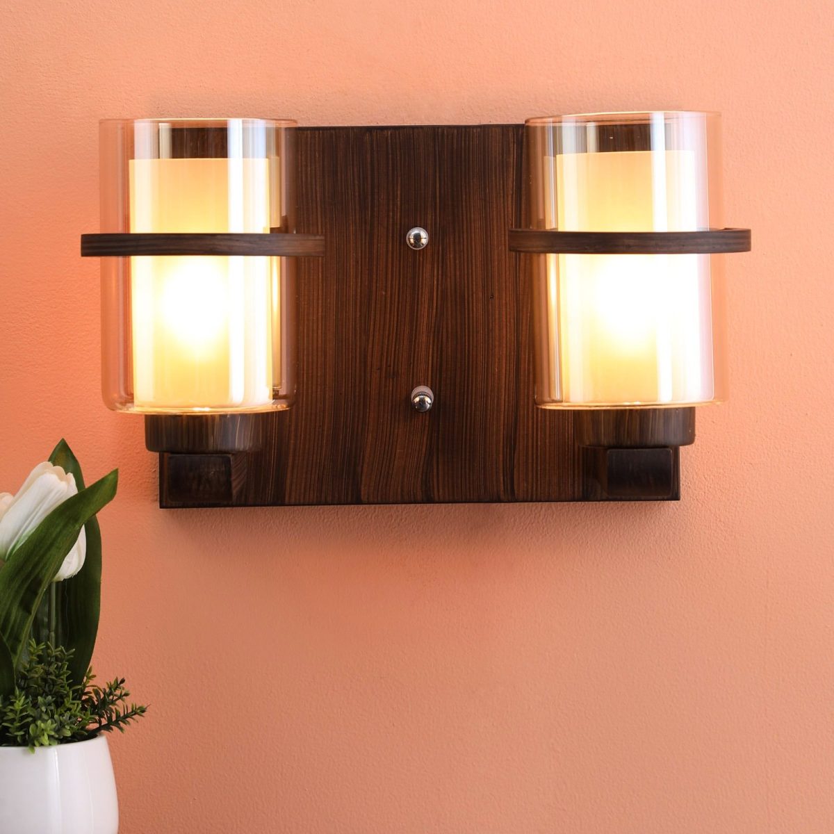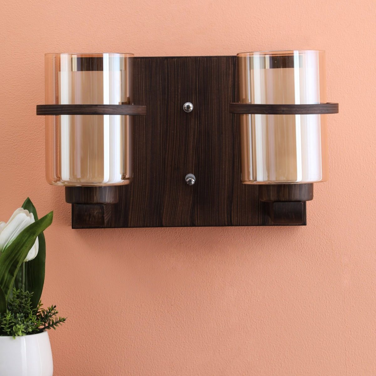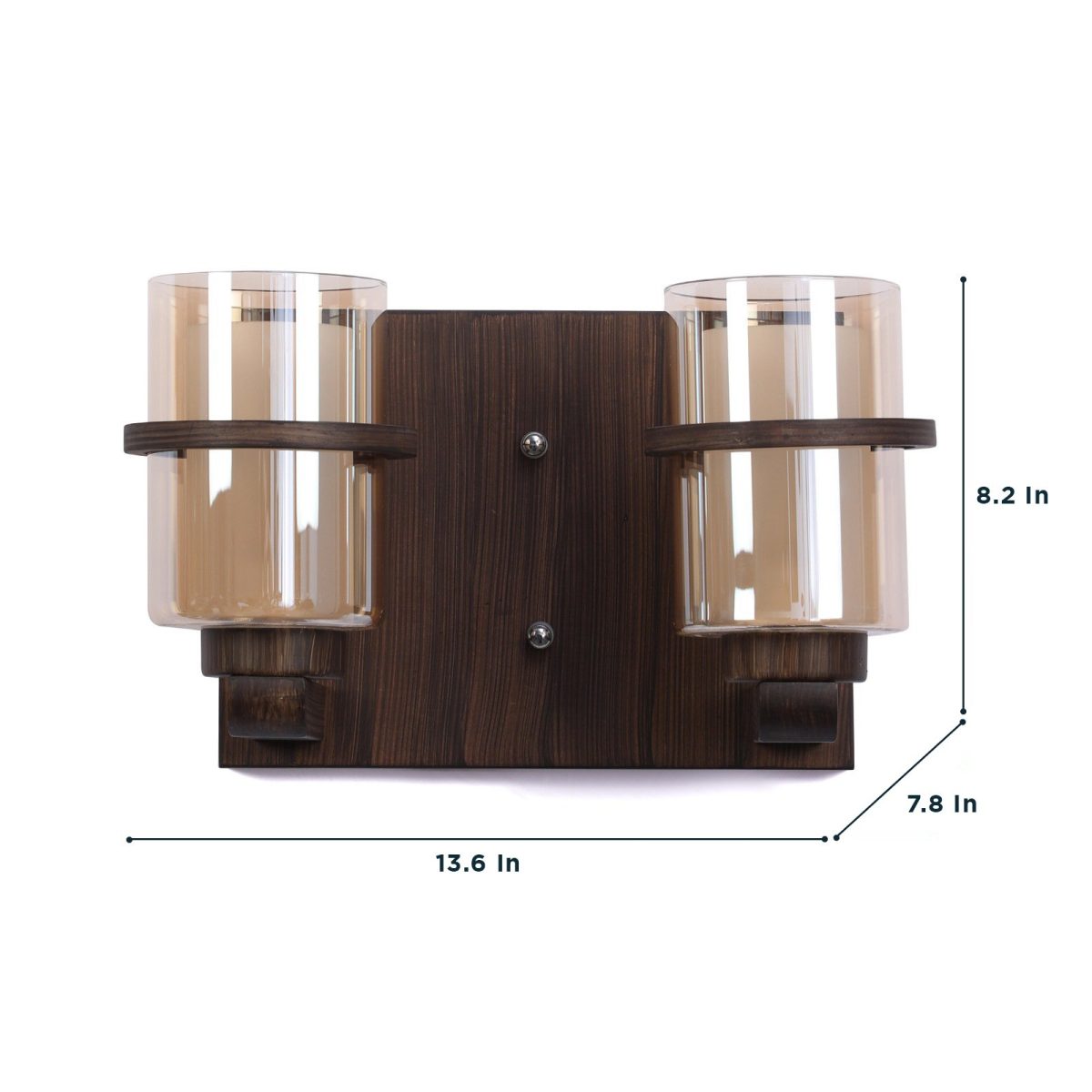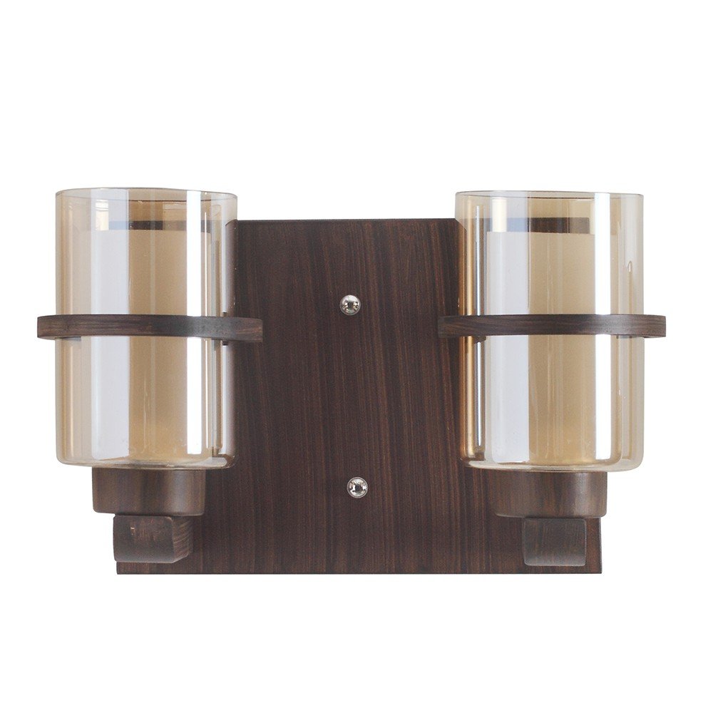 Dark brown (wood) finish, round, cylindrical two layered Champaign colored glasses, double wall light. It is maintenance free, easy to remove glass and wash them. Comes with an E27 holder, only the change of lamp is required, which is available locally everywhere. Application includes both residential and commercial premises wherever it matches with your interiors. Matching single wall light code WL2079. Matching chandelier code – CH347, CH429-8, CH429-13. Can be customized as per requirement in case of bulk quantities. This along with its variants are the best selling products in our catalogue. Lamp not included.