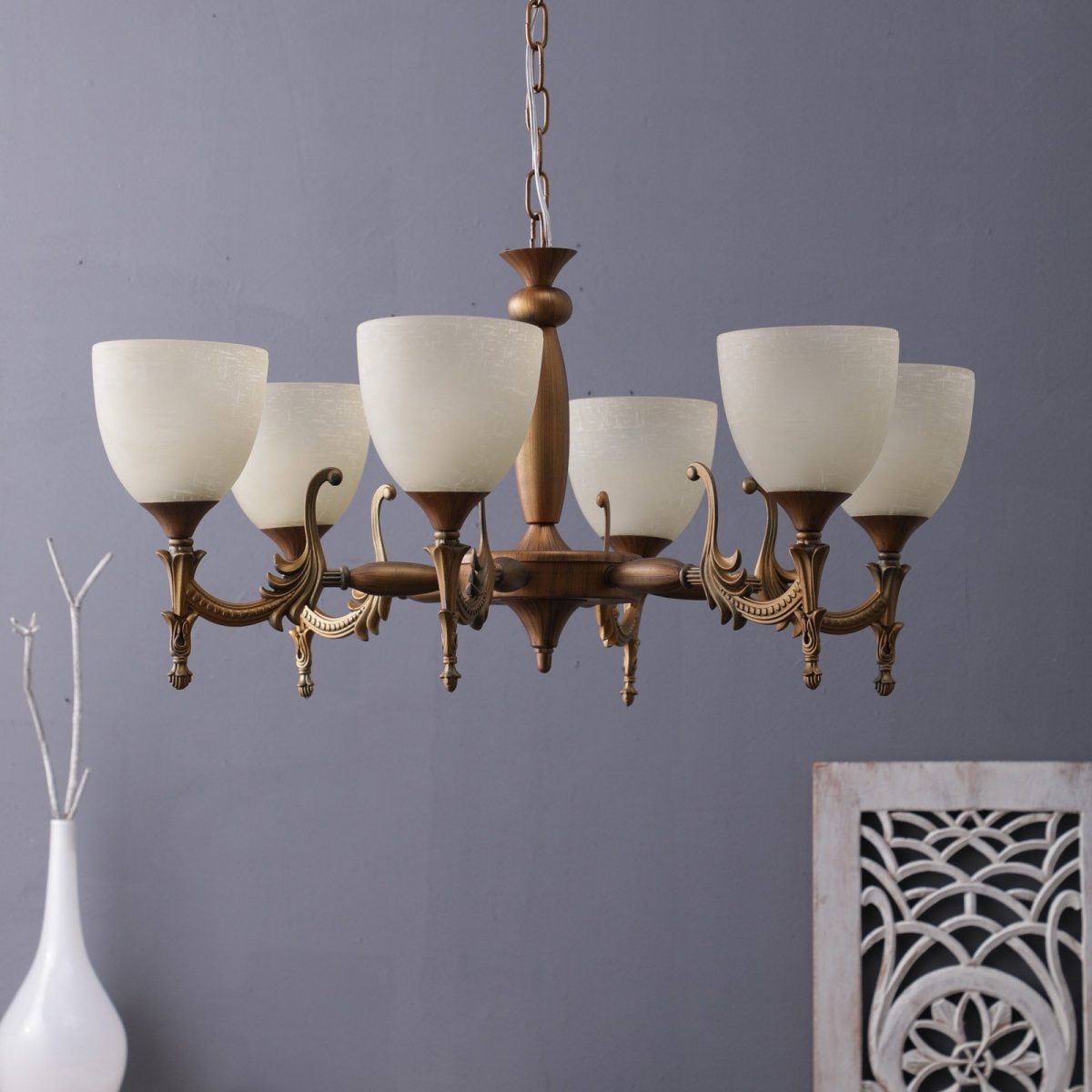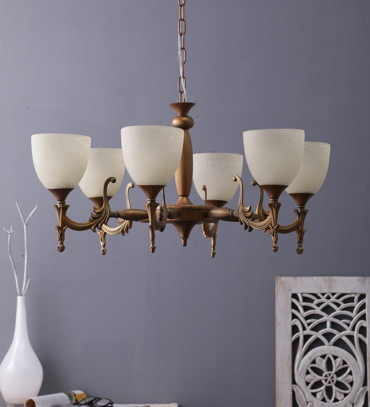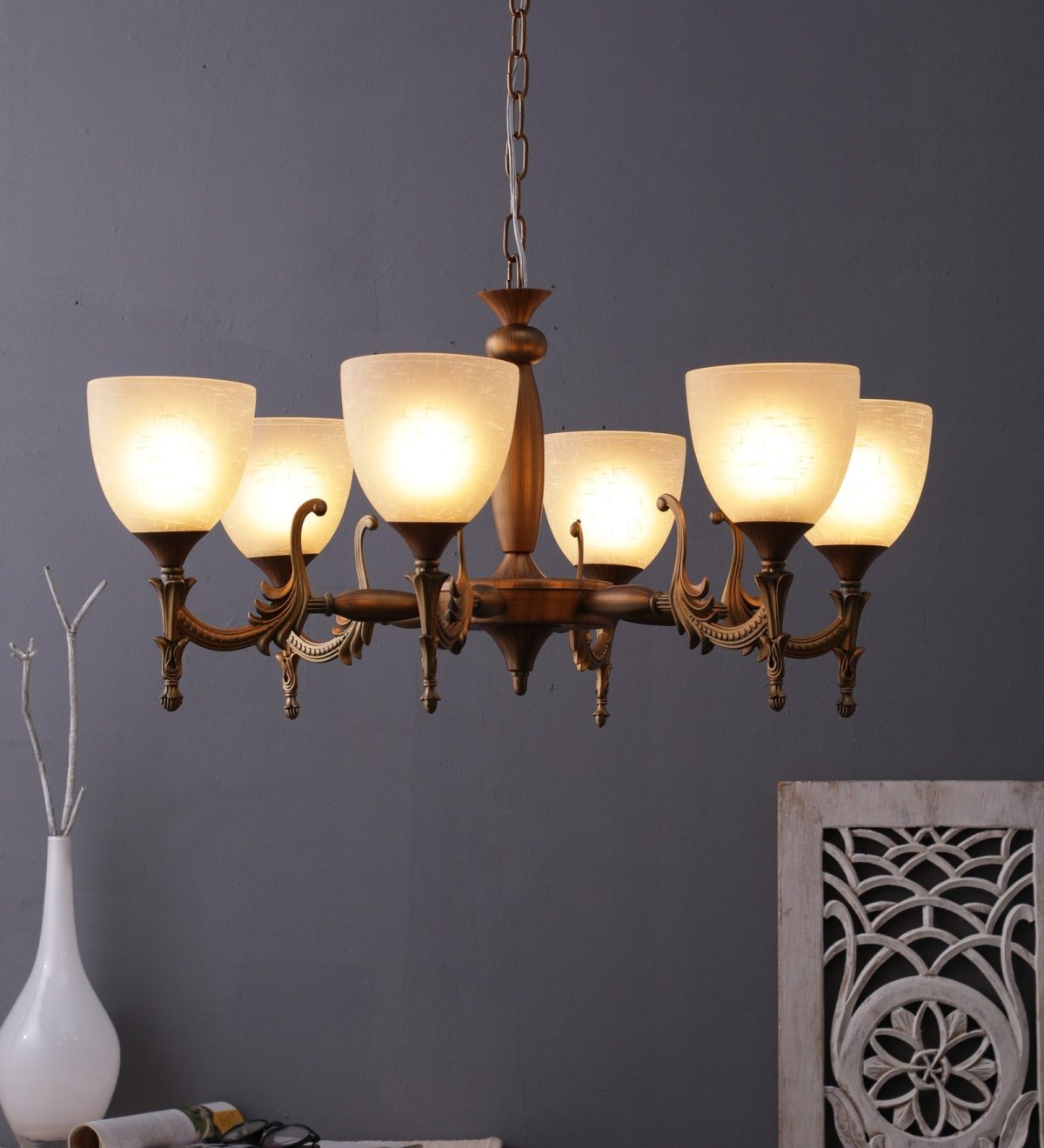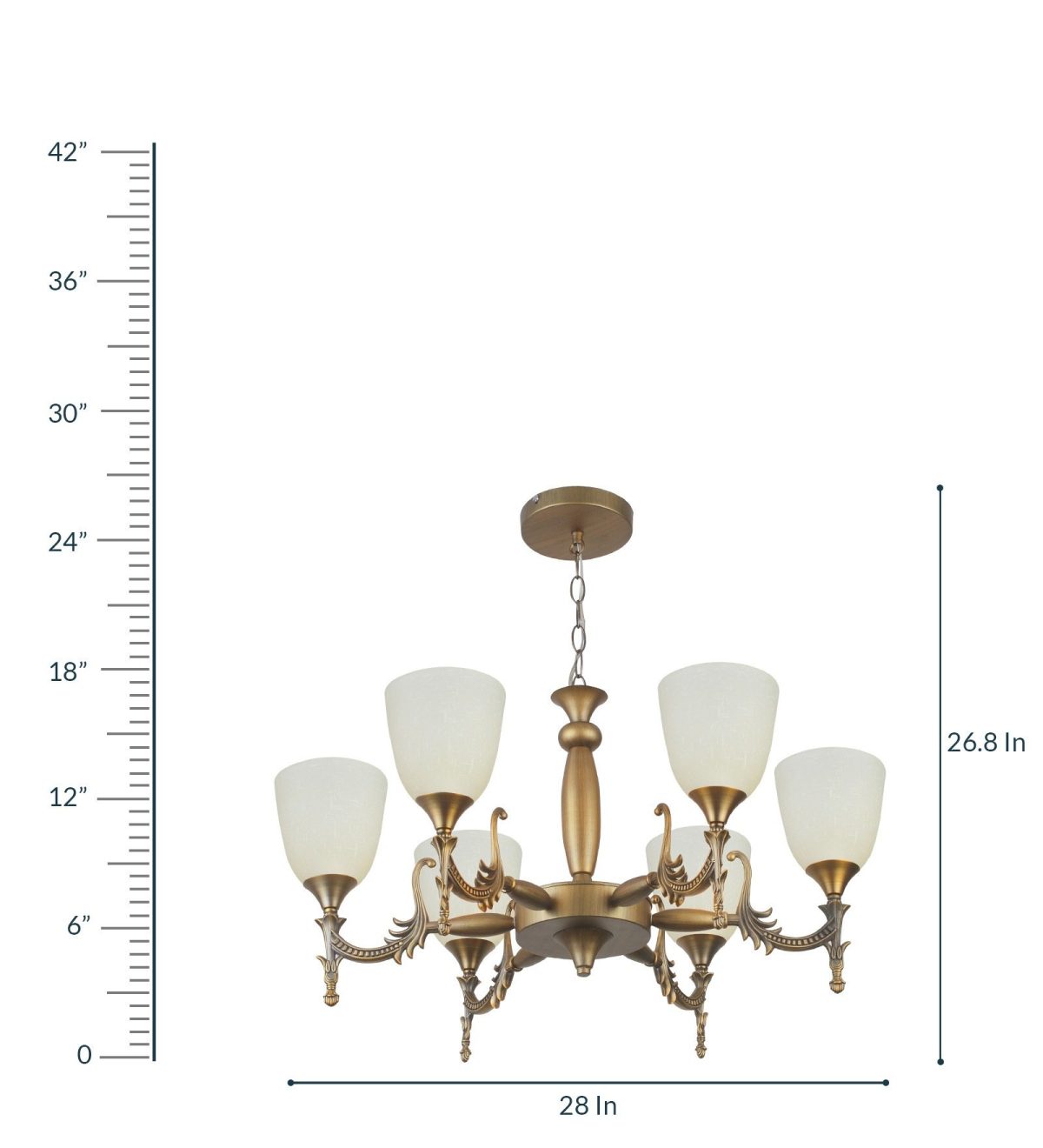 Antique brass finish, bell shaped, light yellow glass having a self textured design mounted on a designer frame made of mild steel having six lights. This is a hanging type chandelier in which the base plate is fixed to the ceiling with the help of straight clamp and screws. The suspension can be adjusted at time of installation to the desired height. It is maintenance free. It is easy to remove glass and wash them. Comes with an E27 holder, only the change of lamp is required, which is available locally everywhere. Application includes both residential and commercial premises wherever it matches with your interiors. Matching wall light code – WL2205, WL2206. Can be customized as per requirement in case of bulk quantities. This along with its variants are the best selling products in our catalogue. LAMP NOT INCLUDED.