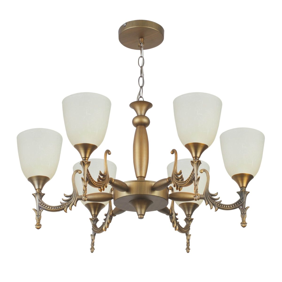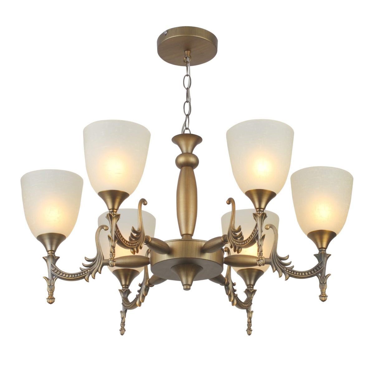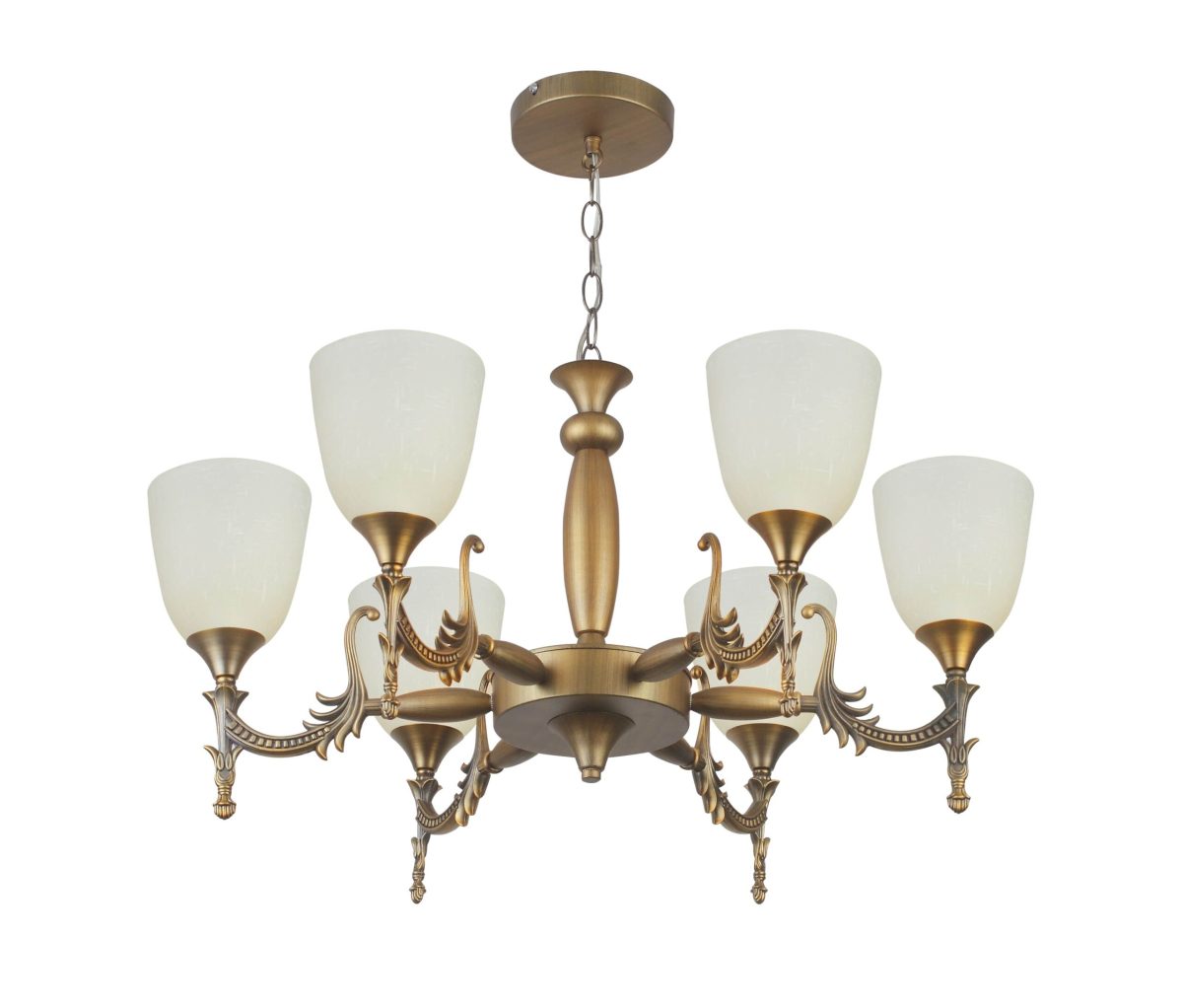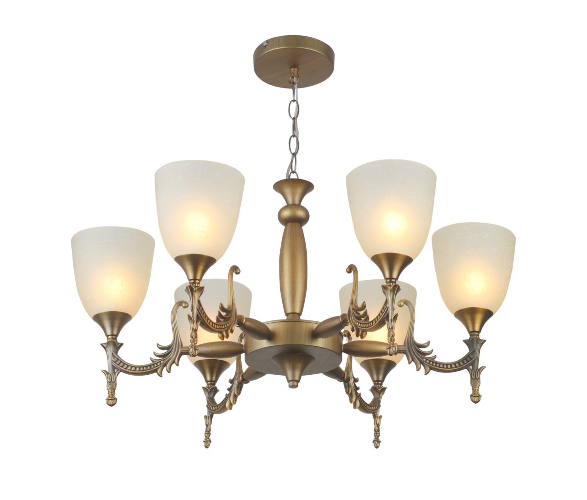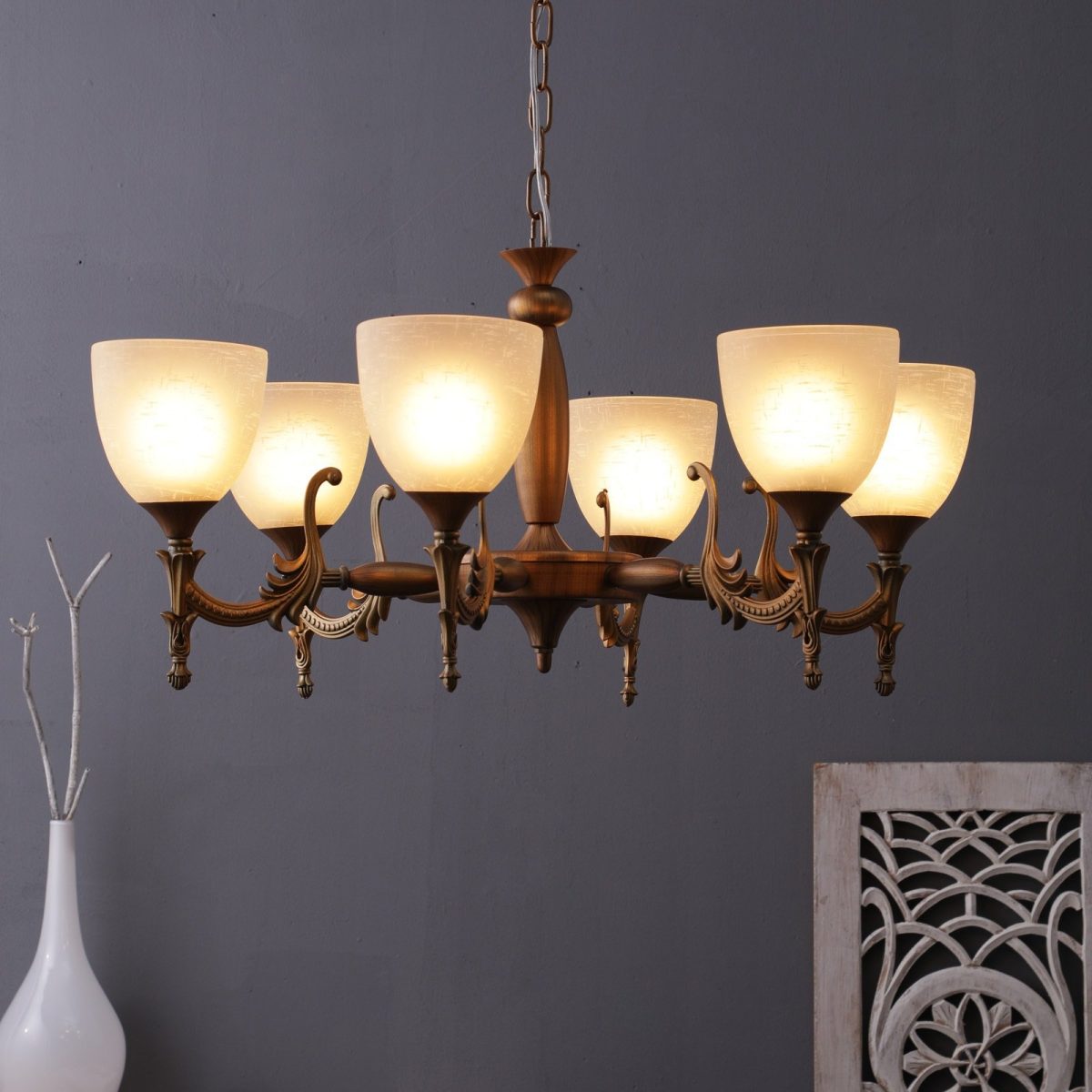 Antique brass finish, bell shaped, light yellow glass having a self textured design mounted on a designer frame made of mild steel having six lights. This is a hanging type chandelier in which the base plate is fixed to the ceiling with the help of straight clamp and screws. The suspension can be adjusted at time of installation to the desired height. It is maintenance free. It is easy to remove glass and wash them. Comes with an E27 holder, only the change of lamp is required, which is available locally everywhere. Application includes both residential and commercial premises wherever it matches with your interiors. Matching wall light code – WL2205, WL2206. Can be customized as per requirement in case of bulk quantities. This along with its variants are the best selling products in our catalogue. LAMP NOT INCLUDED.