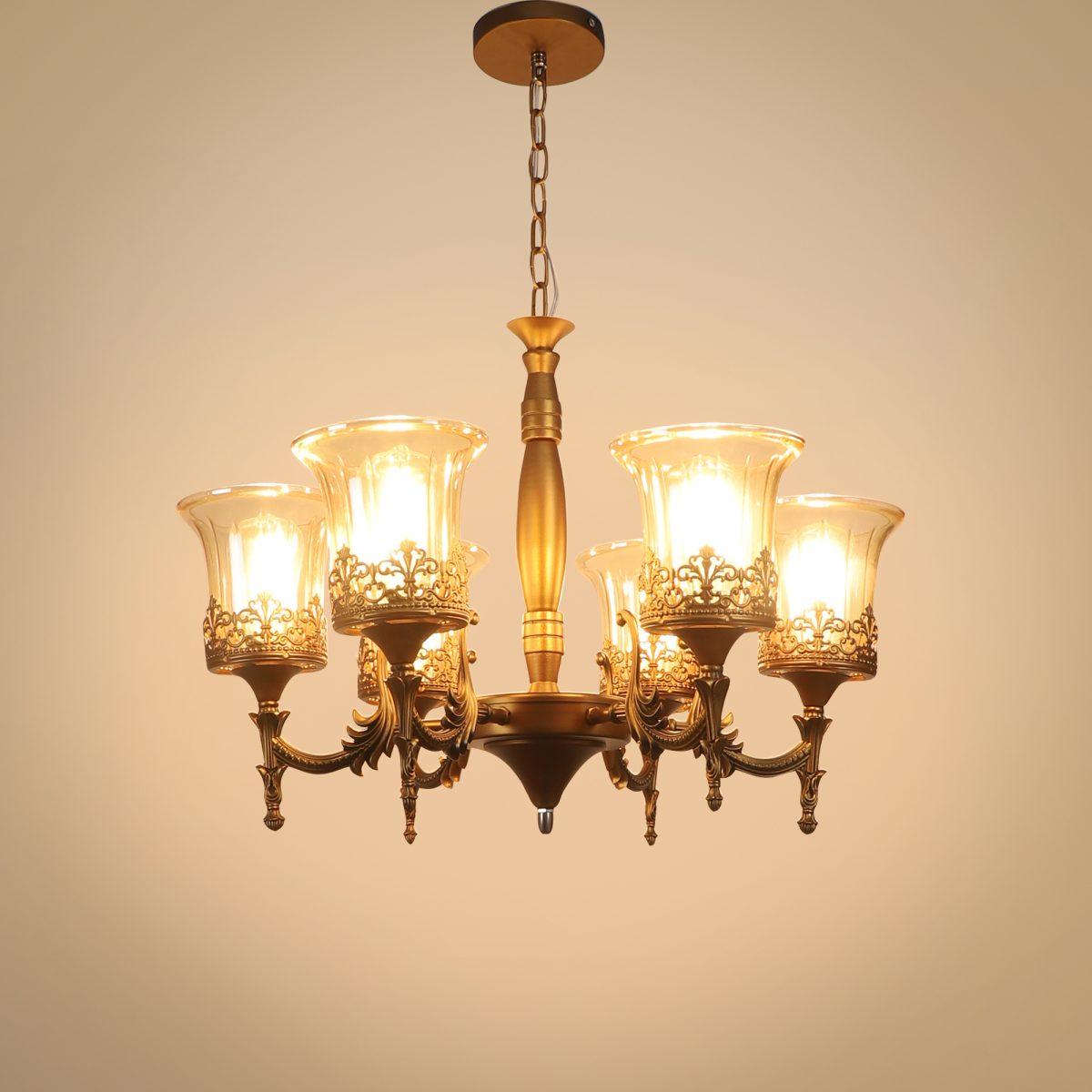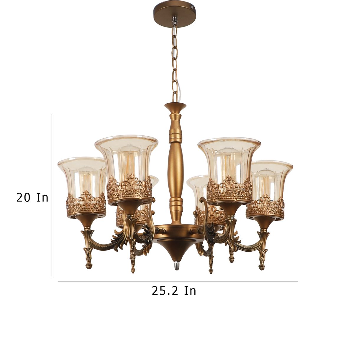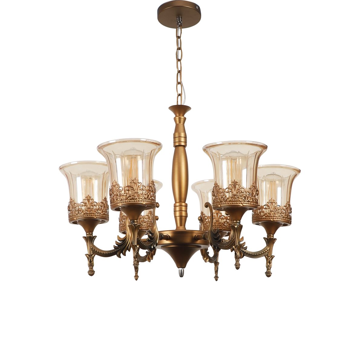 Antique brass, bell shaped champagne coloured glass mounted on a designer frame made of mild steel having six lights. This is a hanging type chandelier in which the base plate is fixed to the ceiling with the help of straight clamp and screws. The suspension can be adjusted at time of installation to the desired height. It is maintenance free. It is easy to remove glass and wash them. Comes with an E27 holder, only the change of lamp is required, which is available locally everywhere. Application includes both residential and commercial premises wherever it matches with your interiors. Matching hanging light ocde – HL5061-1, HL5061-3. Matching wall light code – WL2363, WL2364. Can be customized as per requirement in case of bulk quantities. LAMP NOT INCLUDED.