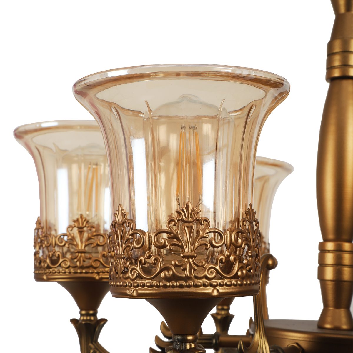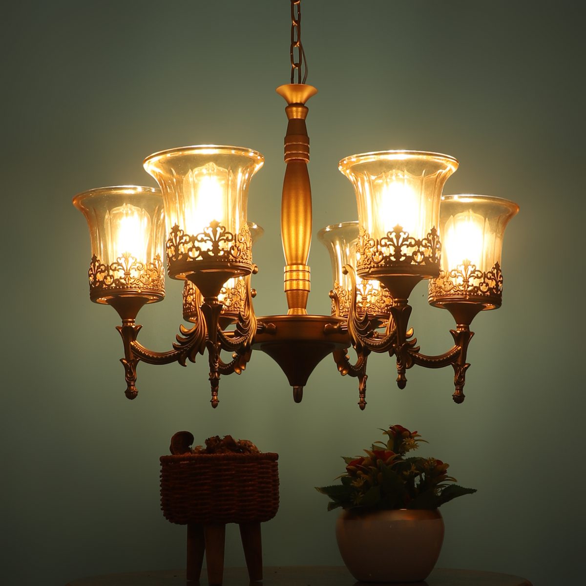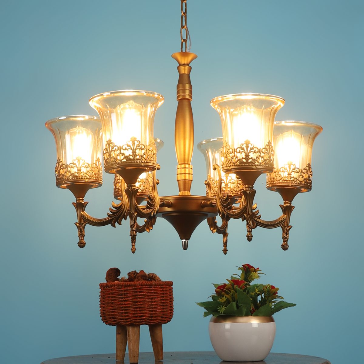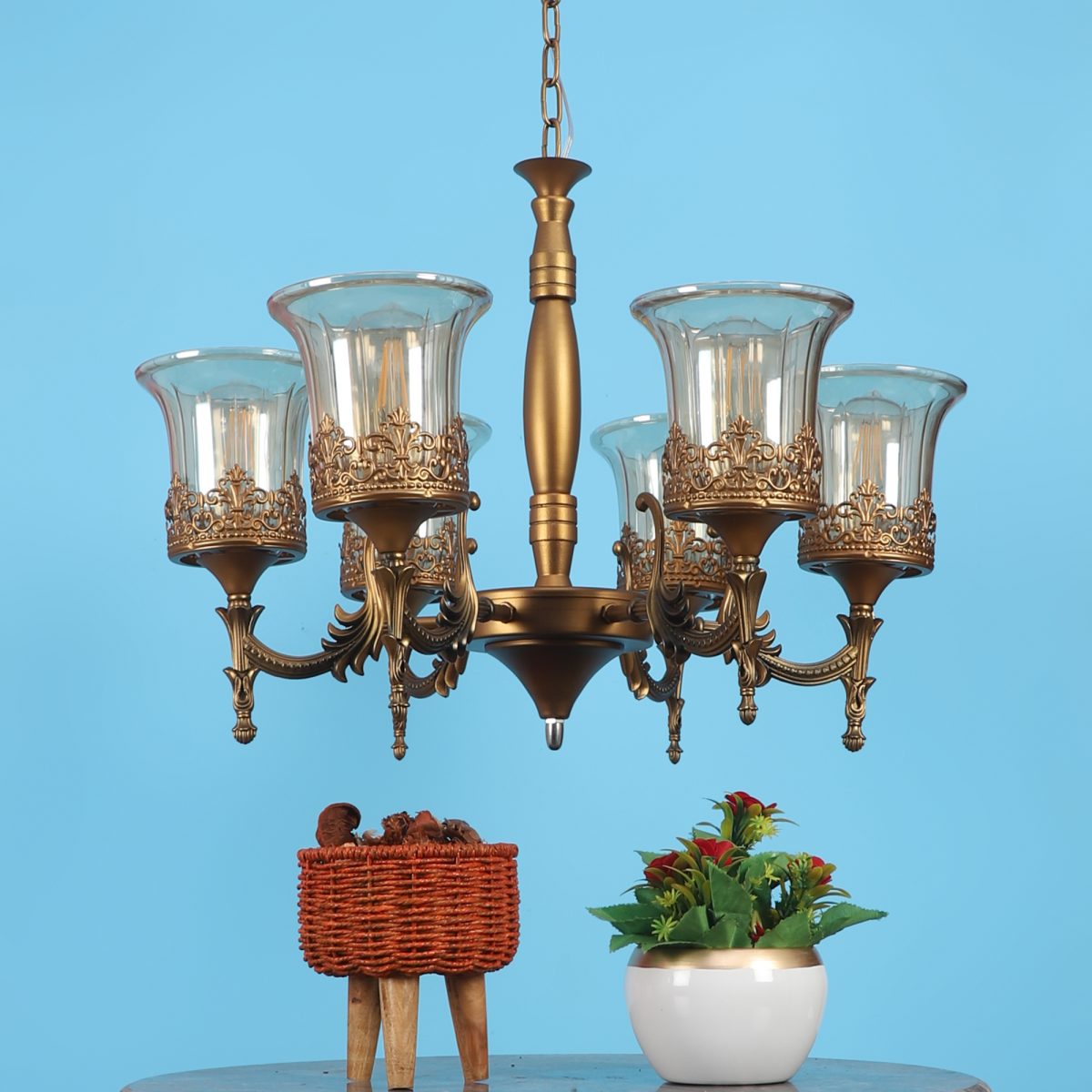 Antique brass, bell shaped champagne coloured glass mounted on a designer frame made of mild steel having six lights. This is a hanging type chandelier in which the base plate is fixed to the ceiling with the help of straight clamp and screws. The suspension can be adjusted at time of installation to the desired height. It is maintenance free. It is easy to remove glass and wash them. Comes with an E27 holder, only the change of lamp is required, which is available locally everywhere. Application includes both residential and commercial premises wherever it matches with your interiors. Matching hanging light ocde – HL5061-1, HL5061-3. Matching wall light code – WL2363, WL2364. Can be customized as per requirement in case of bulk quantities. LAMP NOT INCLUDED.
