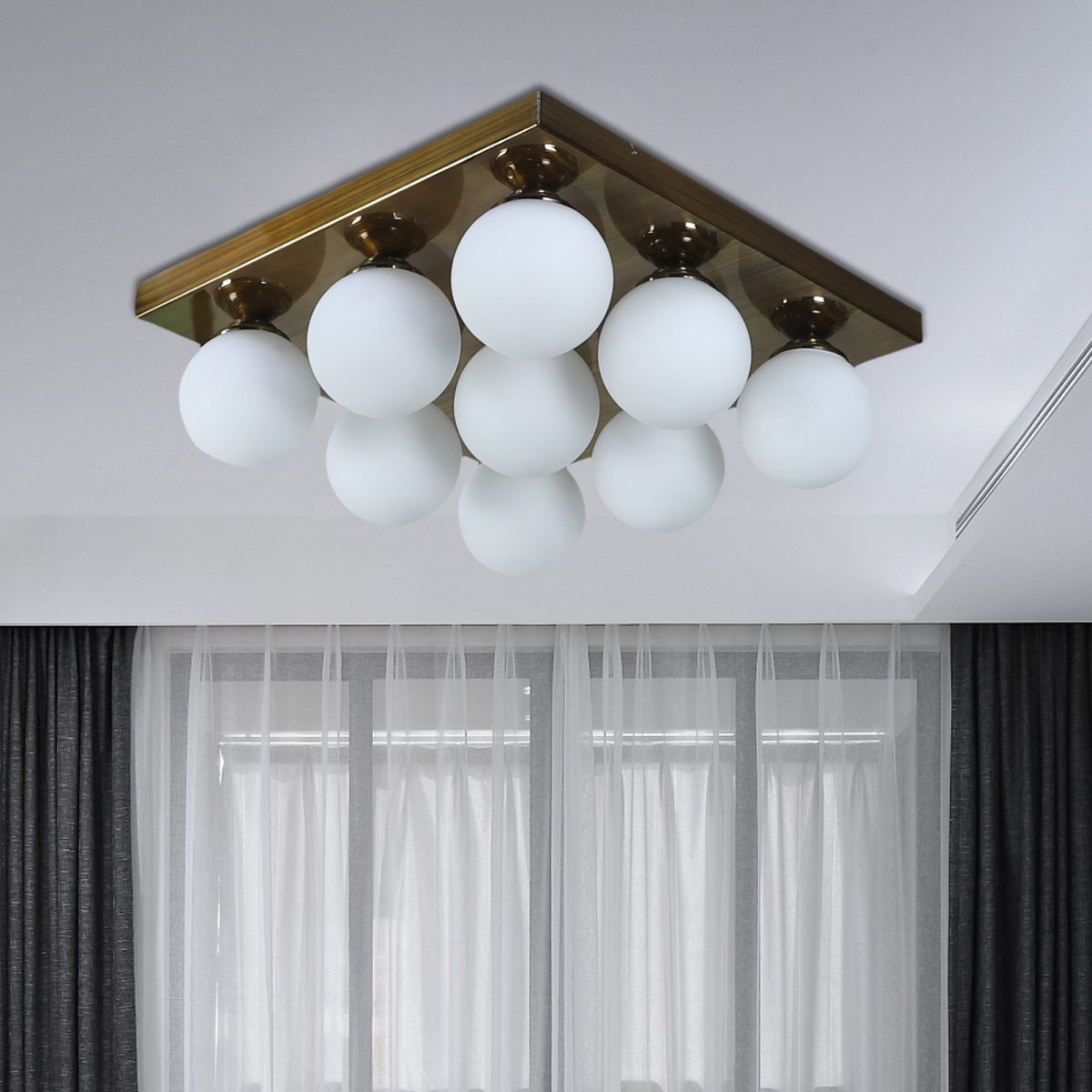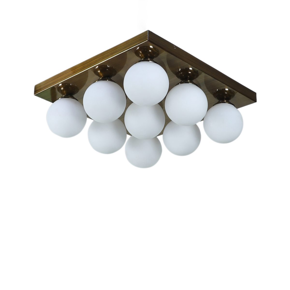 Antique gold finish, round globe (doom) glass mounted on a square plate made of mild steel having nine lights. This is a fixed type chandelier in which the base plate is fixed to the ceiling with the help of straight clamp and screws.It is maintenance free, glasses are closed from all the sides which prevents accumulation of dust and it is easy to remove glass and wash them. Comes with an E27 holder, only the change of lamp is required, which is available locally everywhere. Application includes both residential and commercial premises wherever it matches with your interiors. Matching chandelier variations – CH400-4. Matching hanging variations – HL-4100-4, HL4100-9. Can be customized as per requirement in case of bulk quantities.This along with its variants are the best selling products in our catalogue. LAMP NOT INCLUDED.