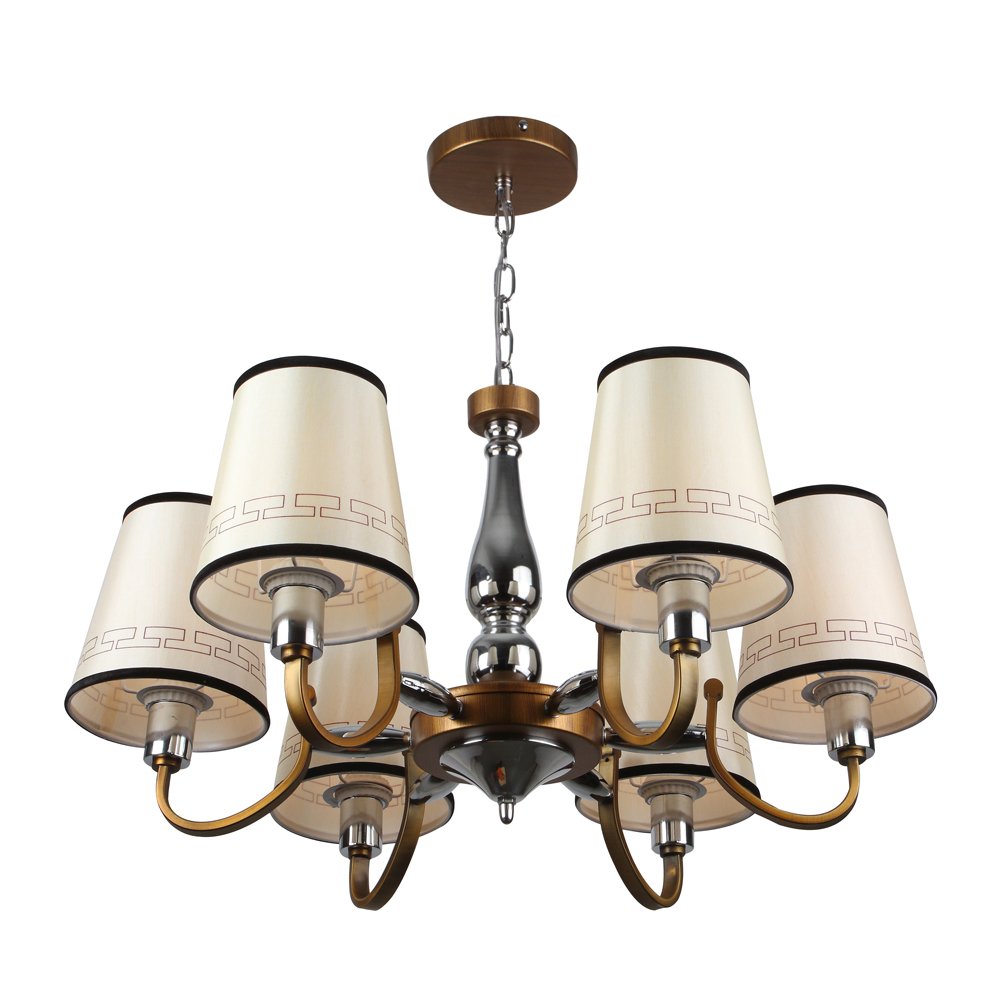 Antique brass, chrome finish, taper fabric shade off white having brown borders mounted on a designer frame made of mild steel having six lights. This is a hanging type chandelier in which the base plate is fixed to the ceiling with the help of straight clamp and screws. The suspension can be adjusted at time of installation to the desired height. It is maintenance free. Comes with an E27 holder, only the change of lamp is required, which is available locally everywhere. Application includes both residential and commercial premises wherever it matches with your interiors. Matching wall light code – WL2185, WL2186. Can be customized as per requirement in case of bulk quantities. LAMP NOT INCLUDED.