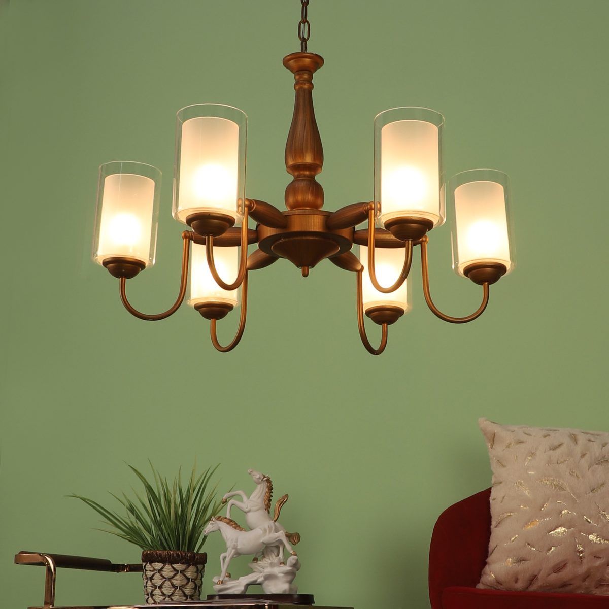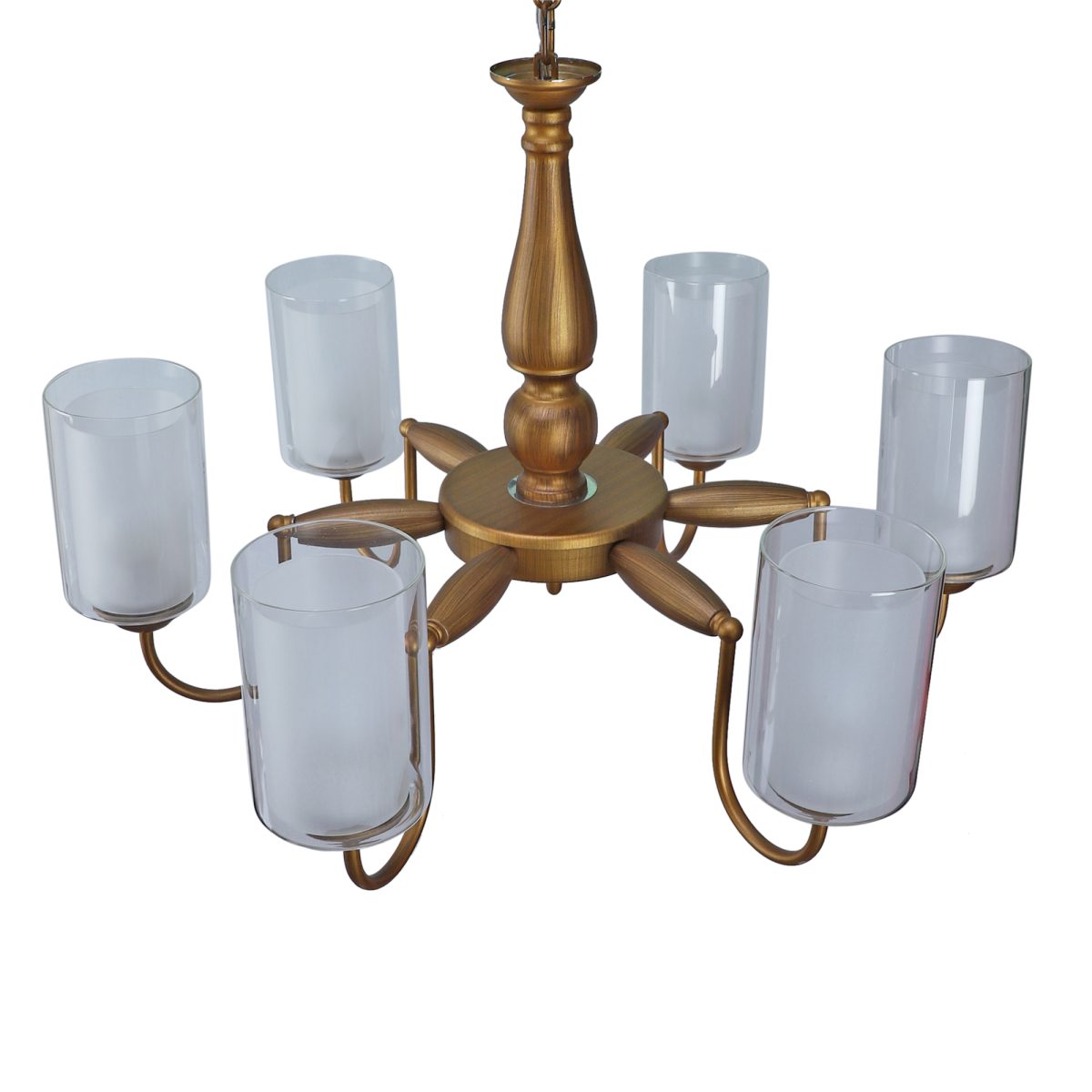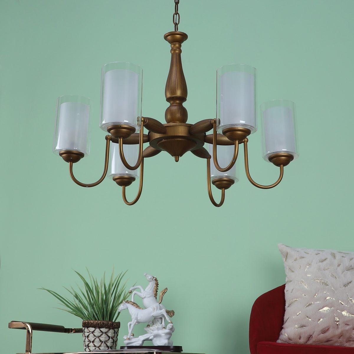 Antique gold finish, round, cylindrical two layered glass mounted on a designer frame made of mild steel having six lights. This is a hanging type chandelier in which the base plate is fixed to the ceiling with the help of straight clamp and screws. The suspension can be adjusted at time of installation to the desired height. It is maintenance free, easy to remove glass and wash them, comes with an E27 holder, only the change of lamp is required, which is available locally everywhere. Application includes both residential and commercial premises wherever it matches with your interiors. Matching wall light code WL2401, WL2402. Can be customized as per requirement in case of bulk quantities. LAMP NOT INCLUDED.