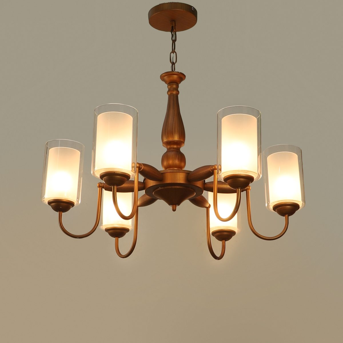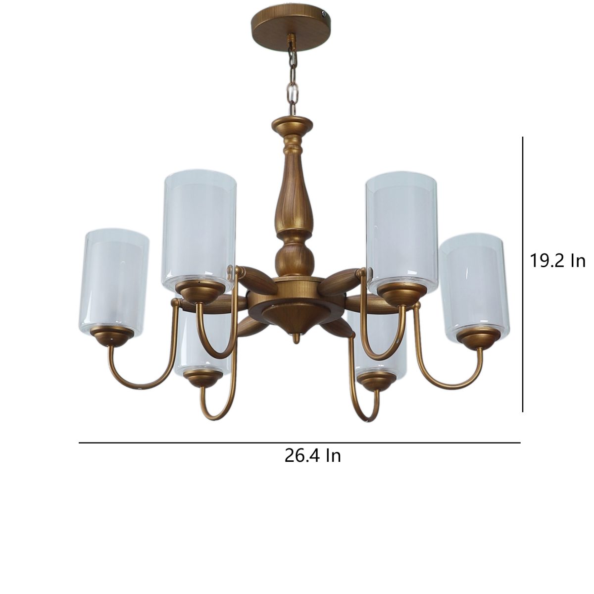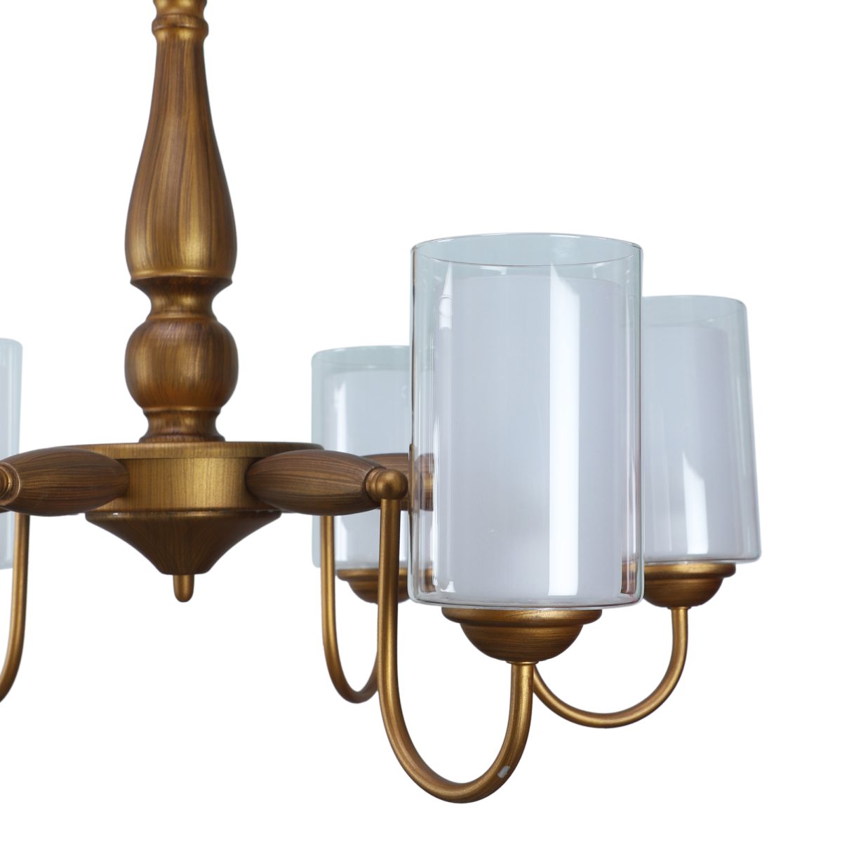 Antique gold finish, round, cylindrical two layered glass mounted on a designer frame made of mild steel having six lights. This is a hanging type chandelier in which the base plate is fixed to the ceiling with the help of straight clamp and screws. The suspension can be adjusted at time of installation to the desired height. It is maintenance free, easy to remove glass and wash them, comes with an E27 holder, only the change of lamp is required, which is available locally everywhere. Application includes both residential and commercial premises wherever it matches with your interiors. Matching wall light code WL2401, WL2402. Can be customized as per requirement in case of bulk quantities. LAMP NOT INCLUDED.