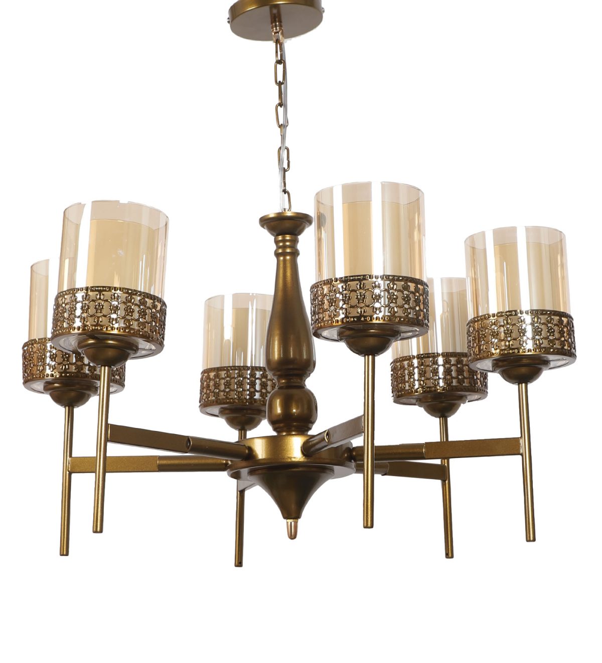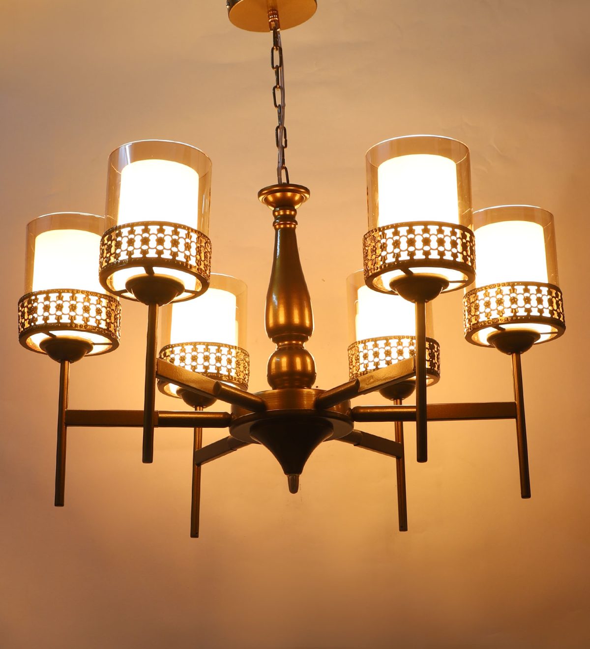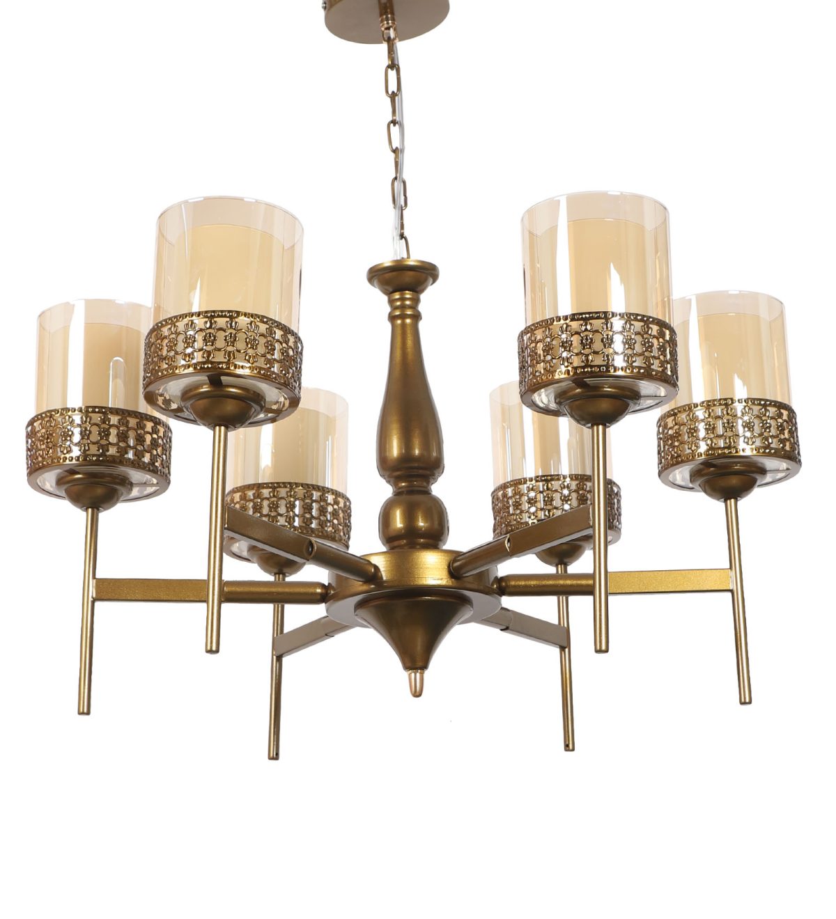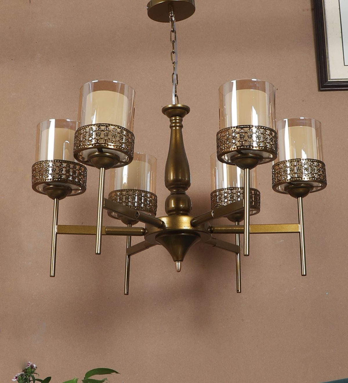 Antique finish chandellier having six lights.The suspension can be adjusted at time of installation to the desired height. It is maintenance free, it is easy to remove glasses and wash them. Comes with an E27 holder. Can be customized as per requirement even for small quantities. Other sizes can be made as per reruirement. LAMP NOT INCLUDED.