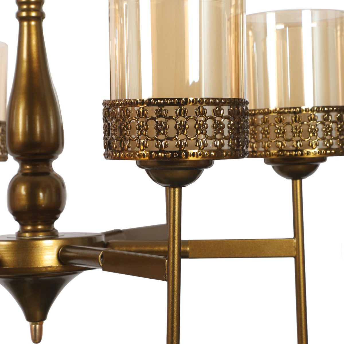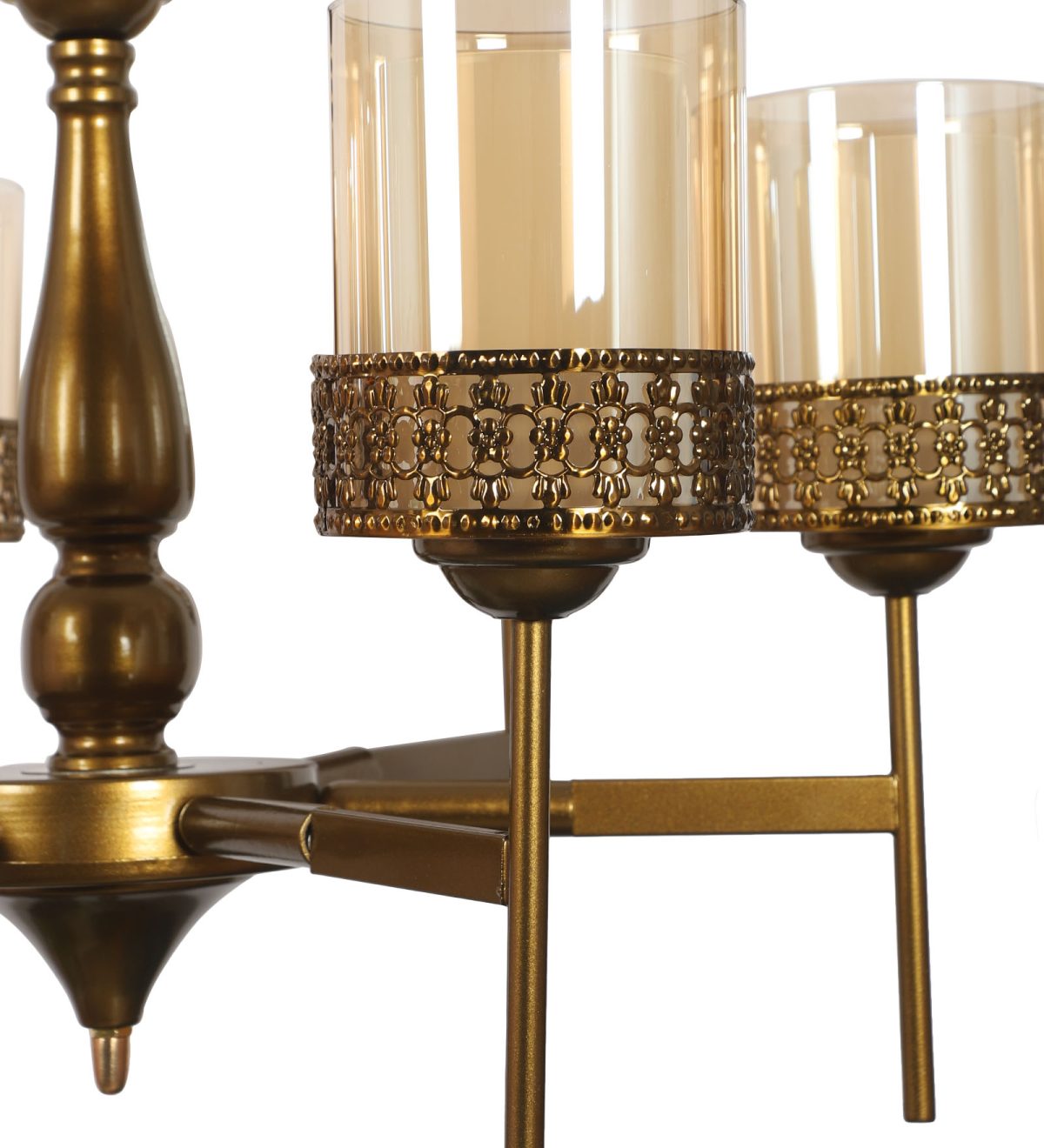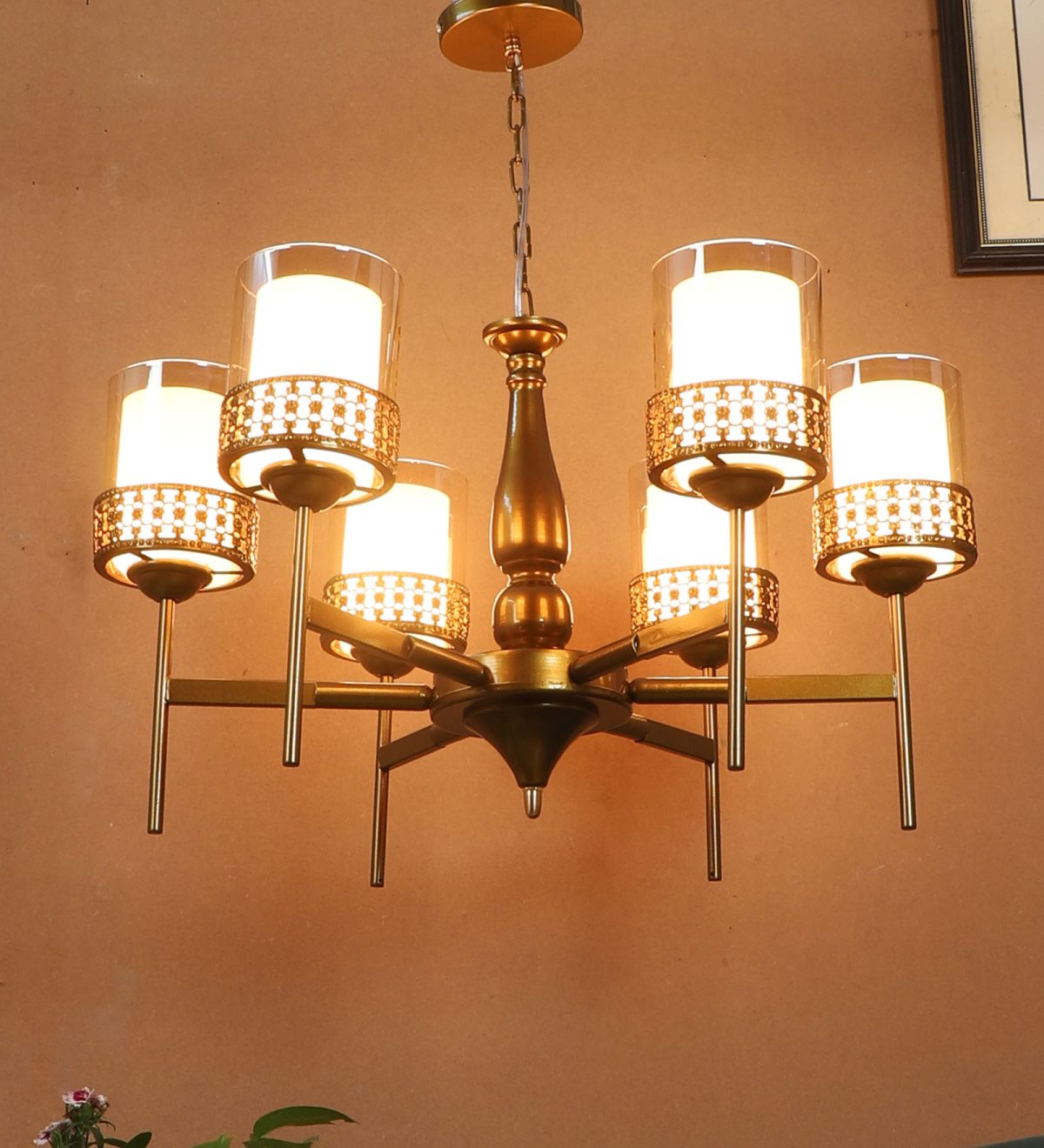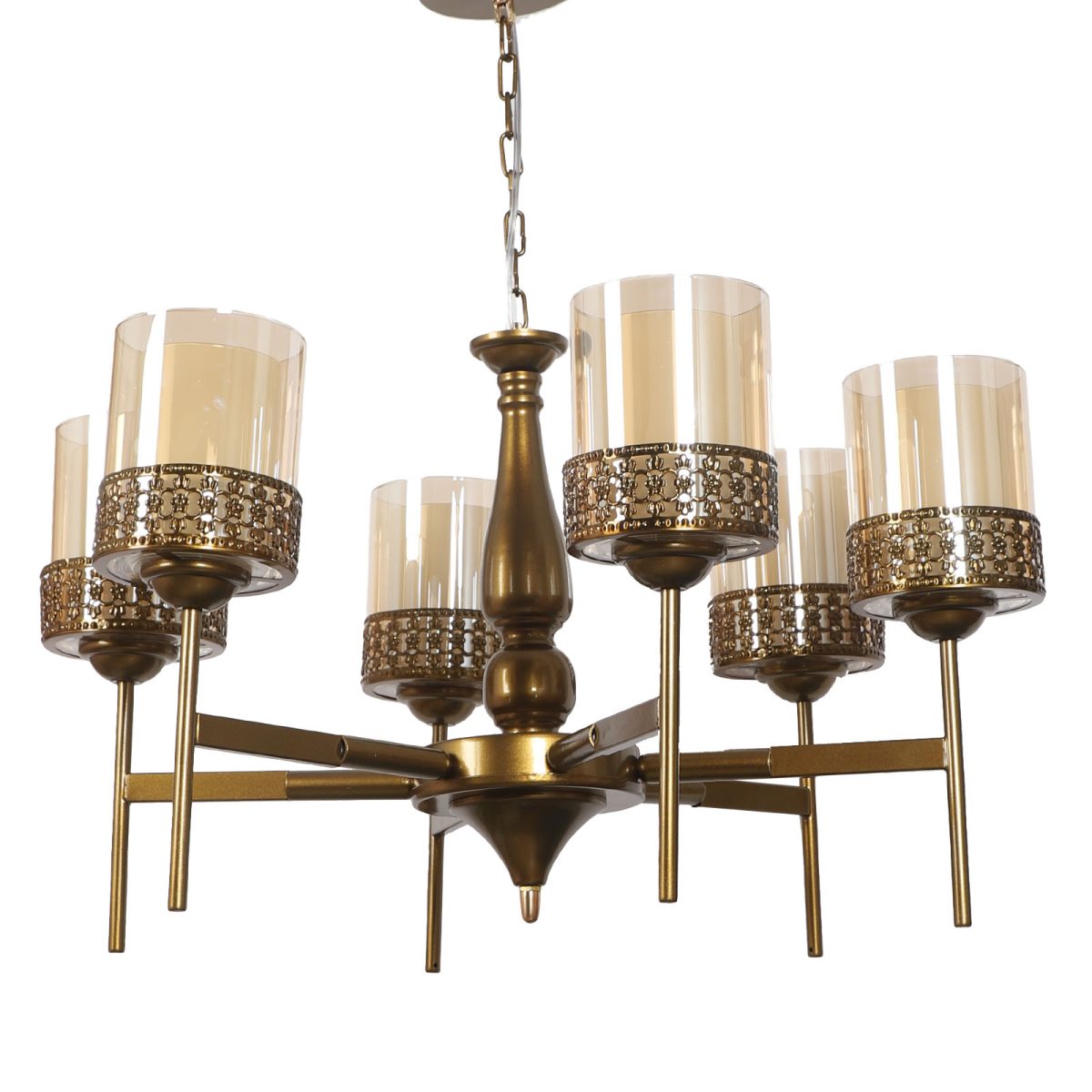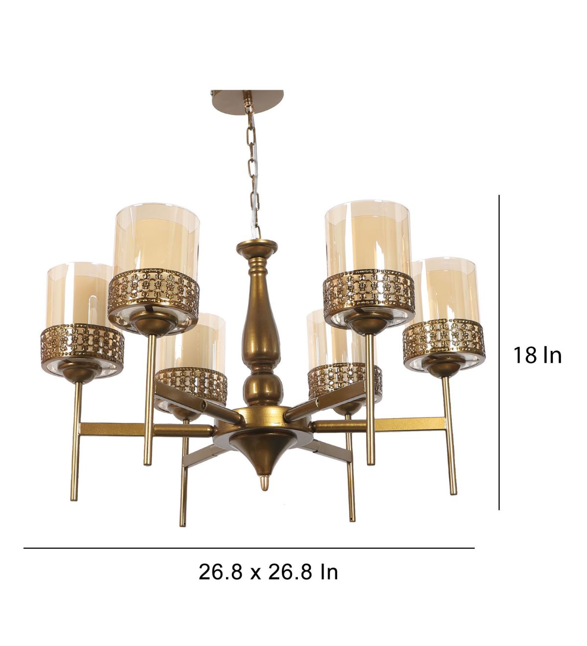 Antique finish chandellier having six lights.The suspension can be adjusted at time of installation to the desired height. It is maintenance free, it is easy to remove glasses and wash them. Comes with an E27 holder. Can be customized as per requirement even for small quantities. Other sizes can be made as per reruirement. LAMP NOT INCLUDED.