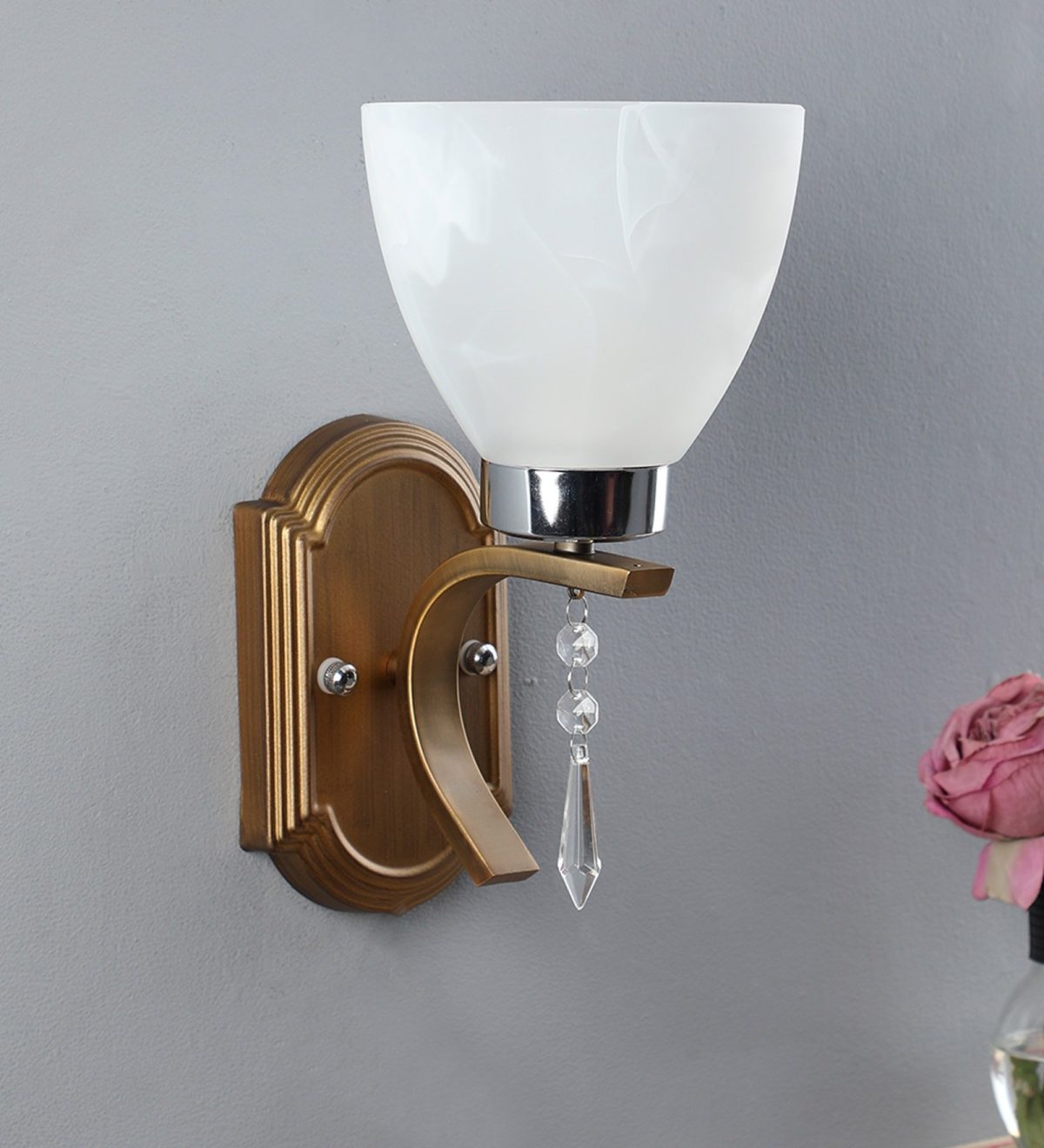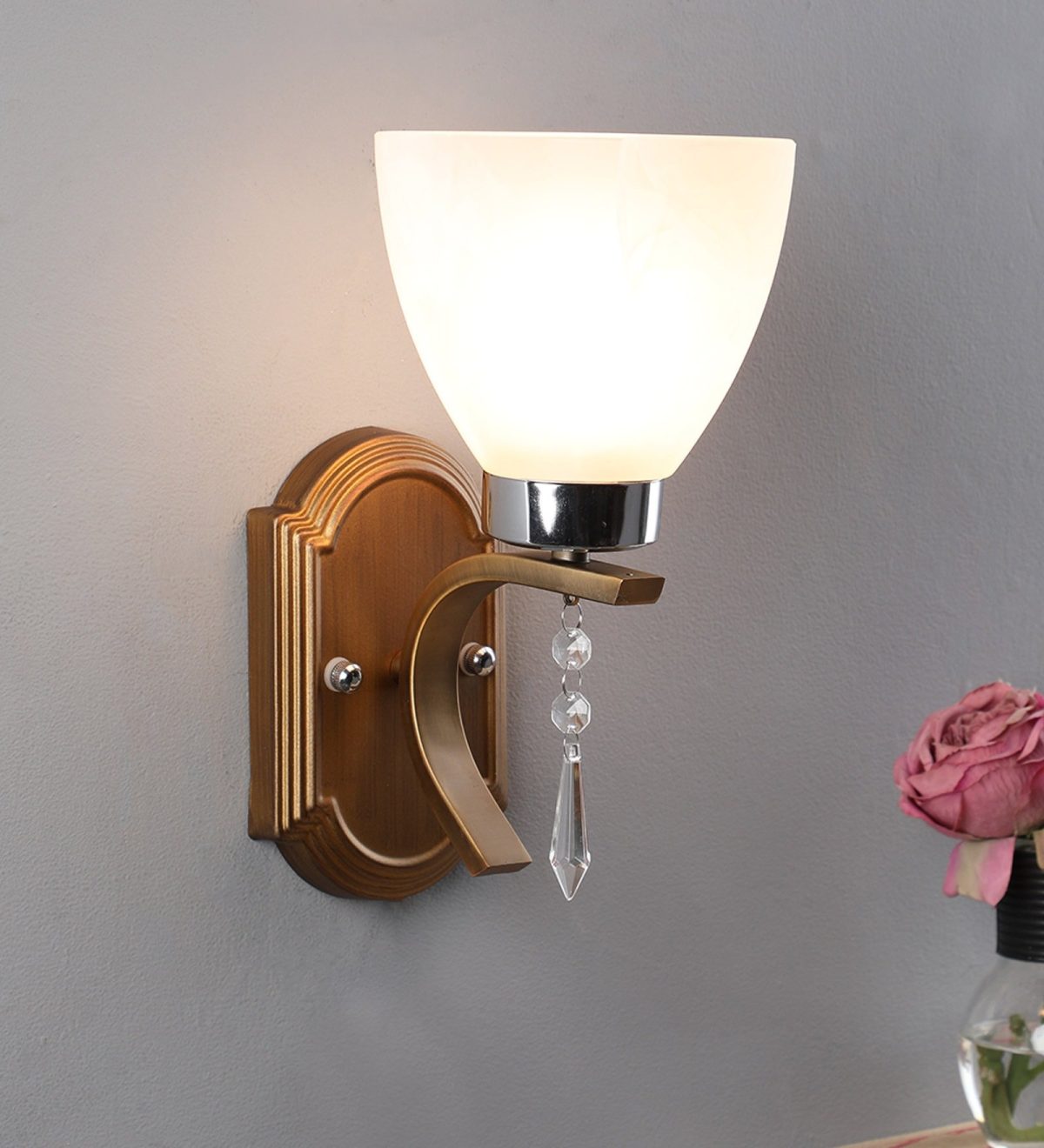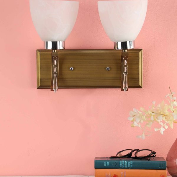 Antique brass, chrome finish single wall light having taper white glass having a self textured design made of mild steel. Looks amazing when lit. It is maintenance free. It is easy to remove glass and wash it. Comes with an E27 holder, only the change of lamp is required, which is available locally everywhere. Application includes both residential and commercial premises wherever it matches with your interiors. Matching double wall light code – WL1939. Can be customized as per requirement in case of bulk quantities. Lamp not included.
