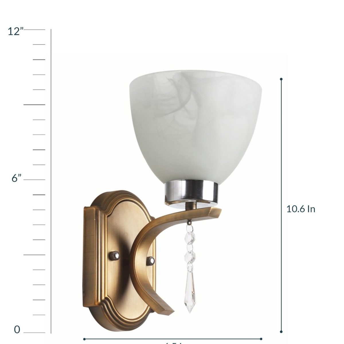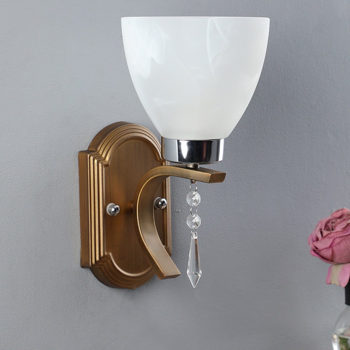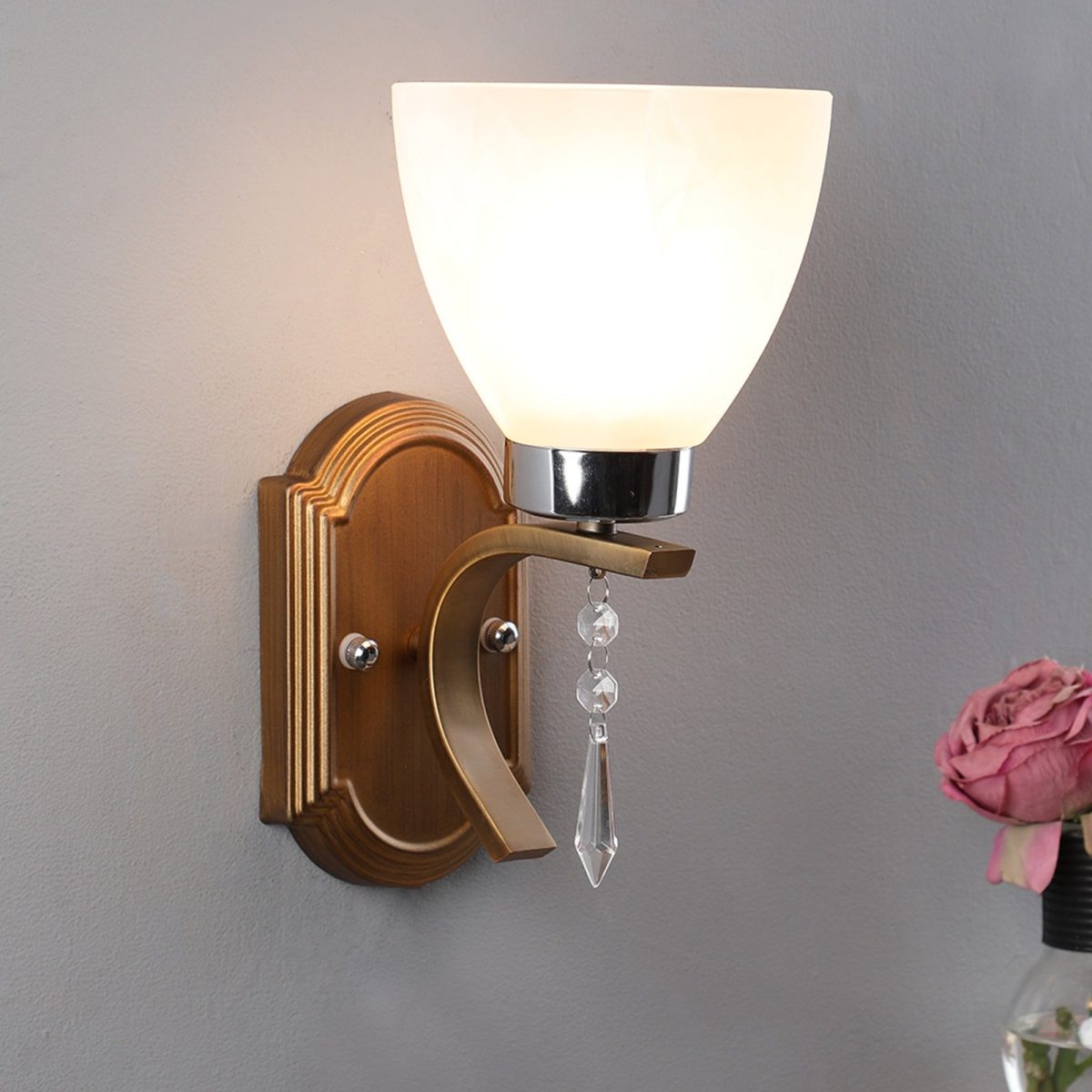 Antique brass, chrome finish single wall light having taper white glass having a self textured design made of mild steel. Looks amazing when lit. It is maintenance free. It is easy to remove glass and wash it. Comes with an E27 holder, only the change of lamp is required, which is available locally everywhere. Application includes both residential and commercial premises wherever it matches with your interiors. Matching double wall light code – WL1939. Can be customized as per requirement in case of bulk quantities. Lamp not included.