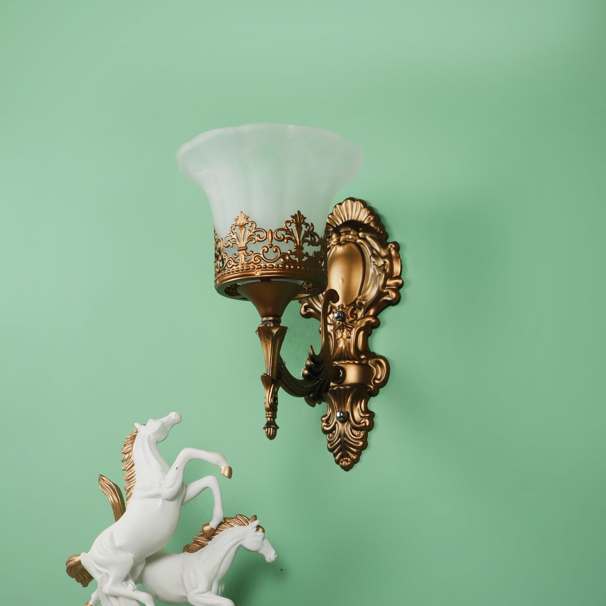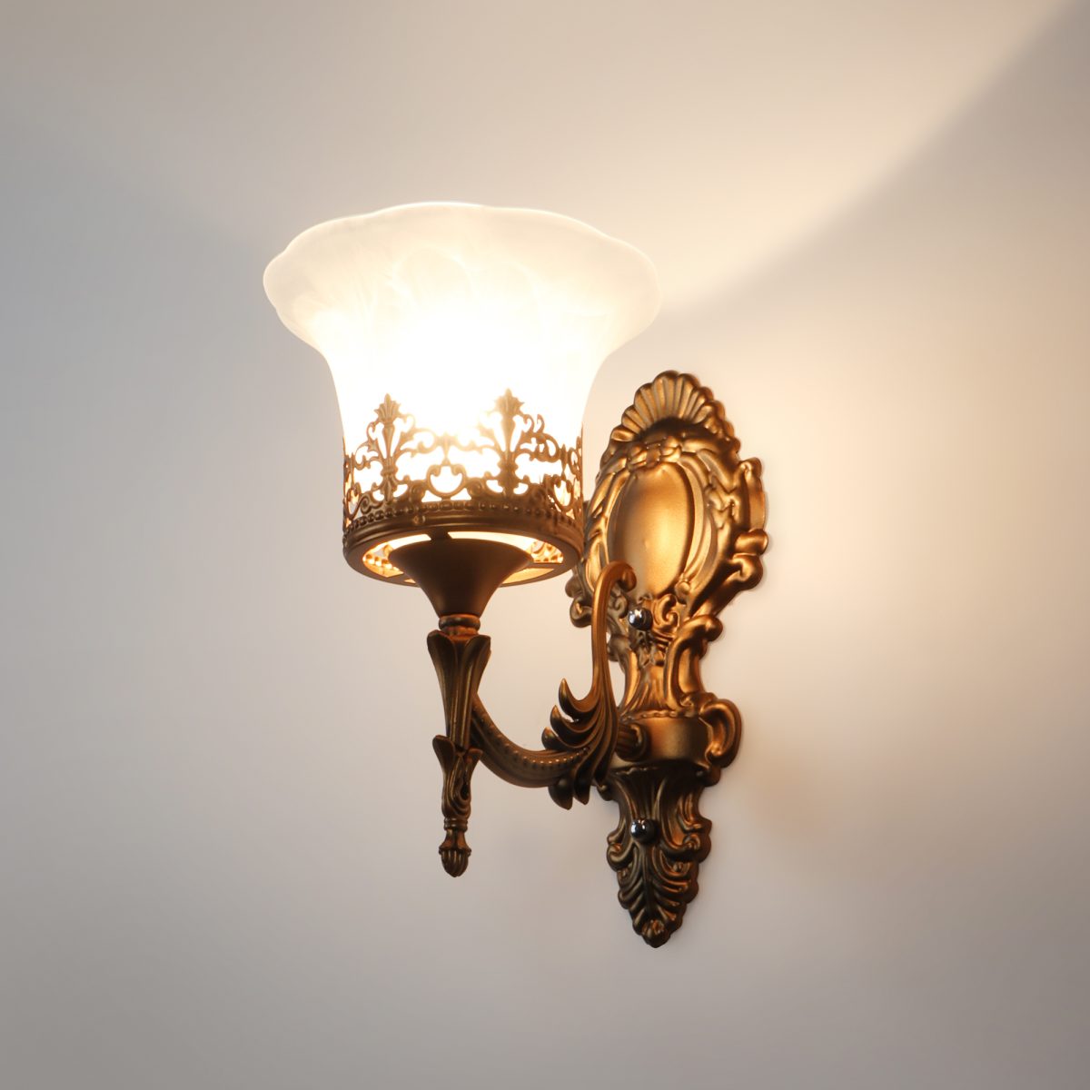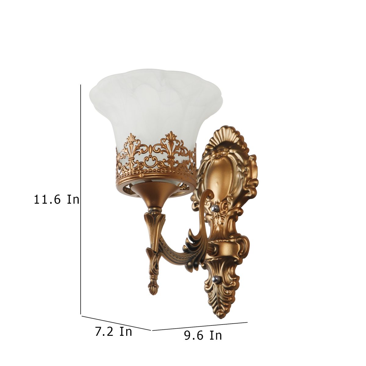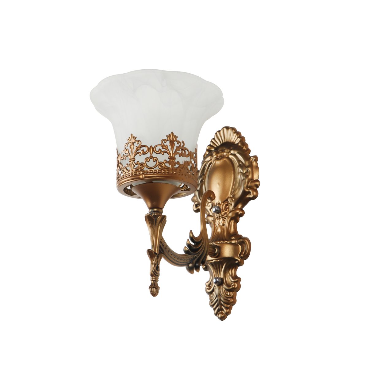 Antique gold finish, single wall light having flower shaper self textured glass made of mild steel. It is maintenance free, easy to remove glass and wash them, comes with an E27 holder, only the change of lamp is required, which is available locally everywhere. Application includes both residential and commercial premises wherever it matches with your interiors. Matching hanging light code HL5060-1, HL5060-3. Matching double wall light code – WL2414. Matching chandelier code – CH397. Can be customized as per requirement in case of bulk quantities. Lamp not included.