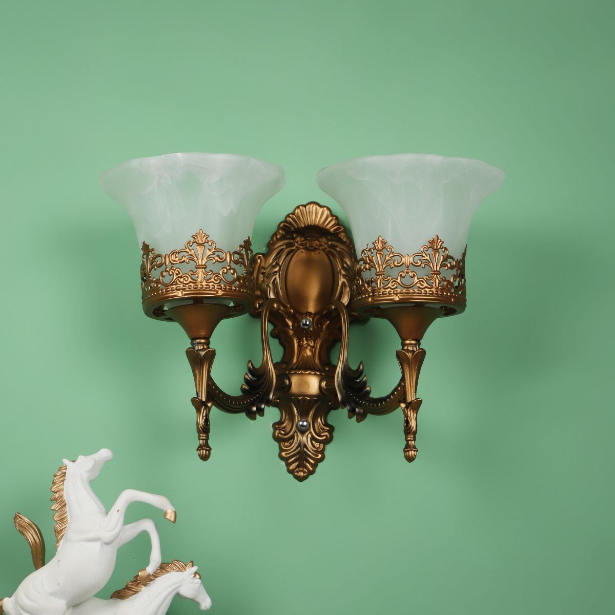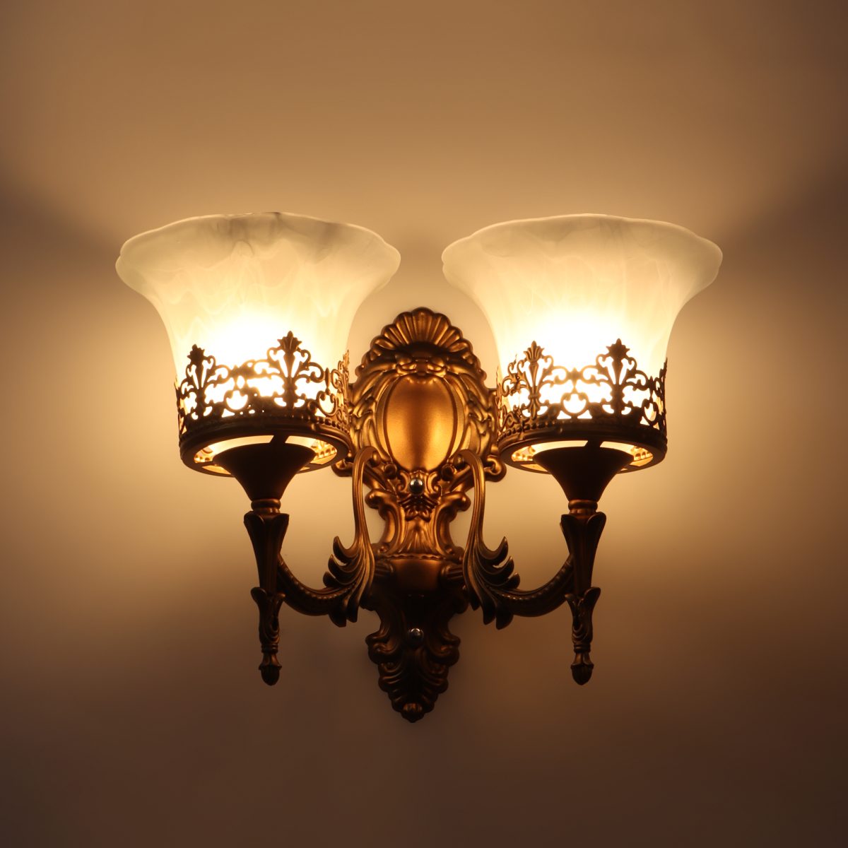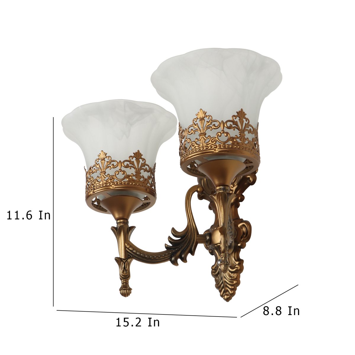Antique gold finish, double wall light having flower shaper self textured glass made of mild steel. It is maintenance free, easy to remove glass and wash them, comes with an E27 holder, only the change of lamp is required, which is available locally everywhere. Application includes both residential and commercial premises wherever it matches with your interiors. Matching hanging light code HL5060-1, HL5060-3. Matching single wall light code – WL2413. Matching chandelier code – CH397. Can be customized as per requirement in case of bulk quantities. Lamp not included.