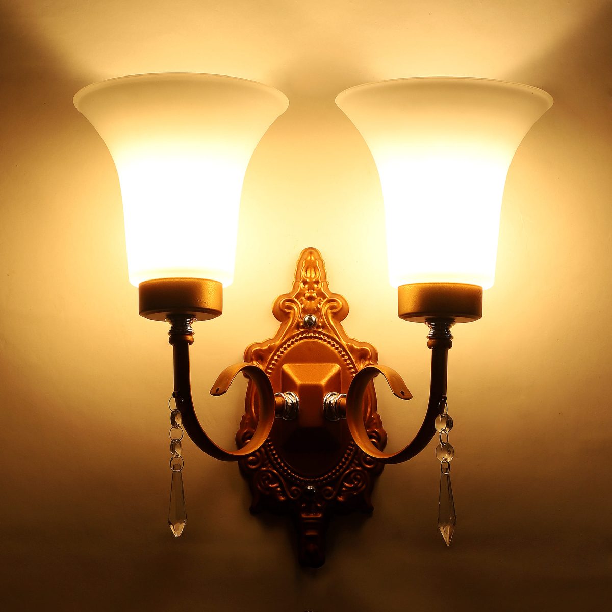 Antique brass finish double wall light having bell shaped white made of mild steel. It is maintenance free. It is easy to remove glass and wash them. Comes with an E27 holder, only the change of lamp is required, which is available locally everywhere. Application includes both residential and commercial premises wherever it matches with your interiors. Matching single wall light code -WL2445. Can be customized as per requirement in case of bulk quantities. Lamp not included.