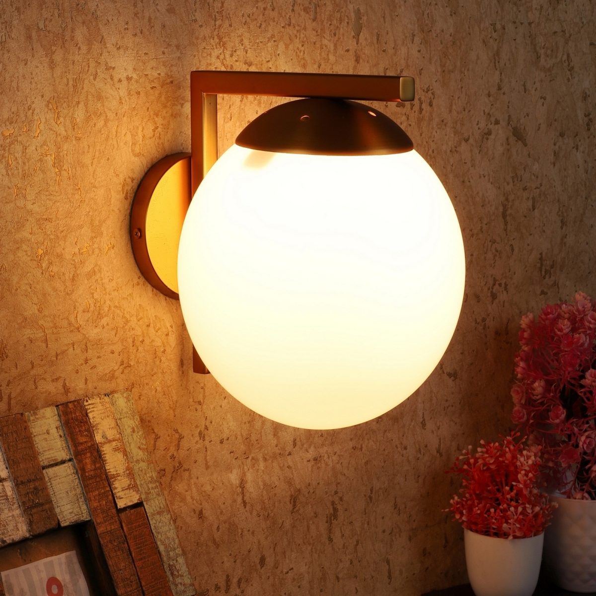 Antique gold finish single wall light made of mild steel, with white round globe (doom) glass. It is maintenance free, glass is closed from all the sides which prevents accumulation of dust, easy to remove glass and wash it, comes with an E27 holder, only the change of lamp is required, which is available locally everywhere. You can of course swap out the bulb for one that is dimmable, has a higher light output or a different color temperature. Application includes both residential and commercial premises wherever it matches with your interiors. It is one of the best selling product in our catalogue. Can be customised as per requirement in case of bulk quantities. LAMP NOT INCLUDED.