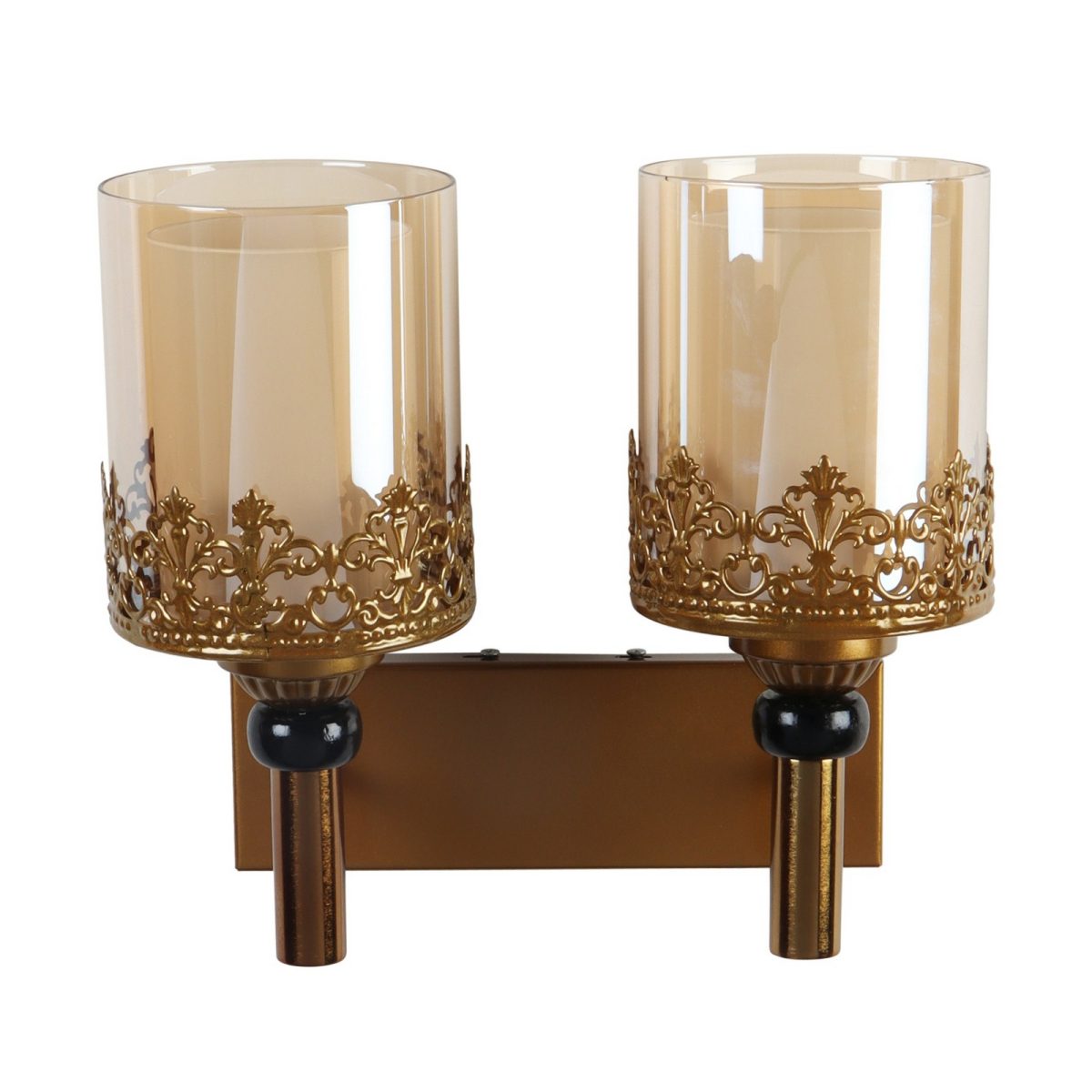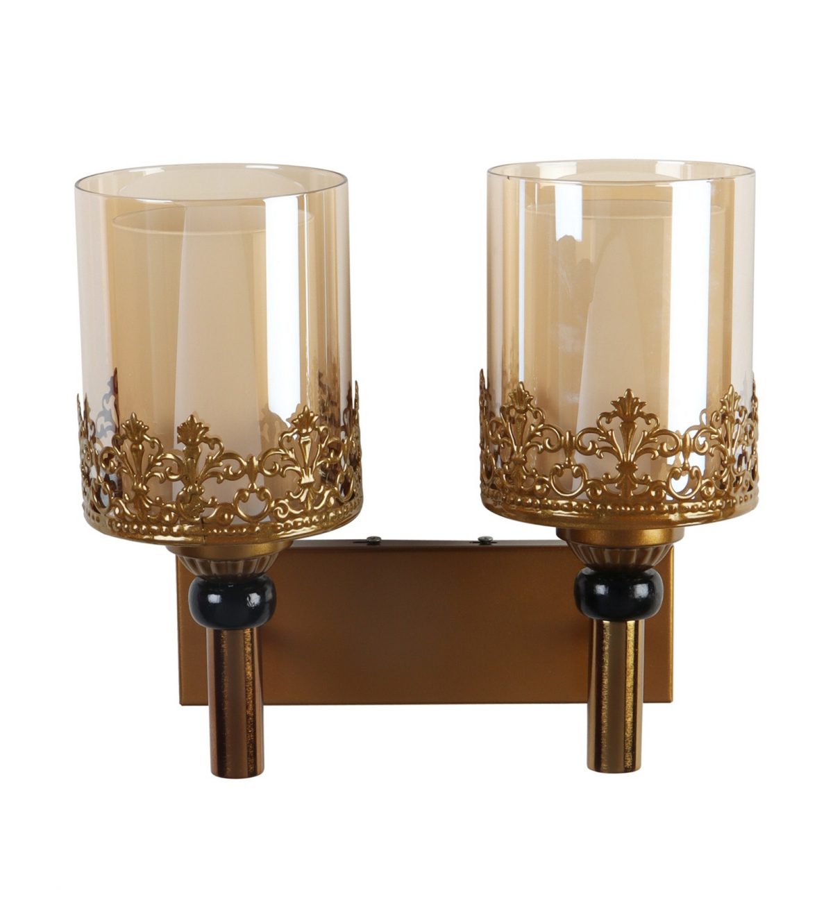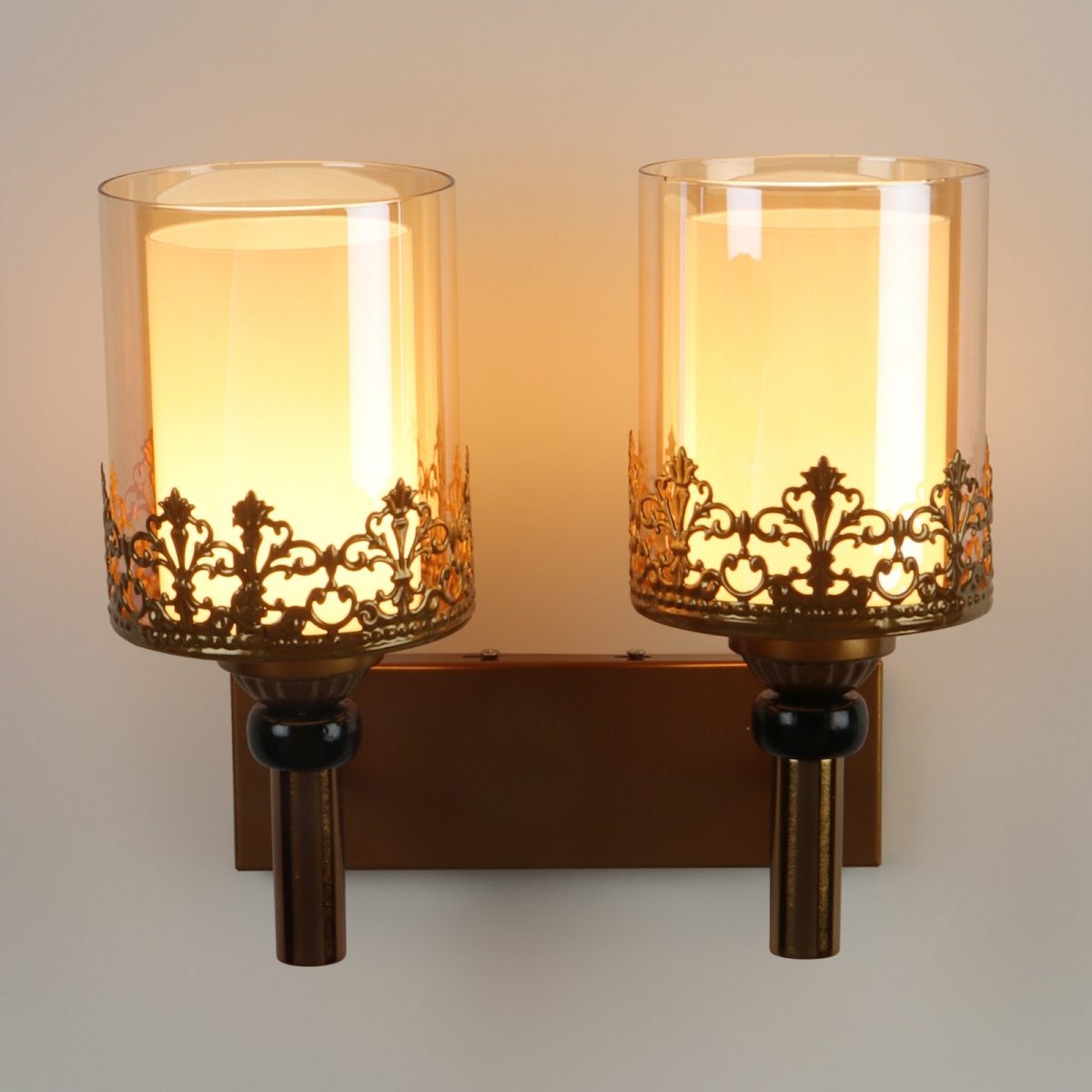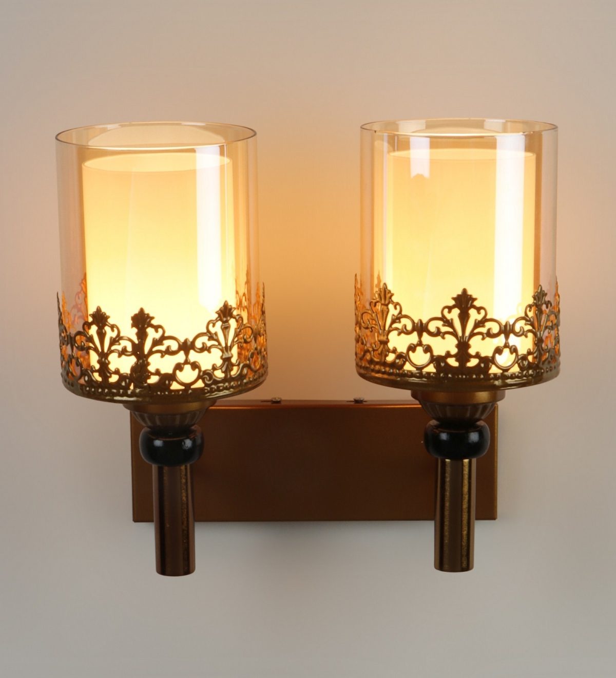 Antique gold finish double wall light having round, cylindrical two layered champaign coloured glass. It is maintenance free, easy to remove glasses and wash them, comes with an E27 holder, only the change of lamp is required, which is available locally everywhere. Application includes both residential and commercial premises wherever it matches with your interiors. Matching single wall light code – WL2695. Can be customized as per requirement in case of bulk quantity, LAMP NOT INCLUDED.