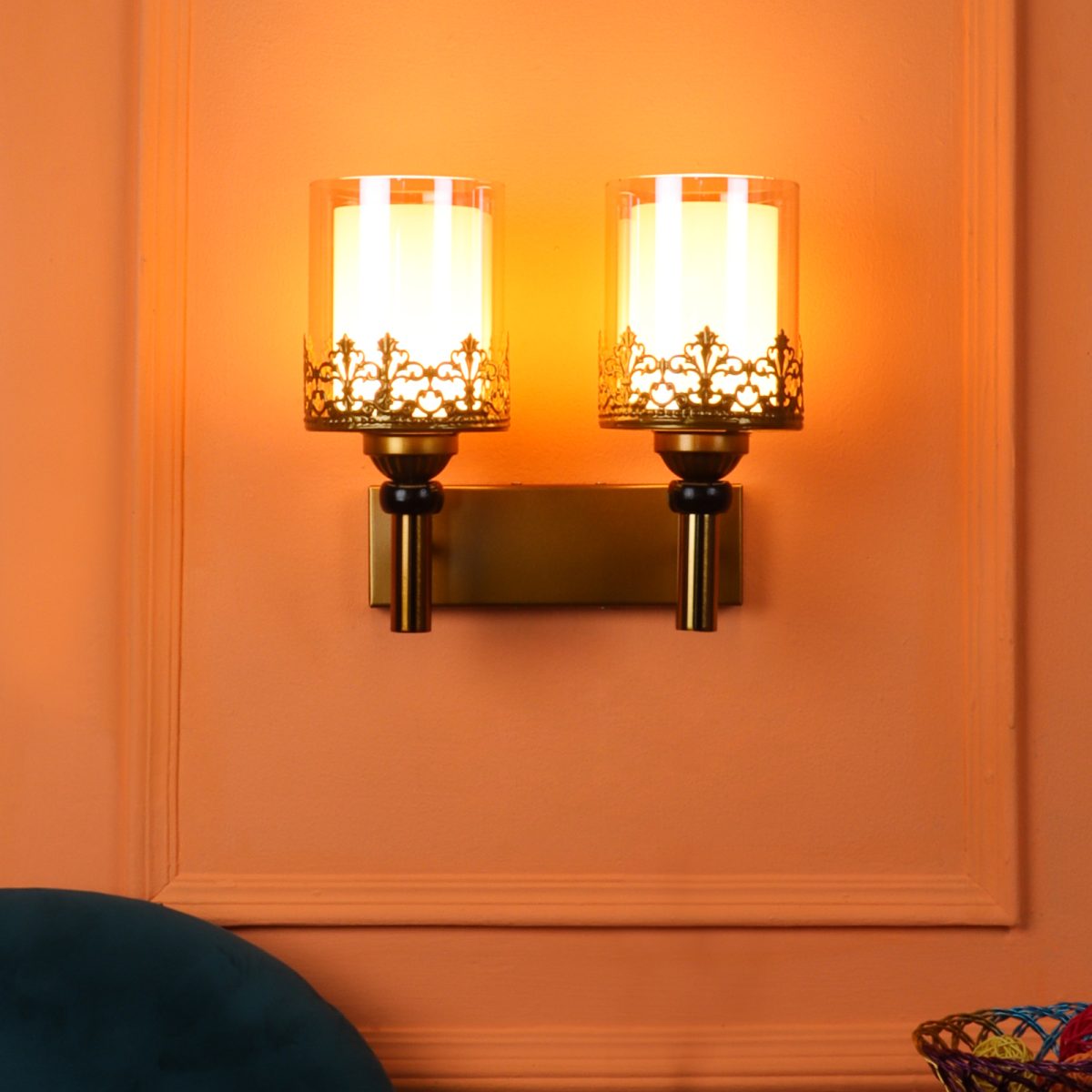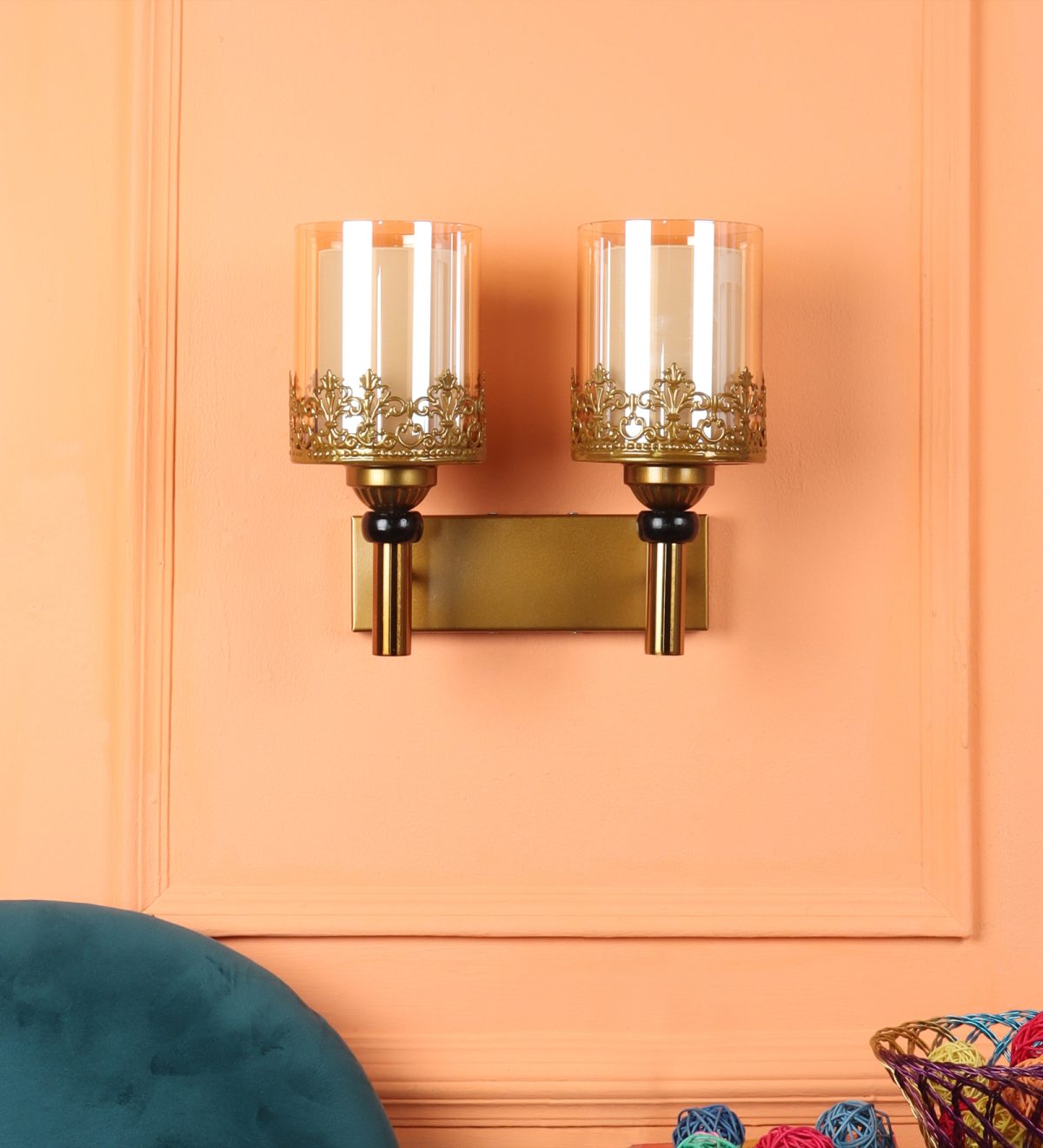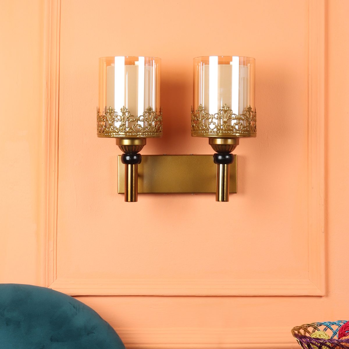 Antique gold finish double wall light having round, cylindrical two layered champaign coloured glass. It is maintenance free, easy to remove glasses and wash them, comes with an E27 holder, only the change of lamp is required, which is available locally everywhere. Application includes both residential and commercial premises wherever it matches with your interiors. Matching single wall light code – WL2695. Can be customized as per requirement in case of bulk quantity, LAMP NOT INCLUDED.